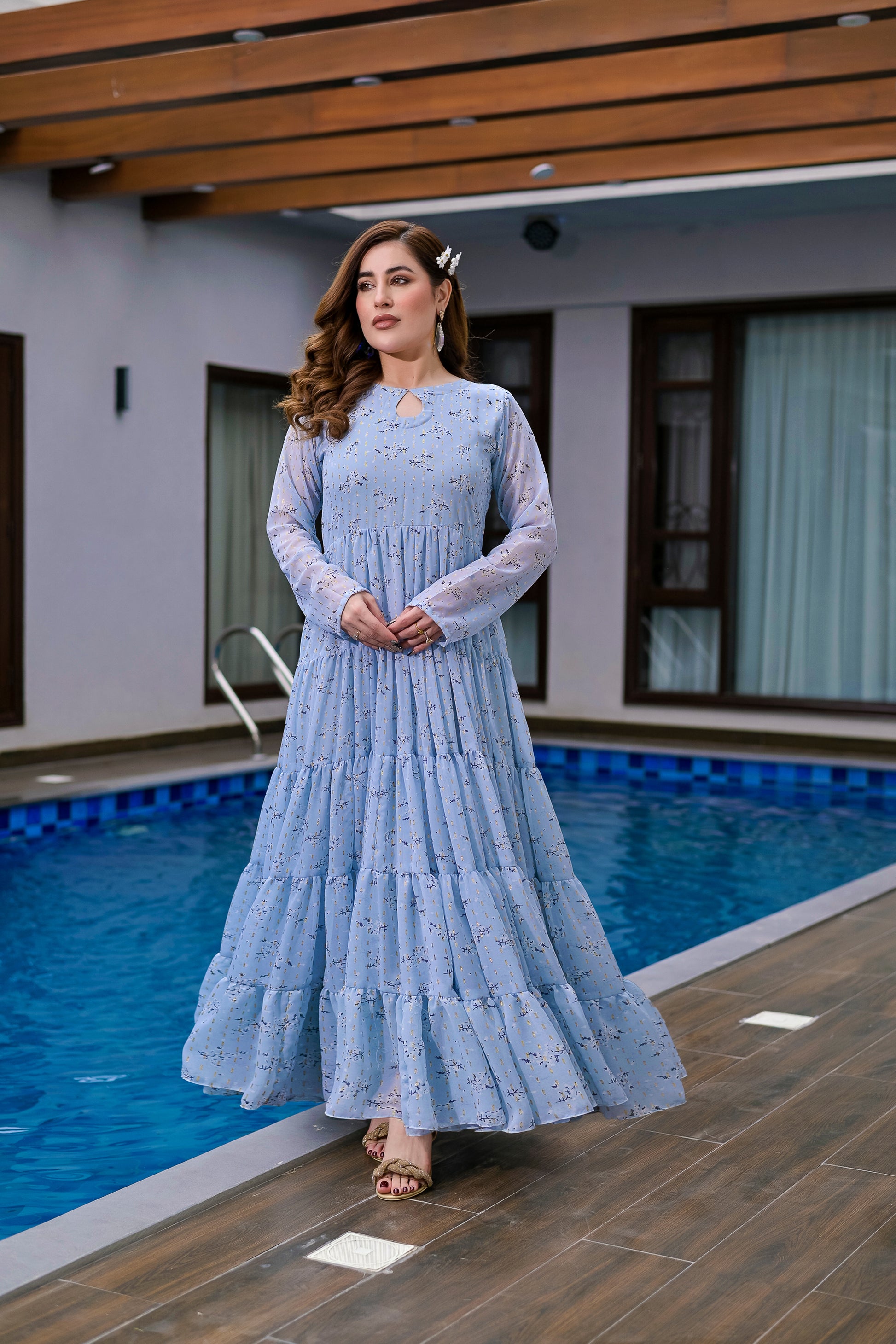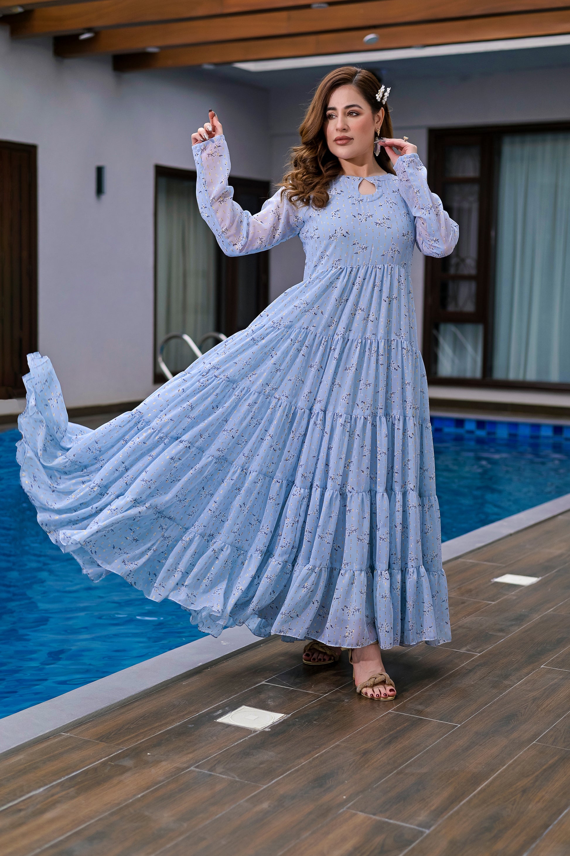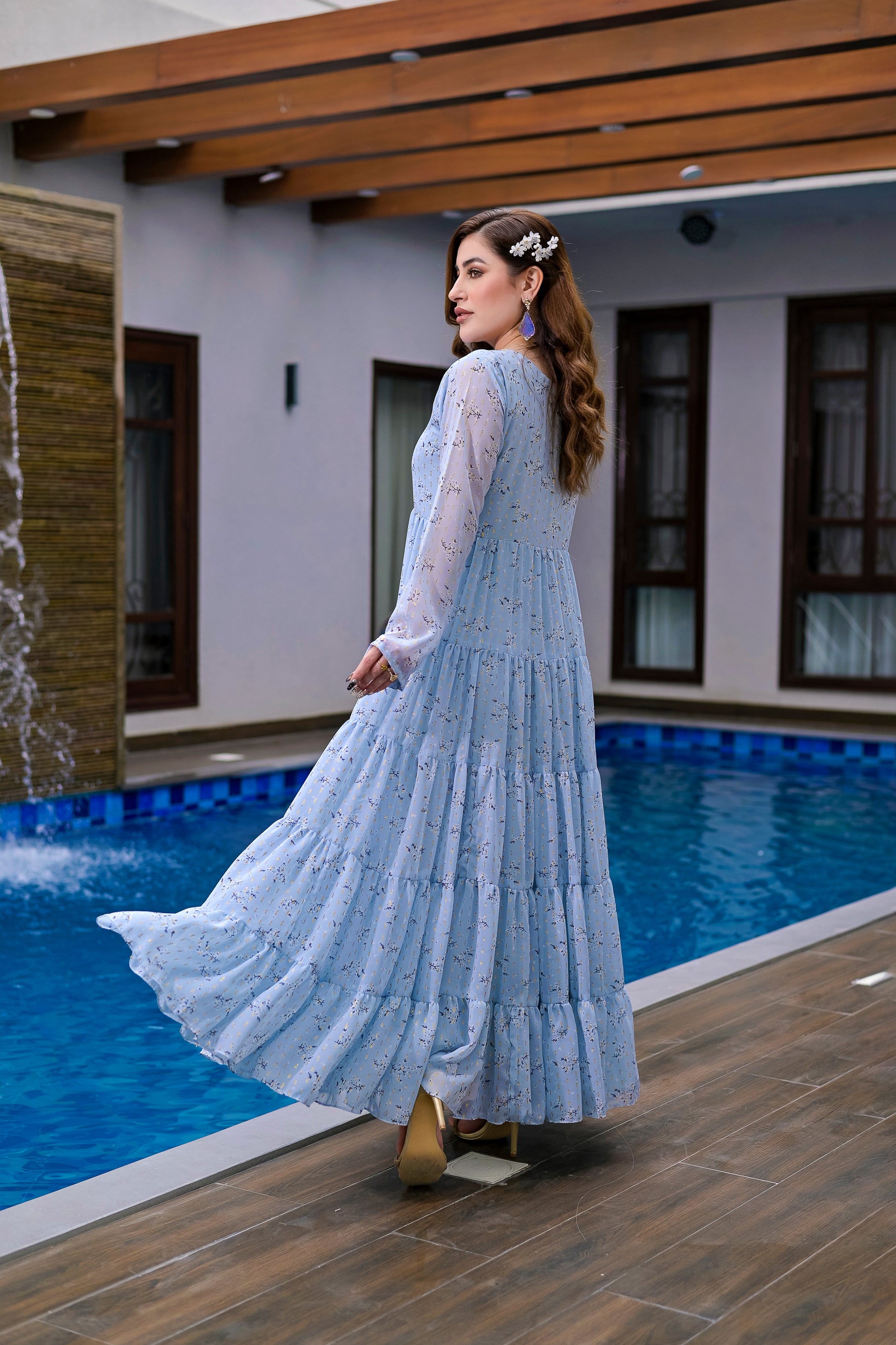 A serene blue chiffon maxi crafted to embody grace and purity. The layered flow creates movement with every step, while the soft hue enhances its dreamy vibe. Azurine is a versatile piece, equally perfect for day occasions and romantic evening outings.