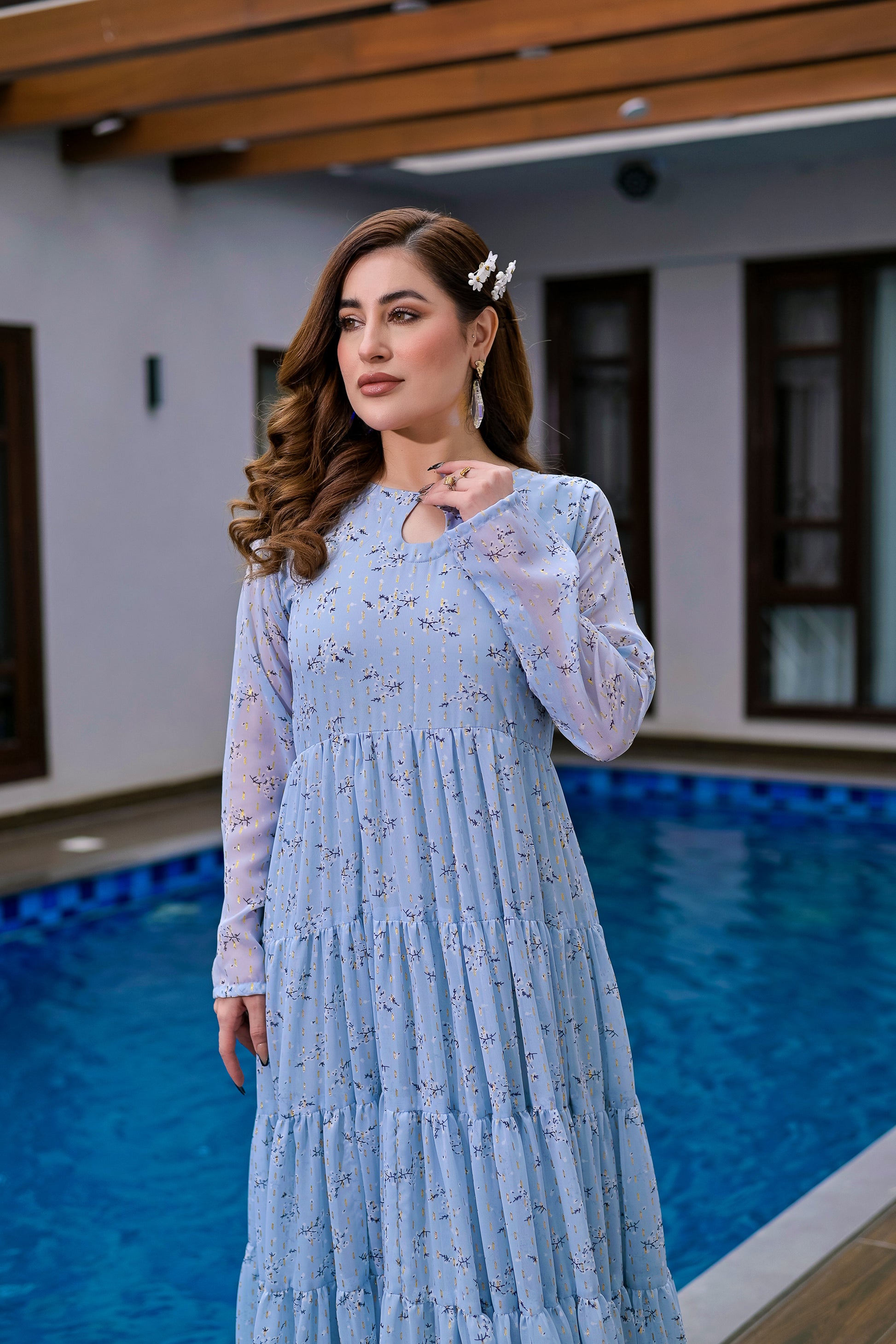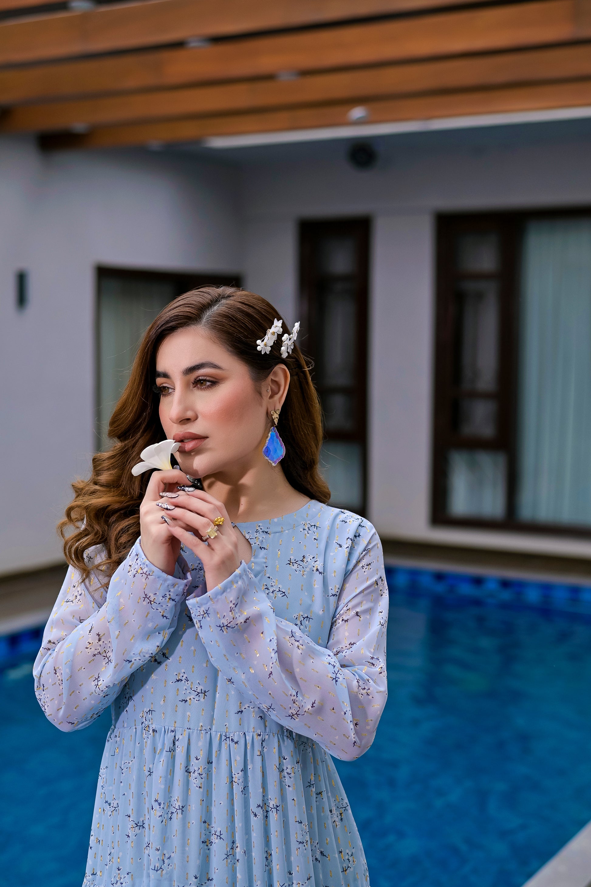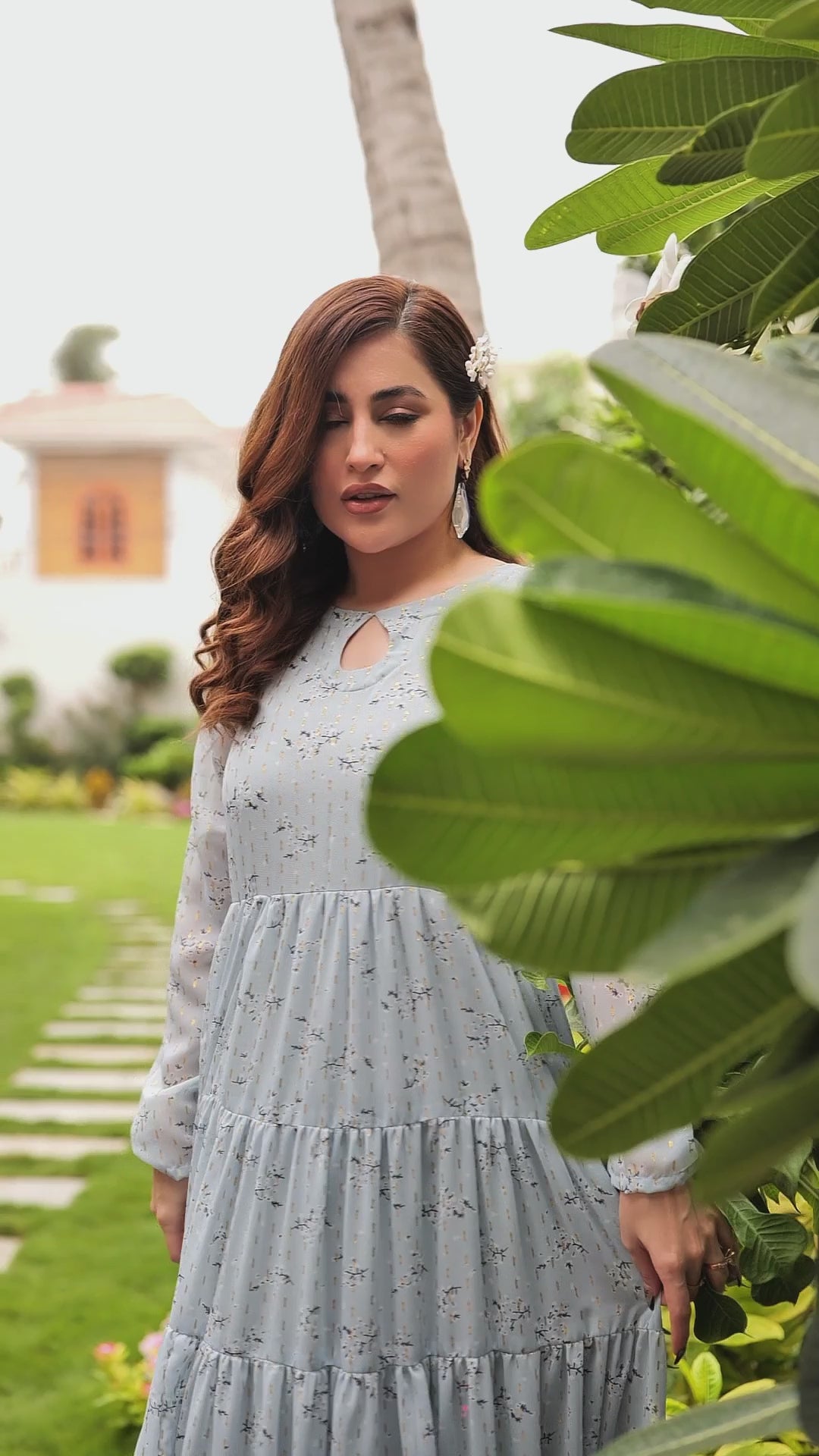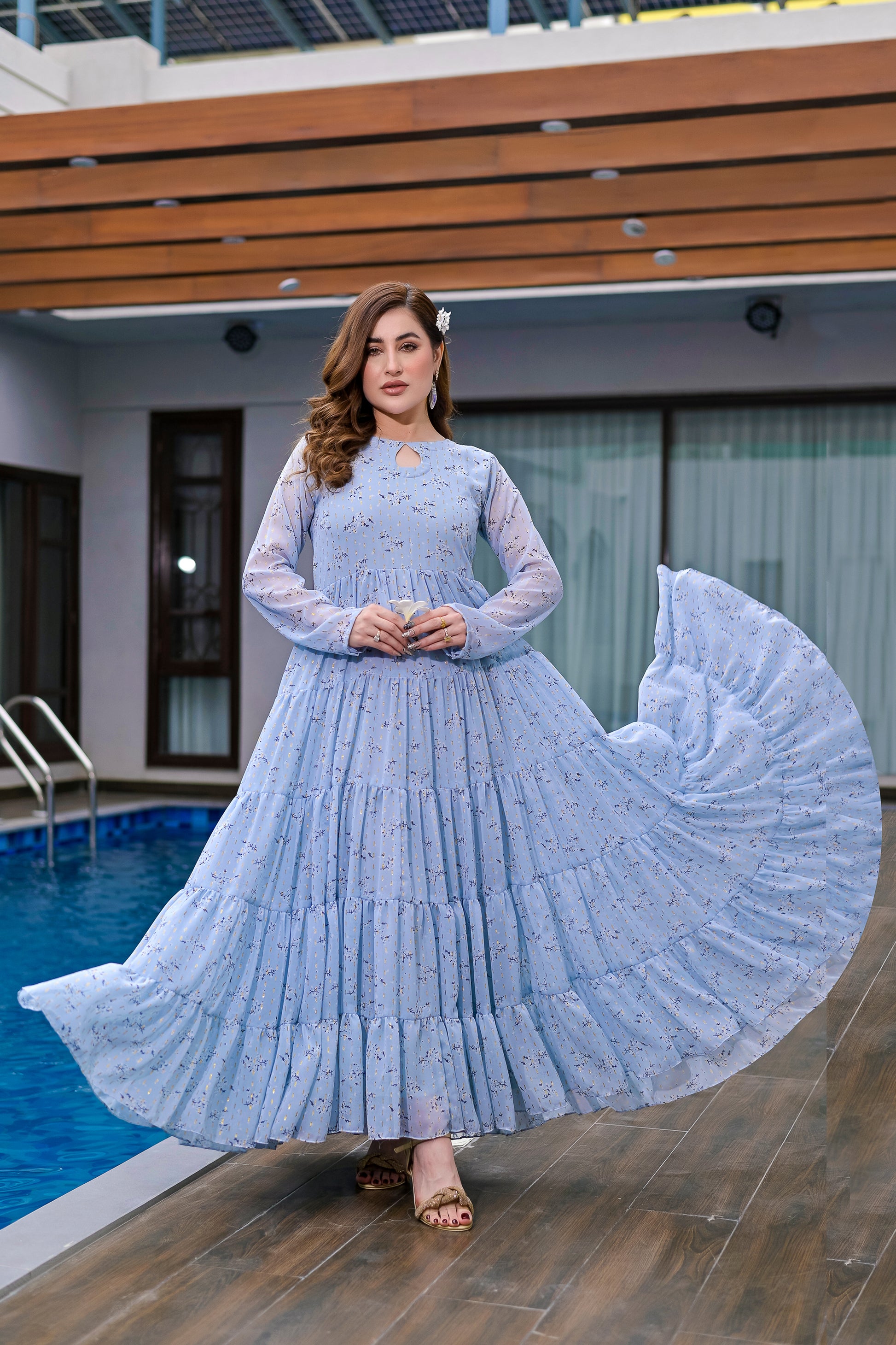 A serene blue chiffon maxi crafted to embody grace and purity. The layered flow creates movement with every step, while the soft hue enhances its dreamy vibe. Azurine is a versatile piece, equally perfect for day occasions and romantic evening outings.
