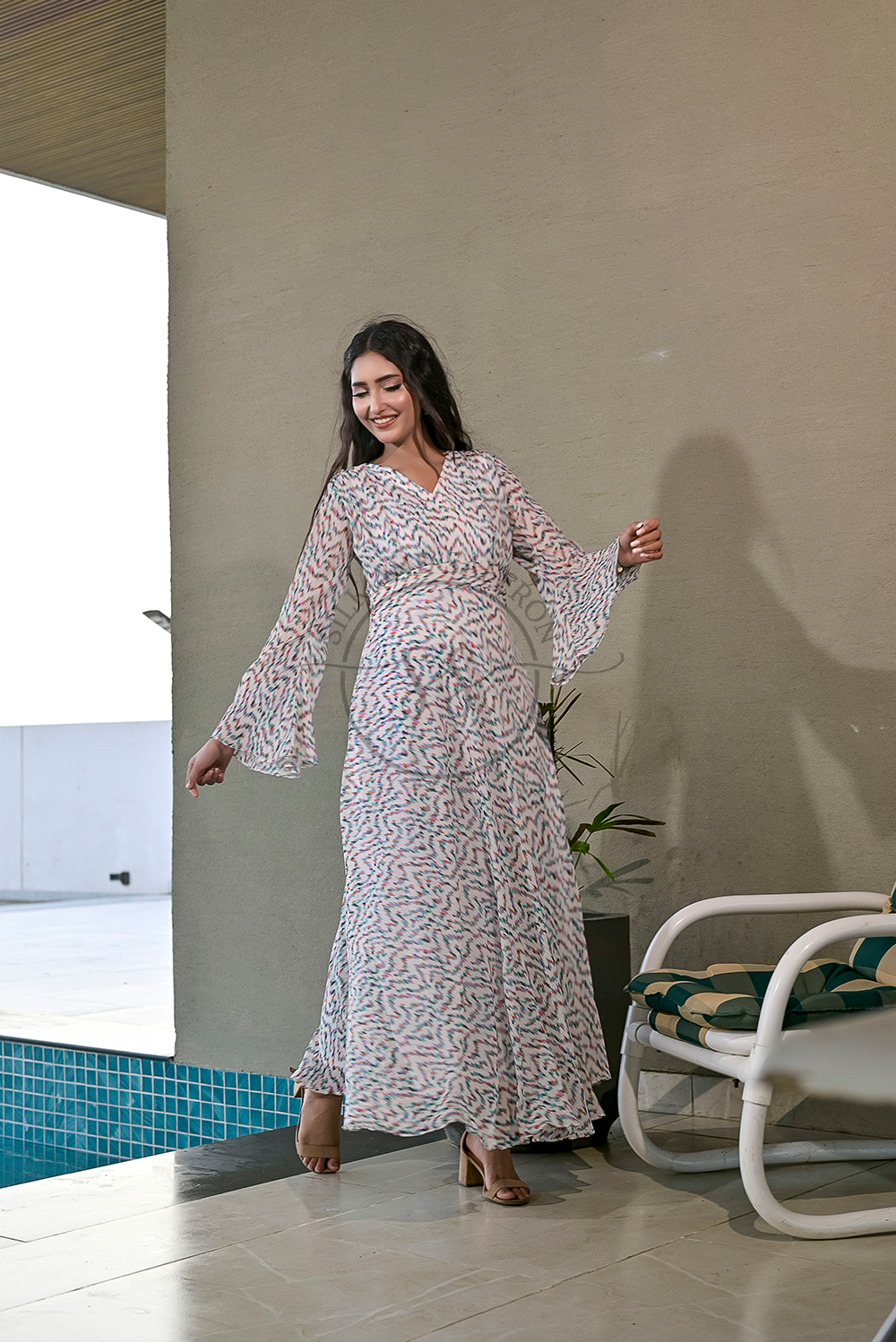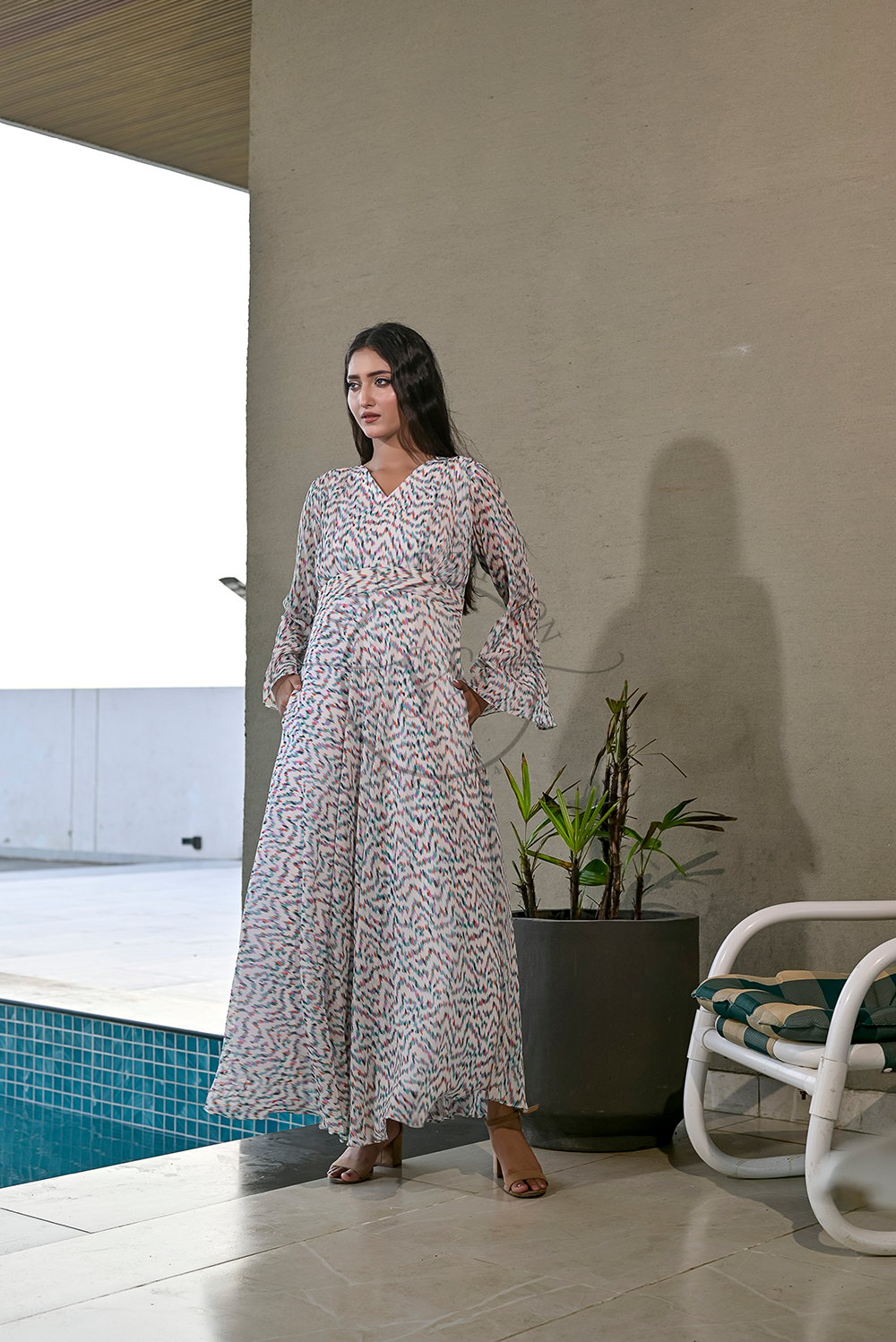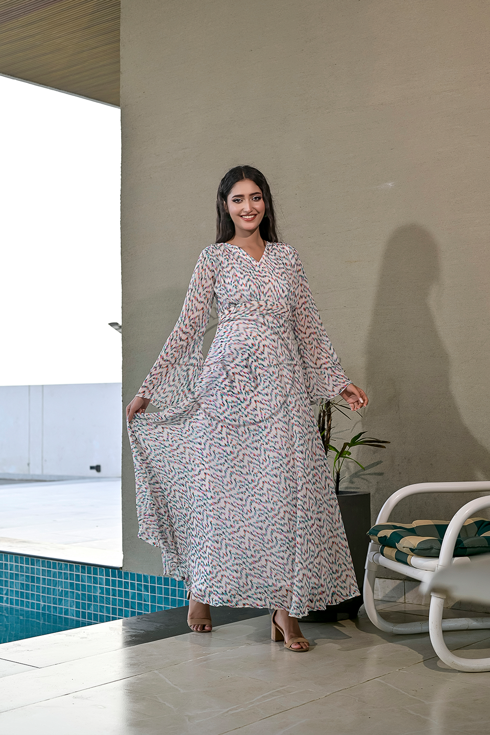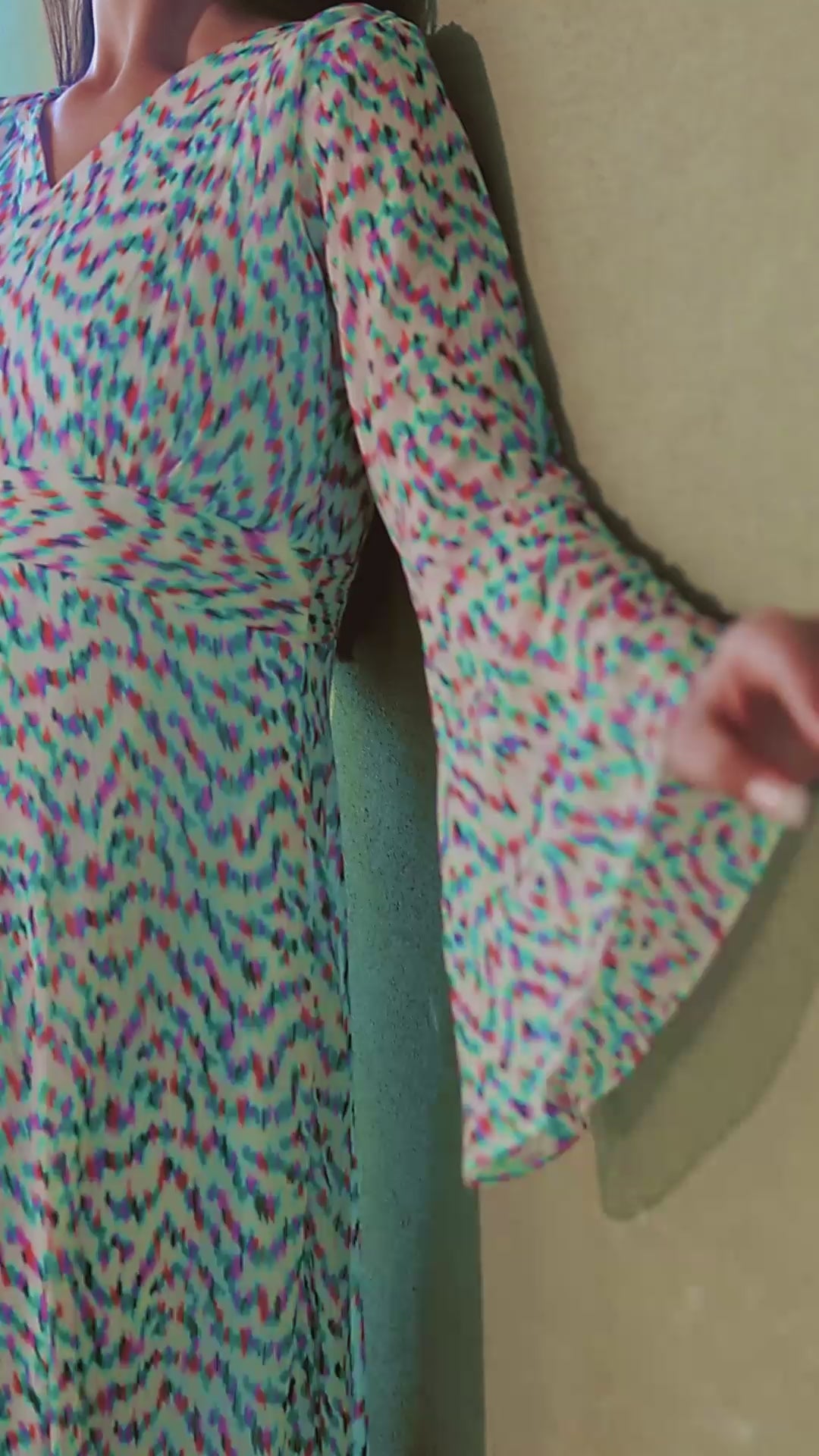 Design: A breezy V-neck maxi dress adorned with a multicolored brushstroke-inspired print, evoking the charm of hand-painted art on a soft ivory canvas.