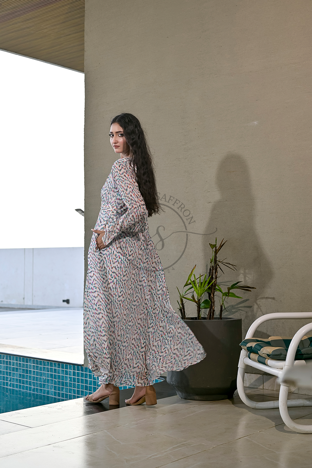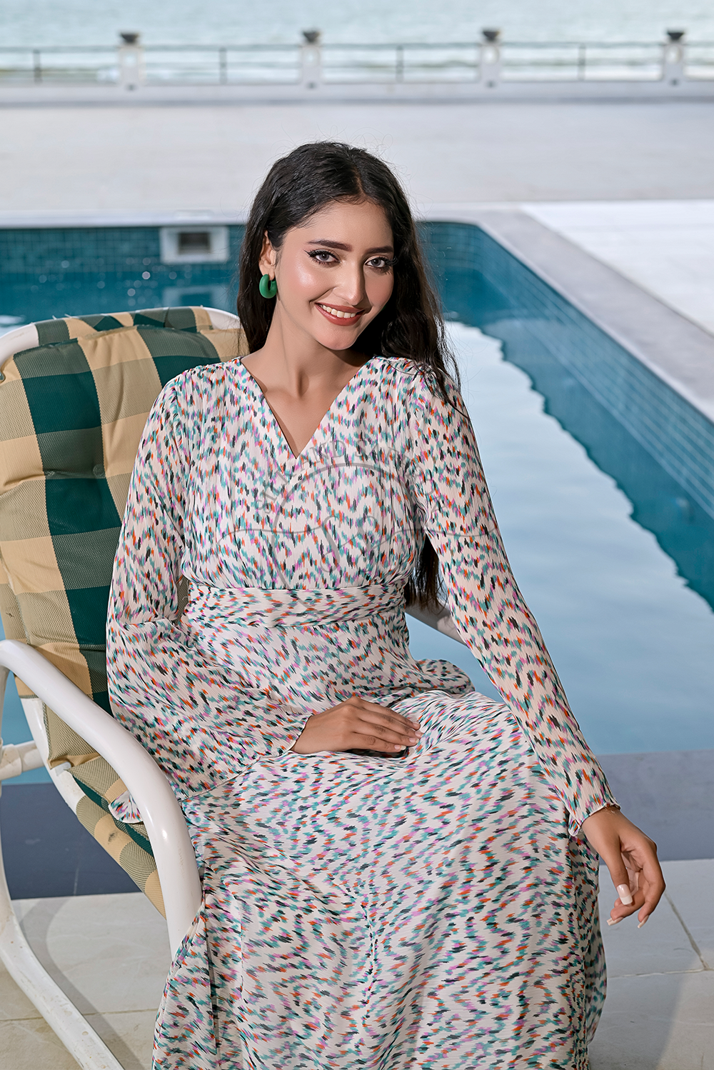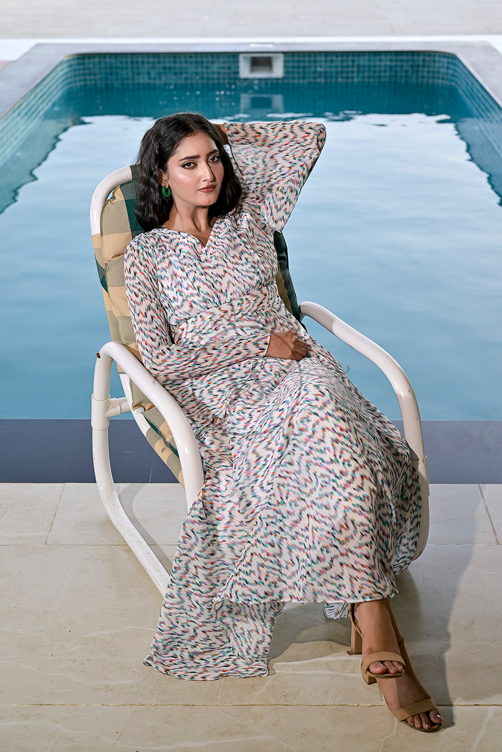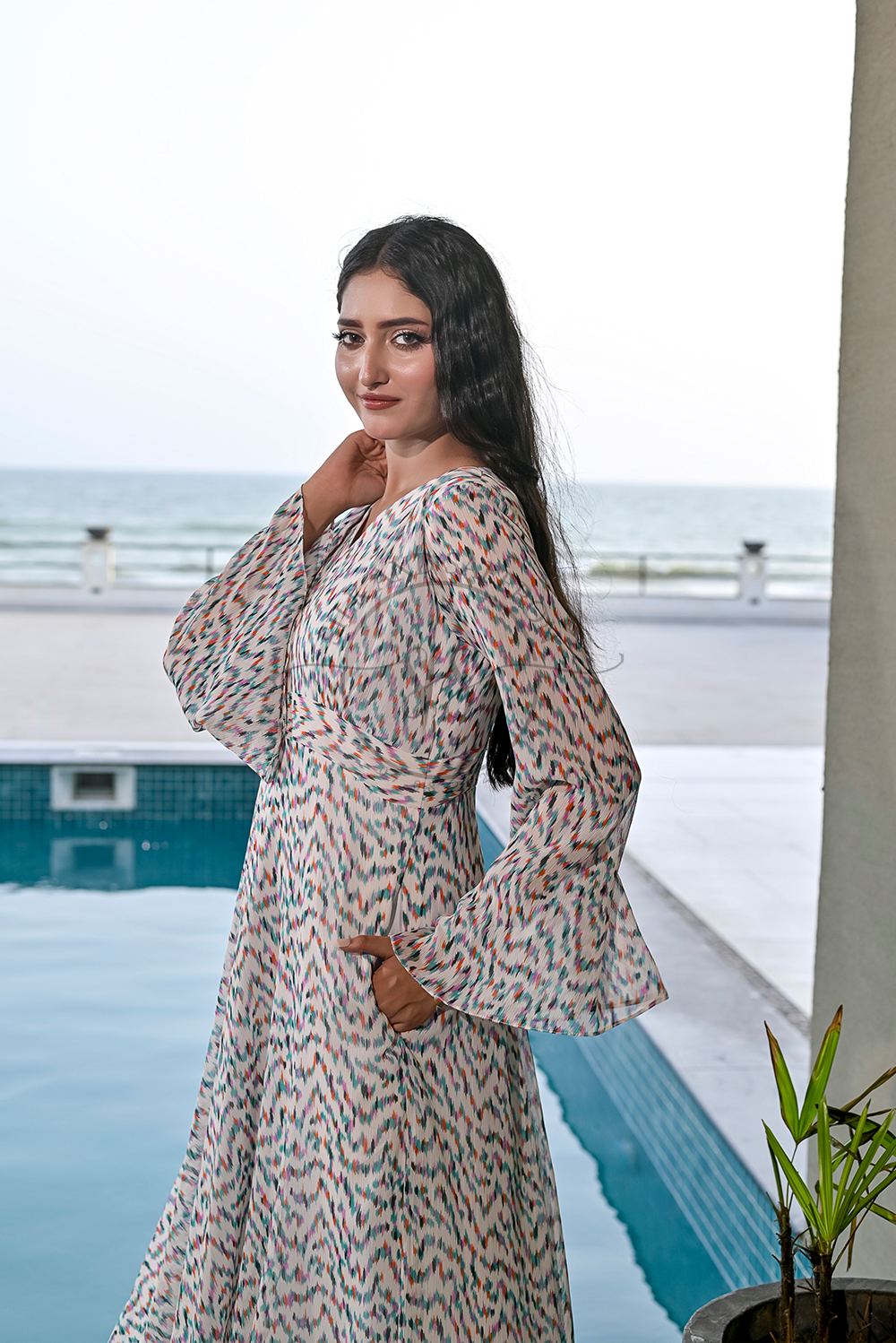 Design: A breezy V-neck maxi dress adorned with a multicolored brushstroke-inspired print, evoking the charm of hand-painted art on a soft ivory canvas.
