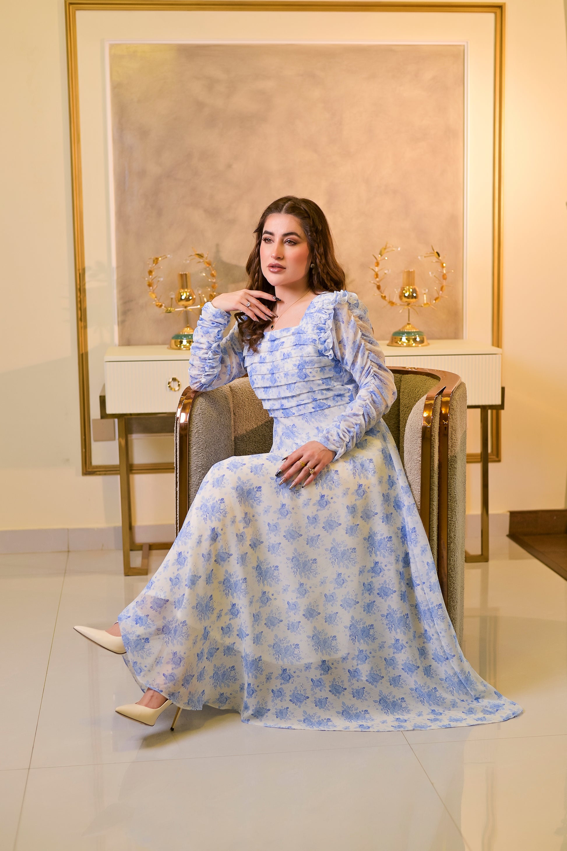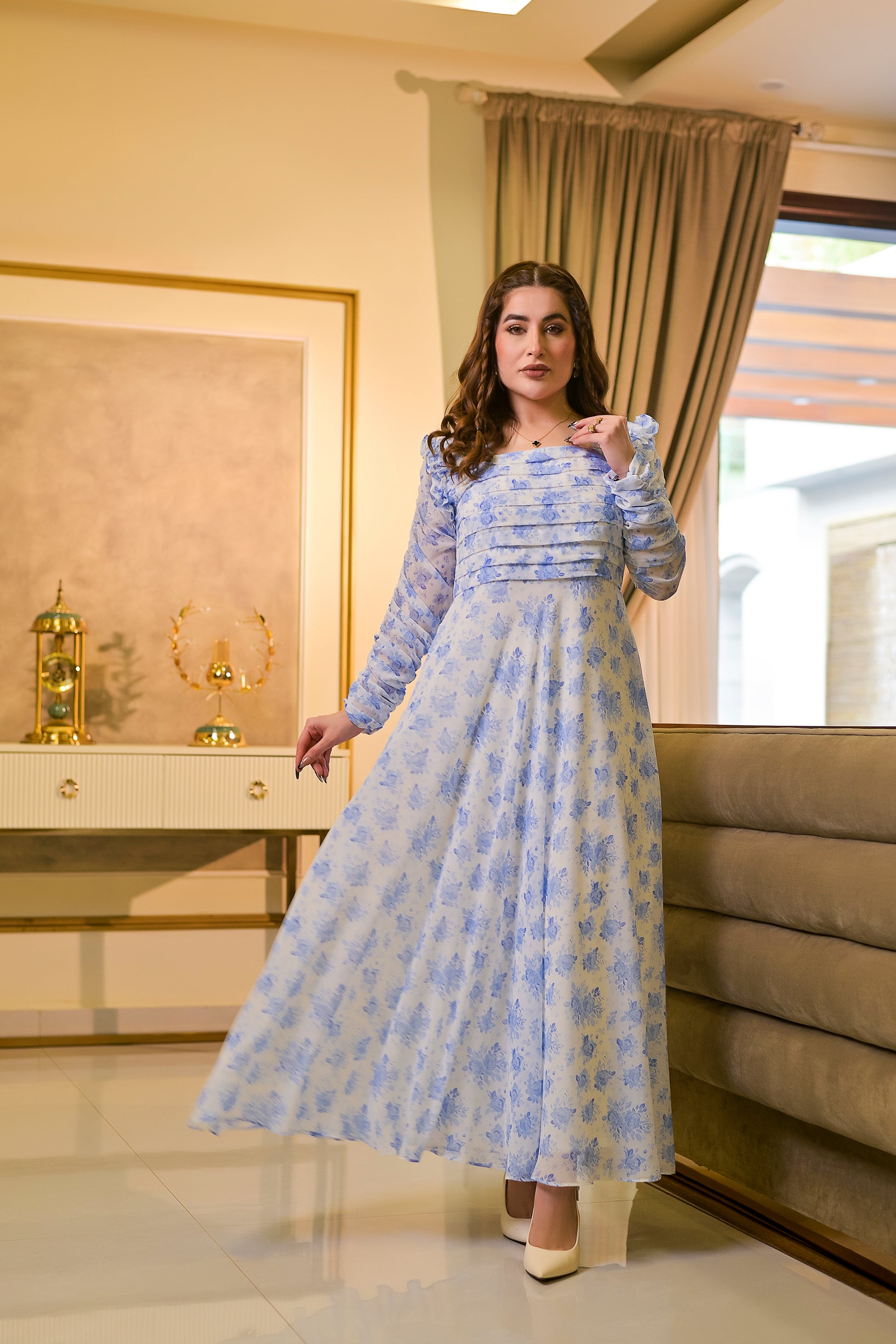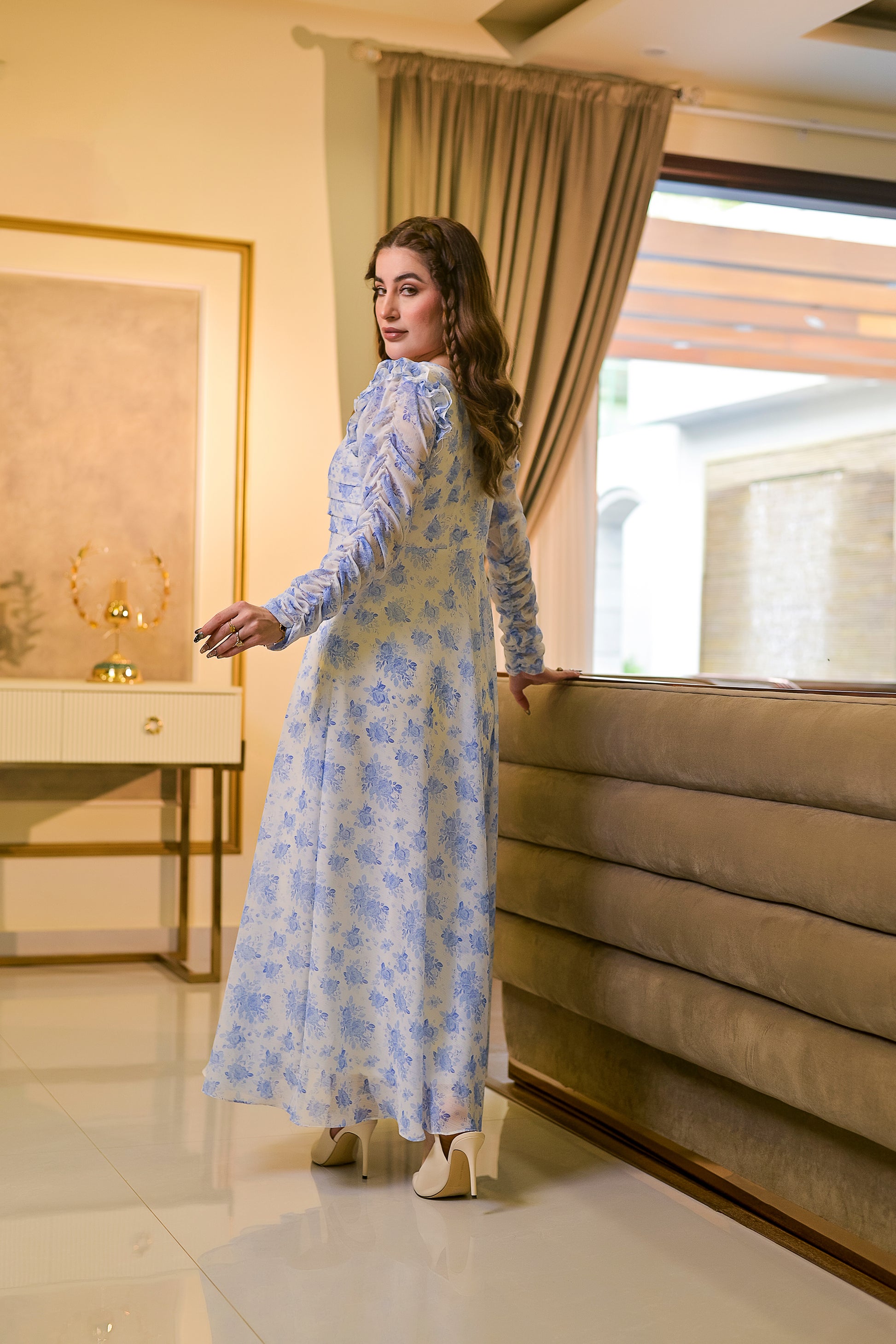 Soft as a breeze, this chiffon maxi is crafted in a cloud-like cream base with dainty floral detailing. The flowy cut gives it an angelic charm, while the long sleeves balance modesty with elegance. Whether it’s a summer lunch or a festive gathering, Cloud Lily carries a serene and graceful aura.
