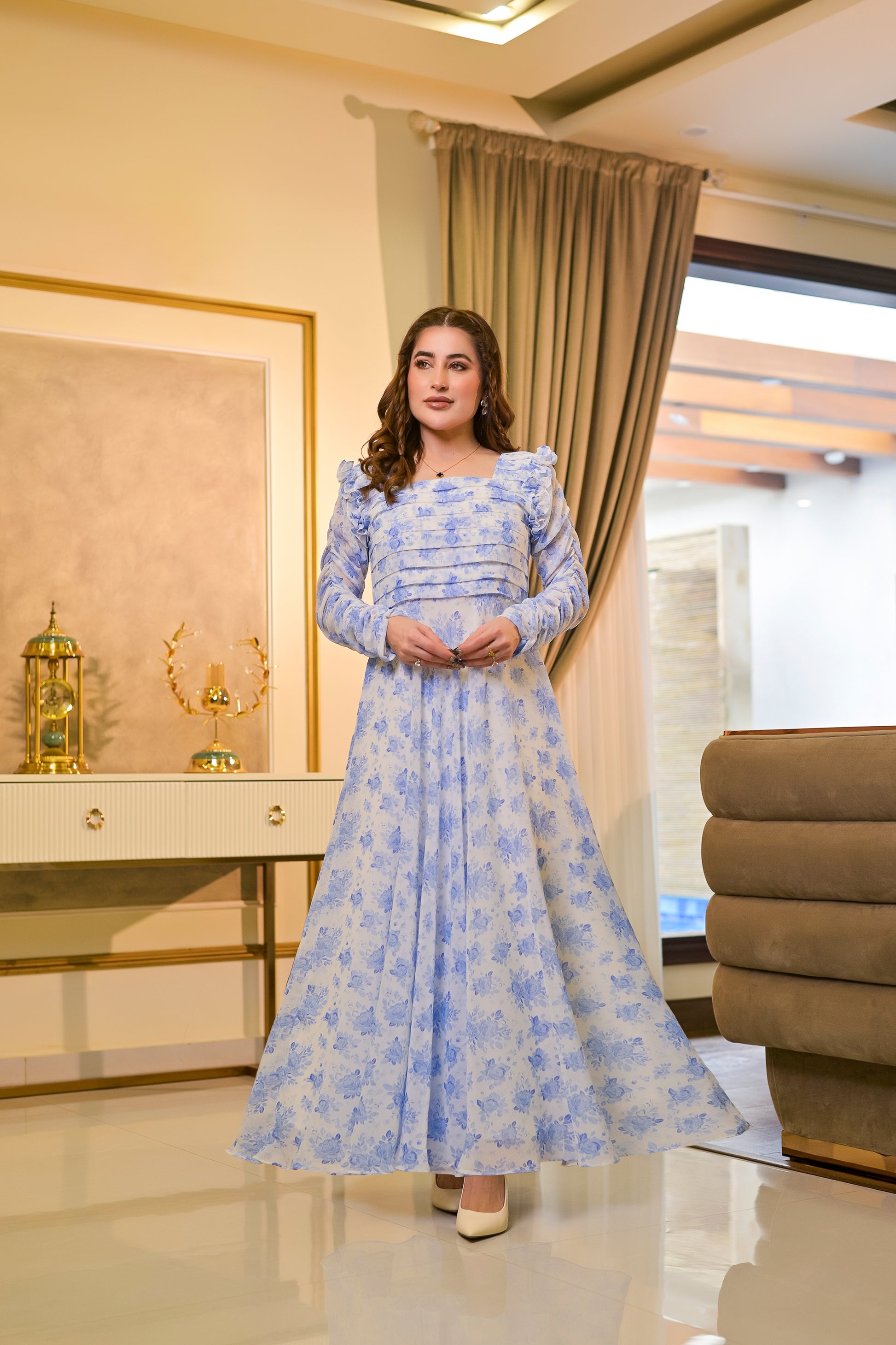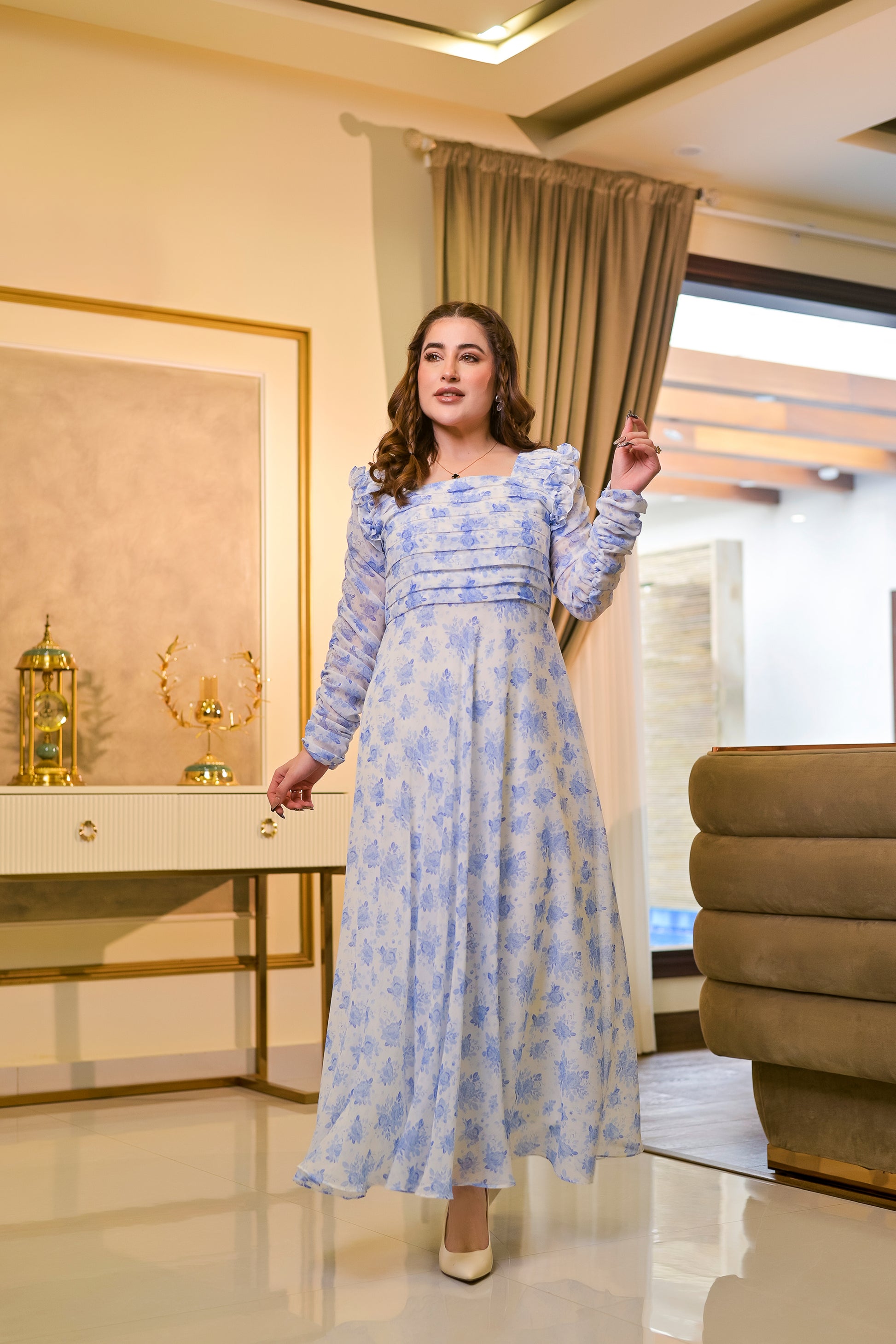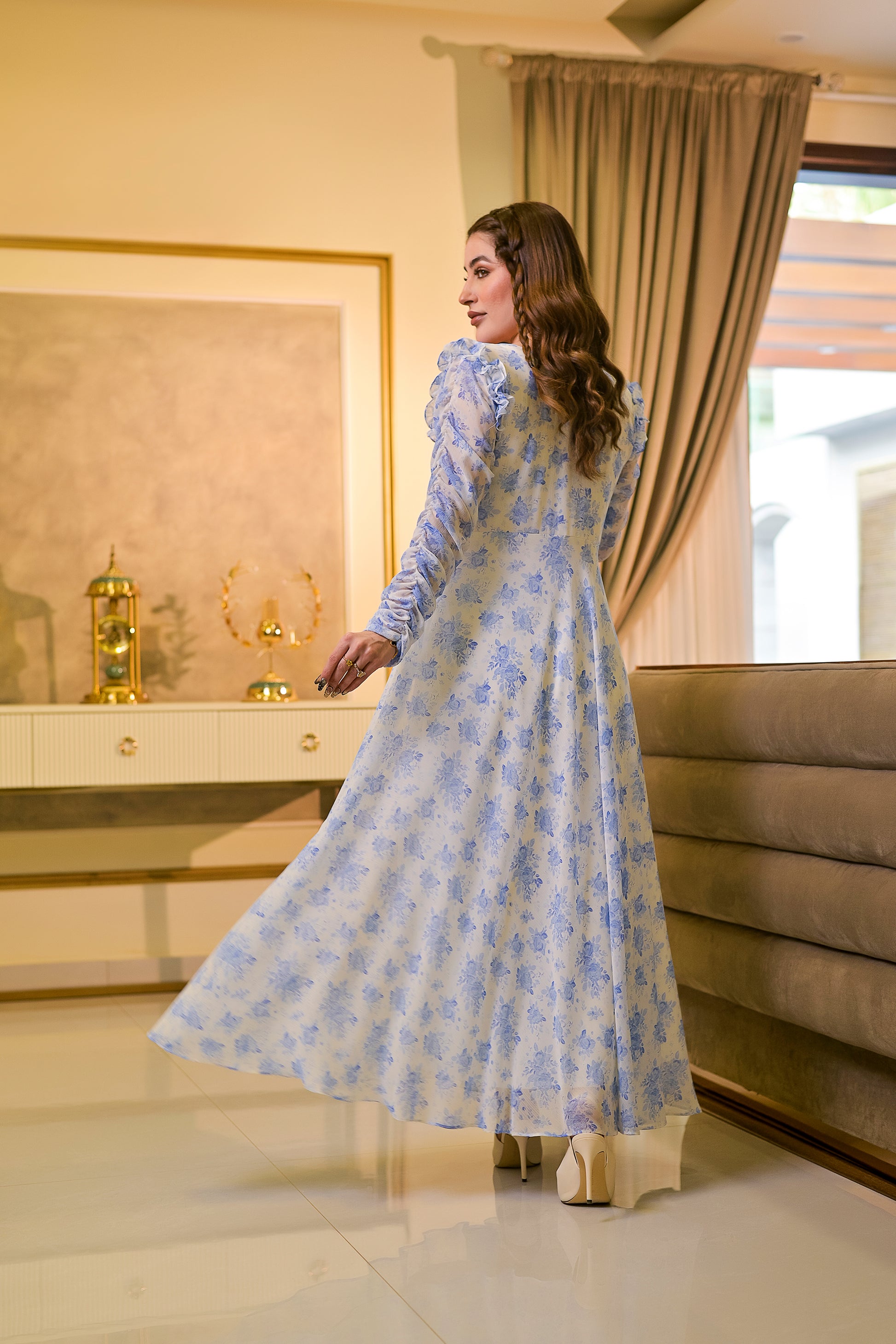 Soft as a breeze, this chiffon maxi is crafted in a cloud-like cream base with dainty floral detailing. The flowy cut gives it an angelic charm, while the long sleeves balance modesty with elegance. Whether it’s a summer lunch or a festive gathering, Cloud Lily carries a serene and graceful aura.