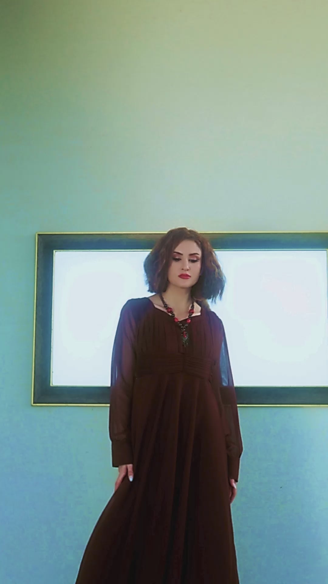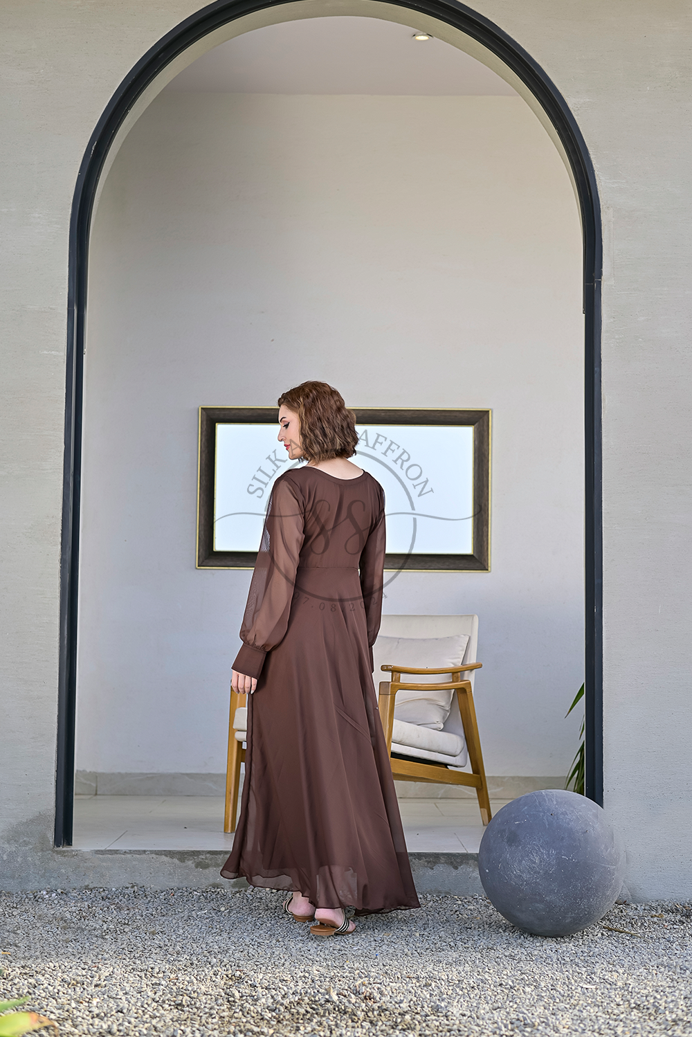 Design: A gracefully flowing maxi dress in a rich brown hue, designed with a classic V-neckline and a subtly cinched waist that transitions into a voluminous, ethereal skirt.