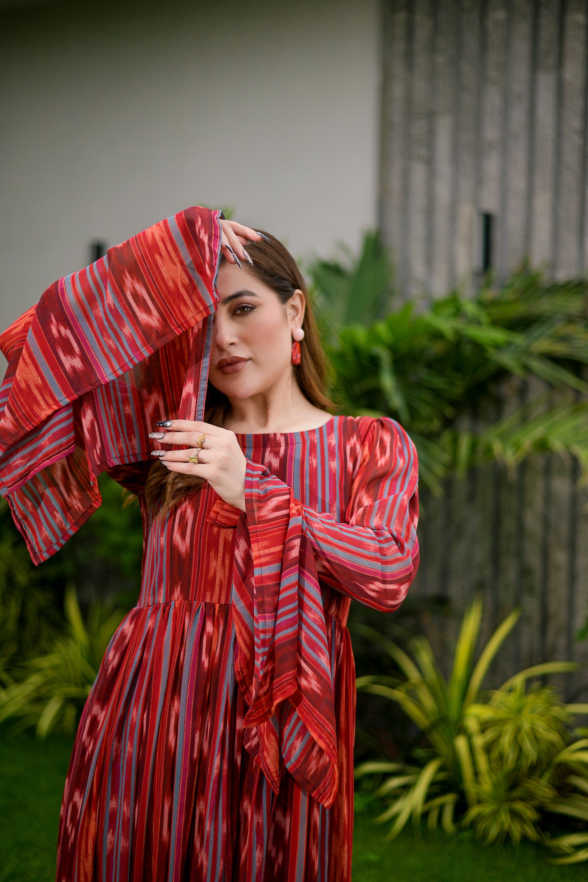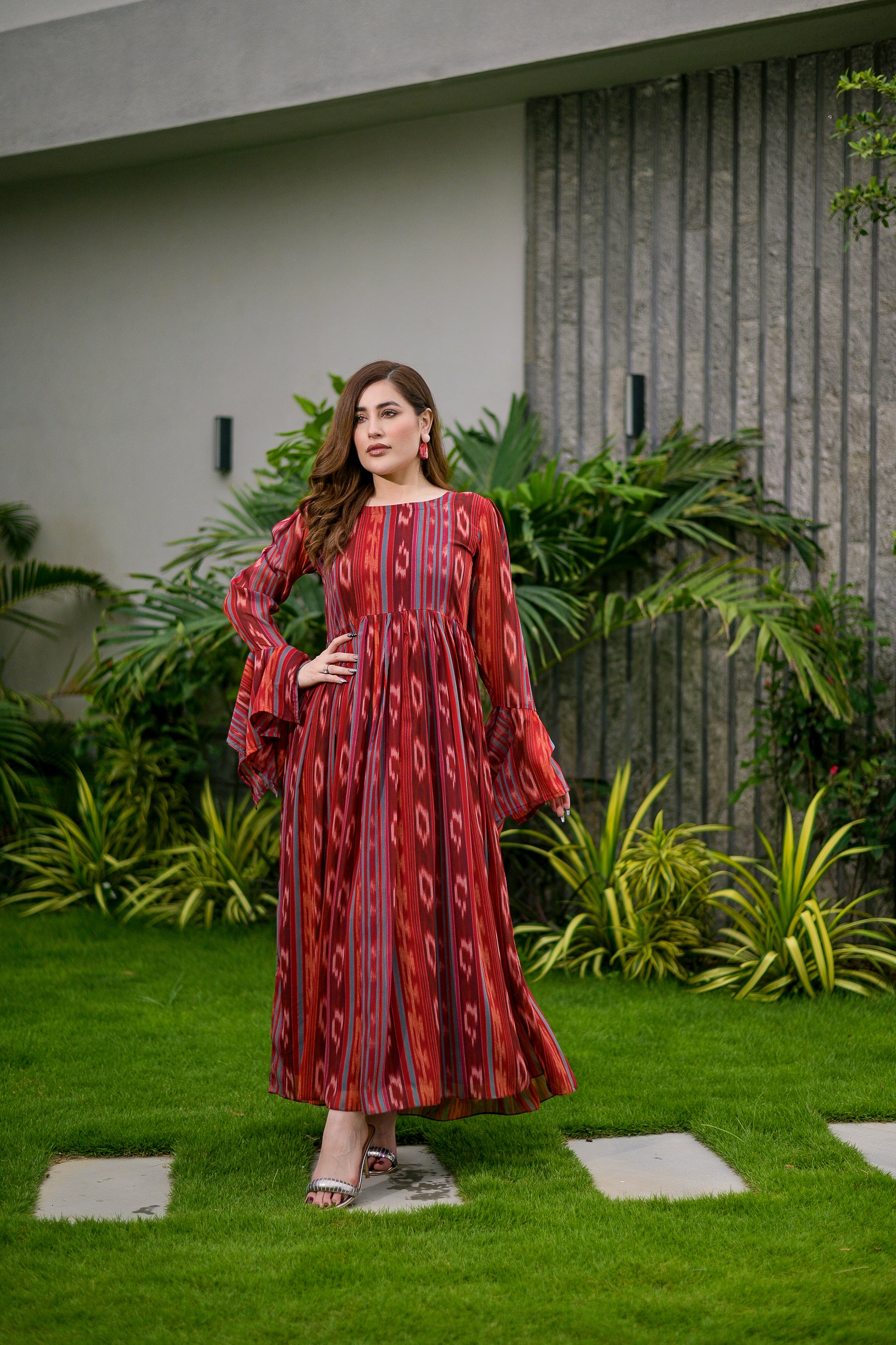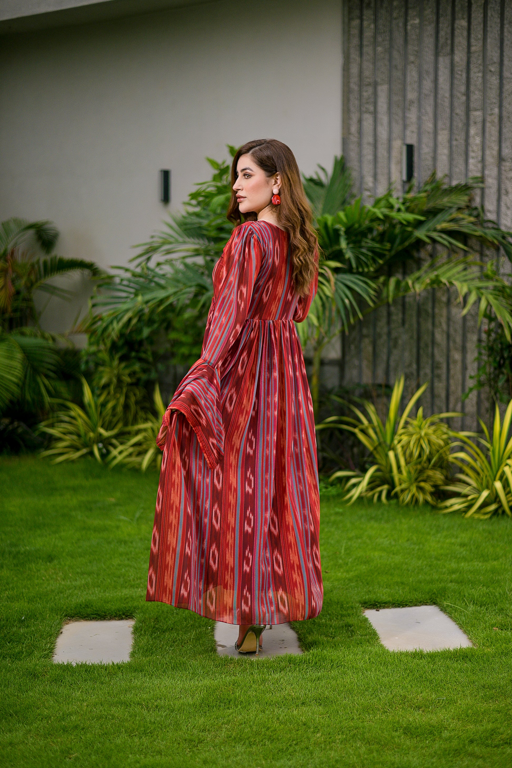 Bold and fiery, this red chiffon maxi with linear ethnic-inspired prints makes a striking statement. The bell sleeves add drama, while the flowing structure balances it with elegance. Ember Waves is made for festive nights, wedding functions, or evenings when you want all eyes on you.