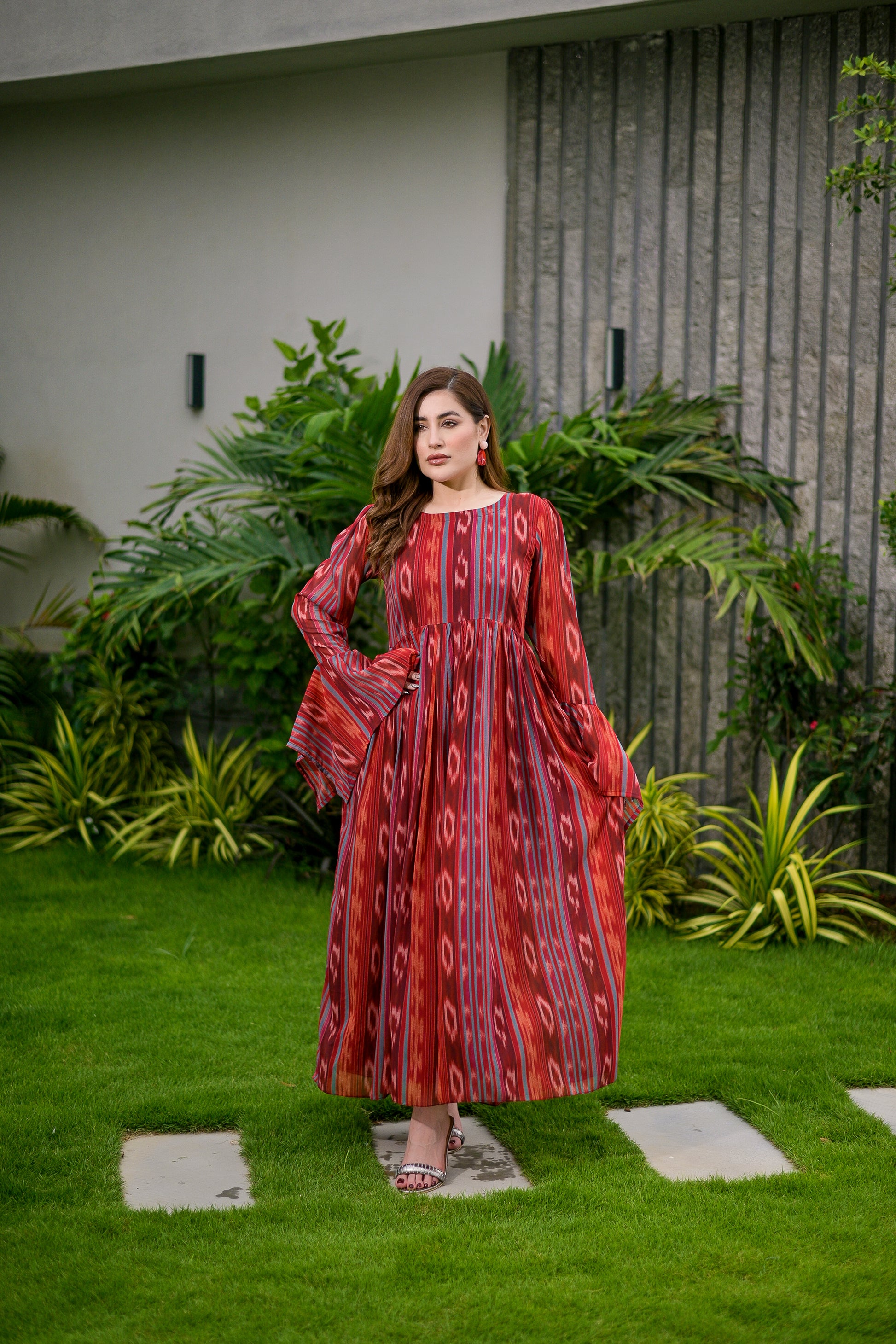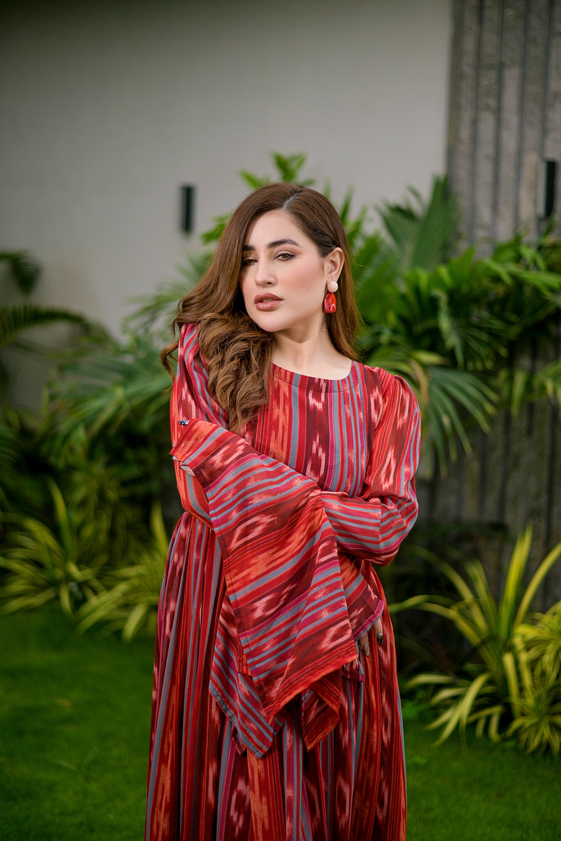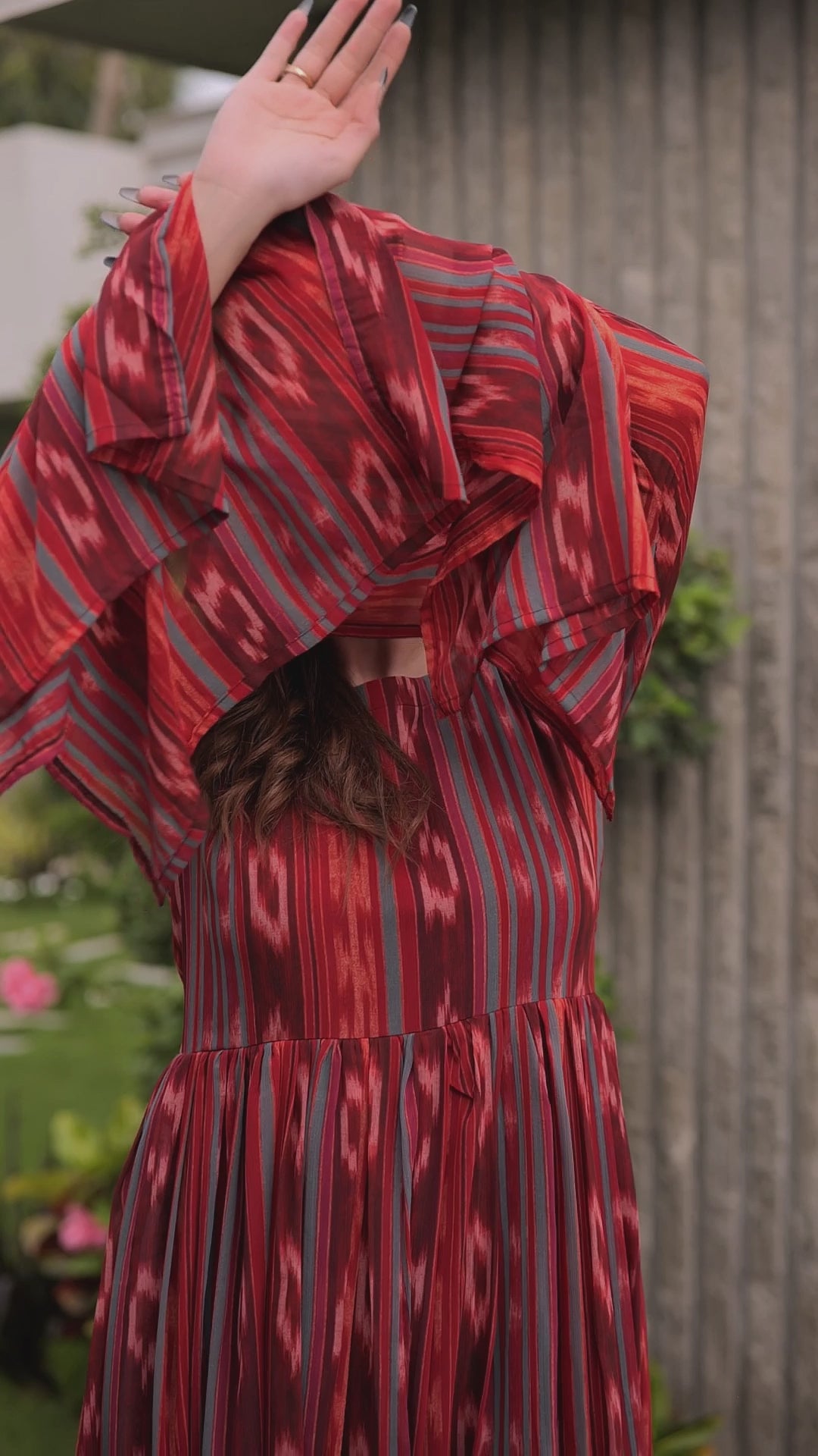 Bold and fiery, this red chiffon maxi with linear ethnic-inspired prints makes a striking statement. The bell sleeves add drama, while the flowing structure balances it with elegance. Ember Waves is made for festive nights, wedding functions, or evenings when you want all eyes on you.