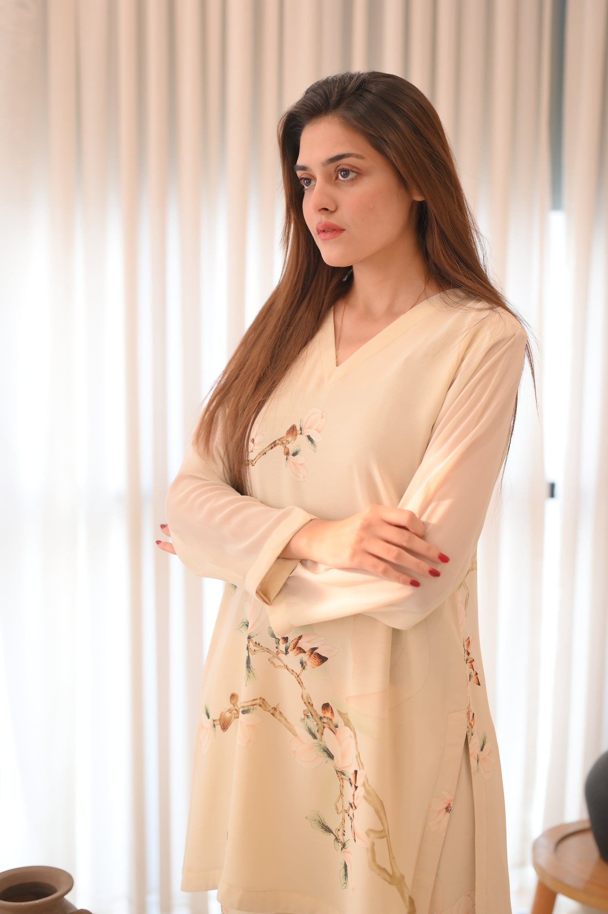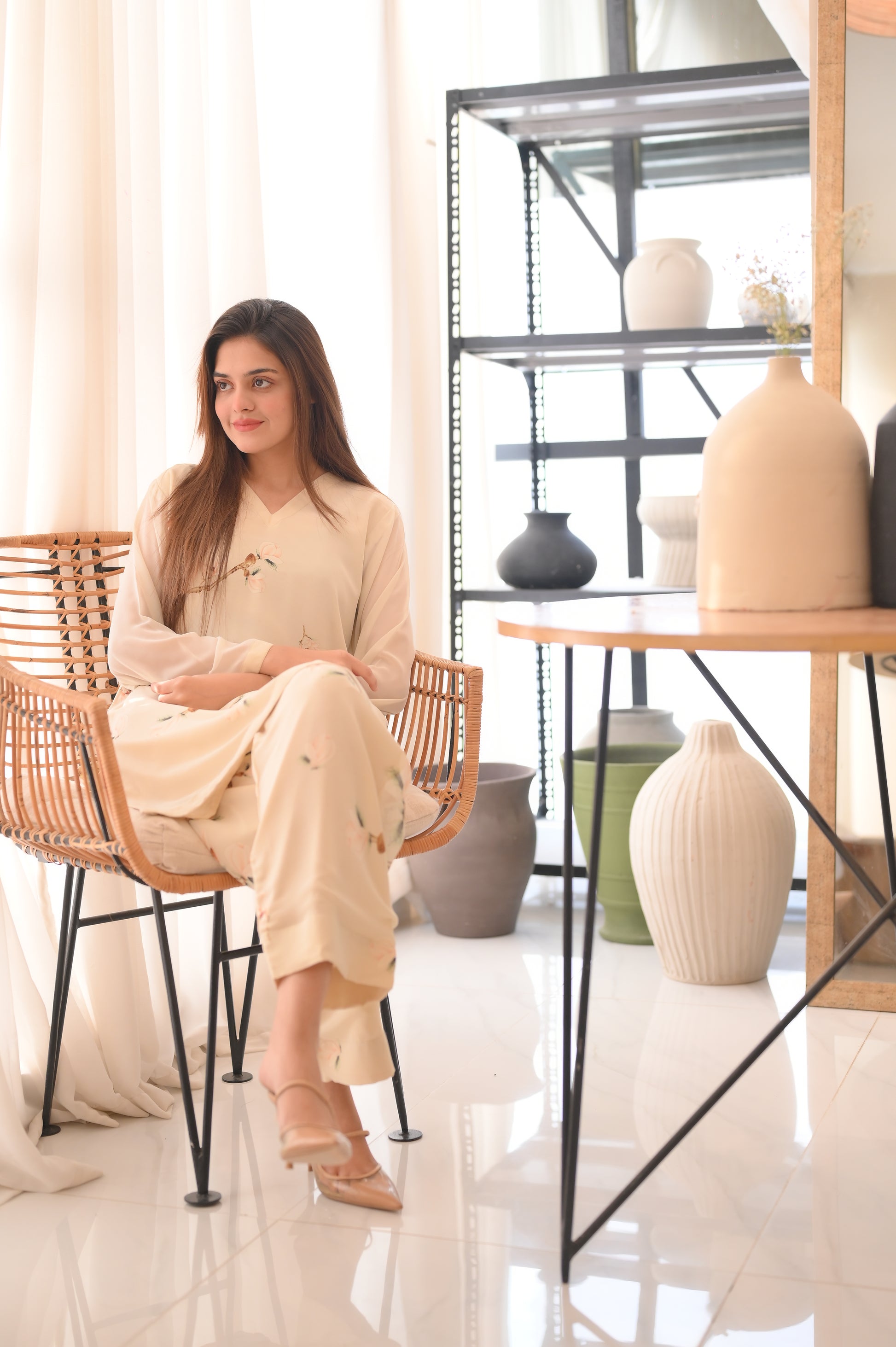 - Top: A beautifully tailored straight-cut kurta adorned with delicate floral prints, featuring a round neckline and long sleeves for a classic yet modern appeal.