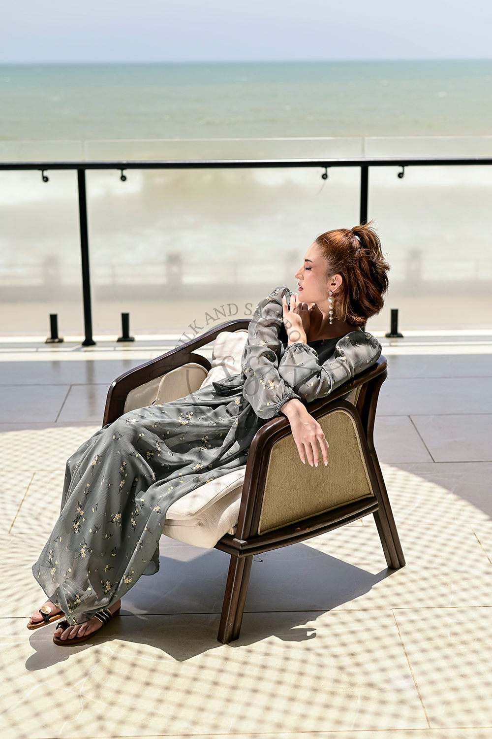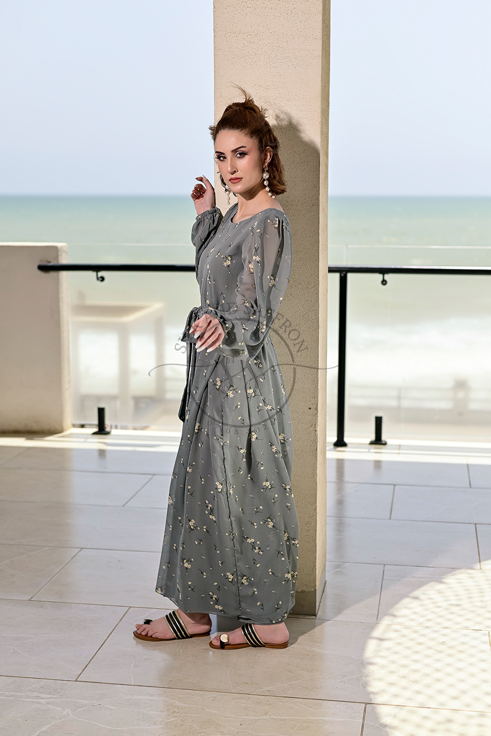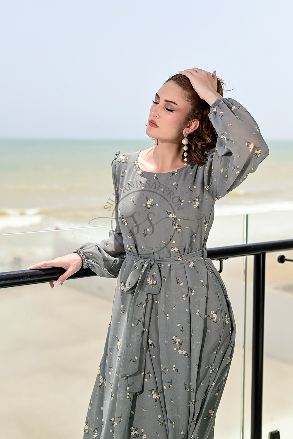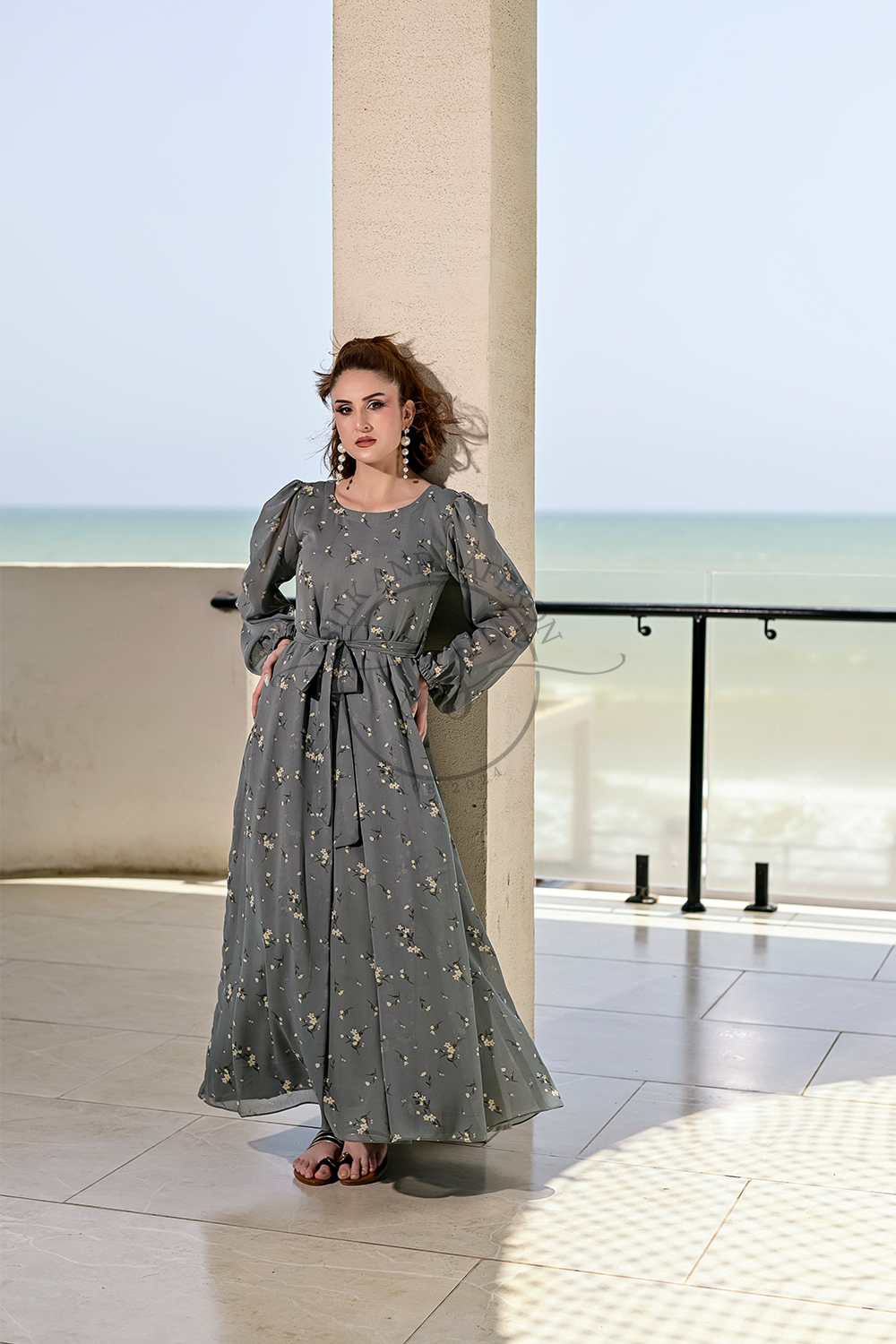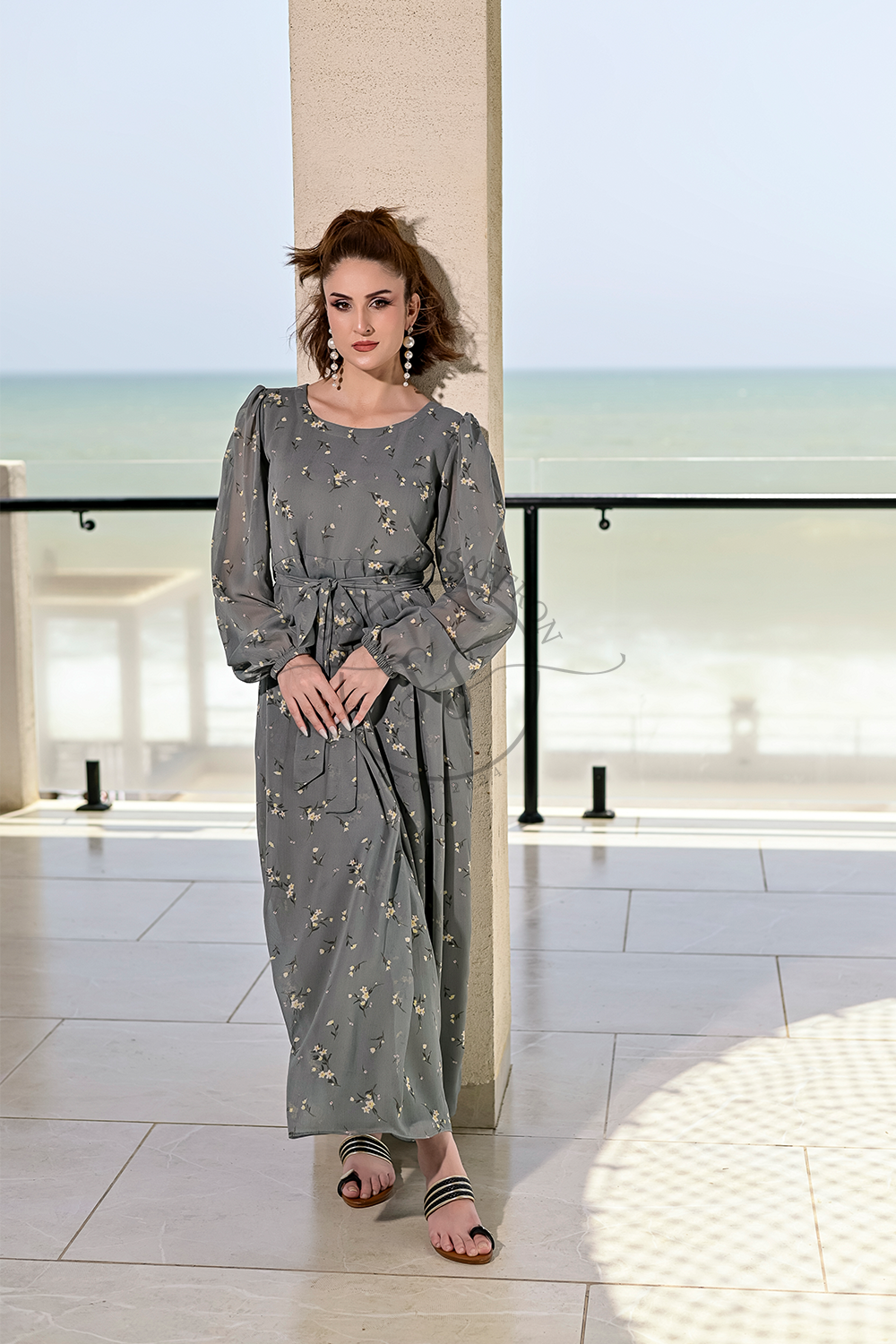 Design: A delicately flowing maxi dress in a soft, hazy grey, featuring a classic round neckline and a subtly cinched waist that cascades into an ethereal, full-length skirt. The dress is adorned with a subtle floral print, adding a touch of romance to its design.