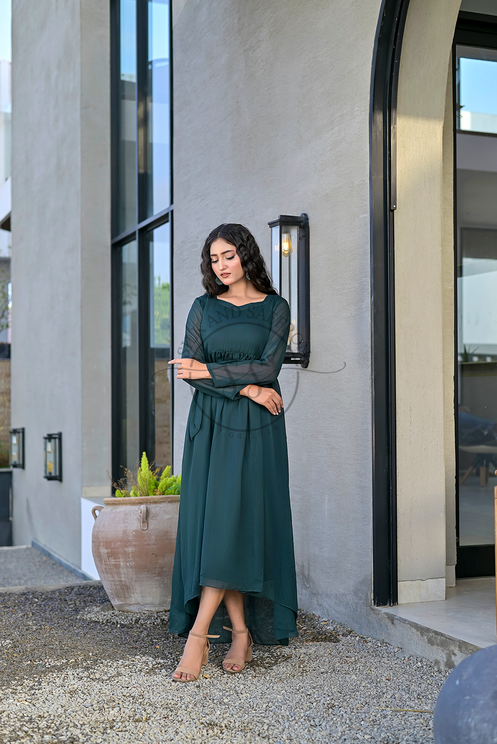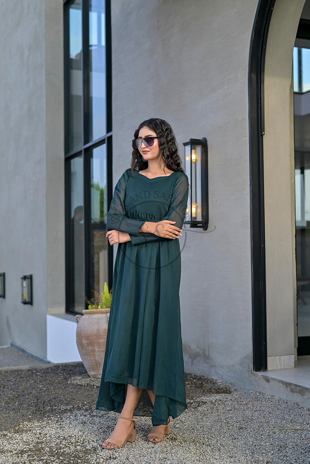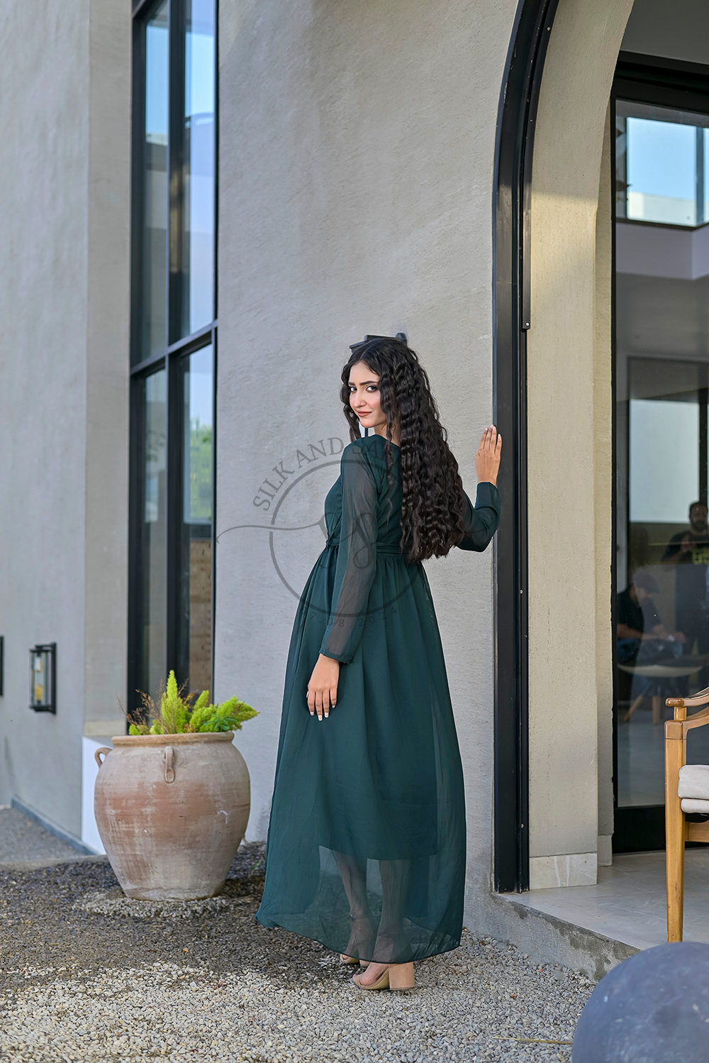 Design: An elegant and flowing maxi dress in a captivating deep jade hue, featuring a classic round neckline and a high-low hemline that adds a contemporary and graceful silhouette. The dress is designed for fluid movement and sophisticated drape.