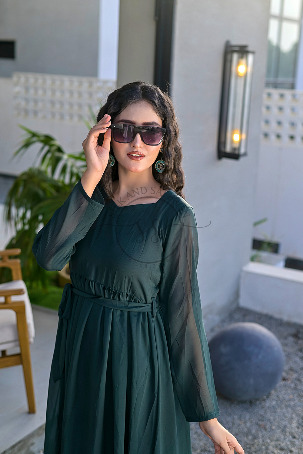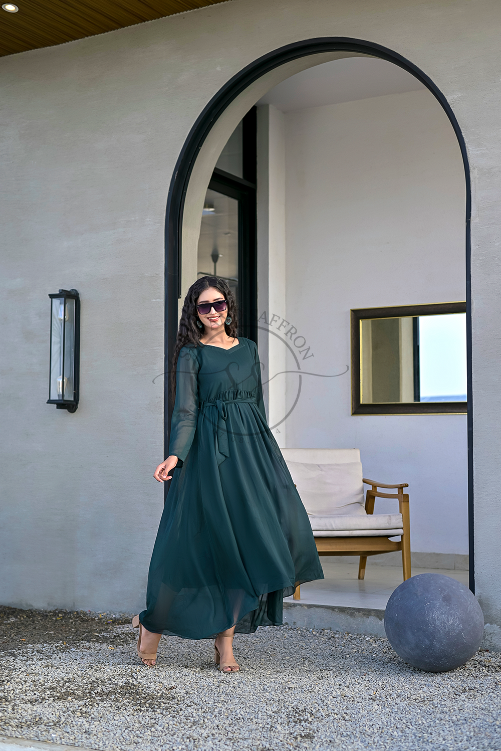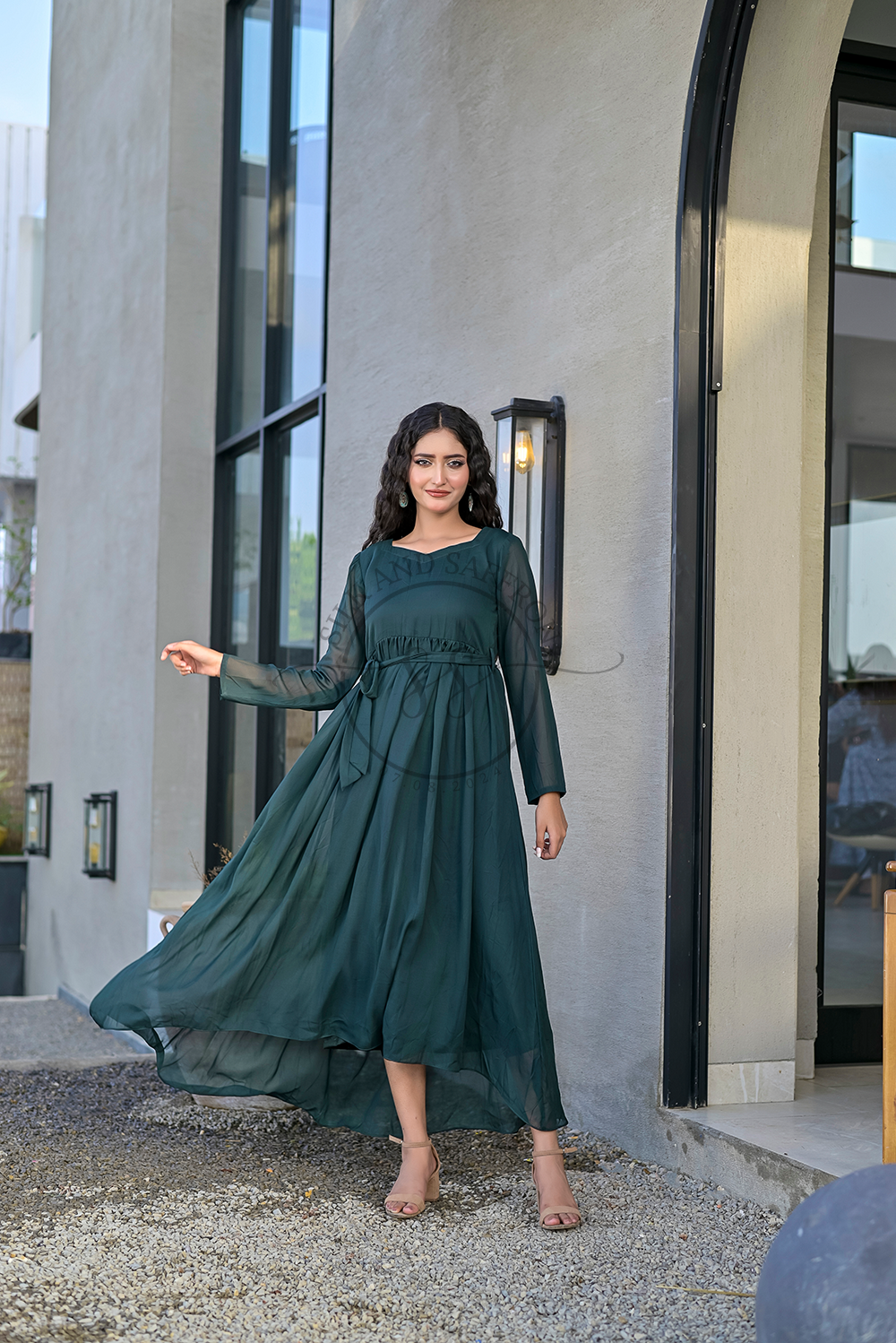 Design: An elegant and flowing maxi dress in a captivating deep jade hue, featuring a classic round neckline and a high-low hemline that adds a contemporary and graceful silhouette. The dress is designed for fluid movement and sophisticated drape.