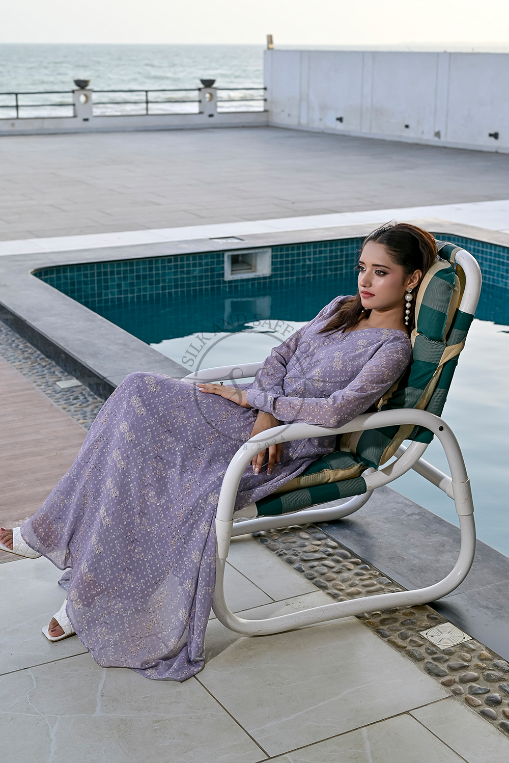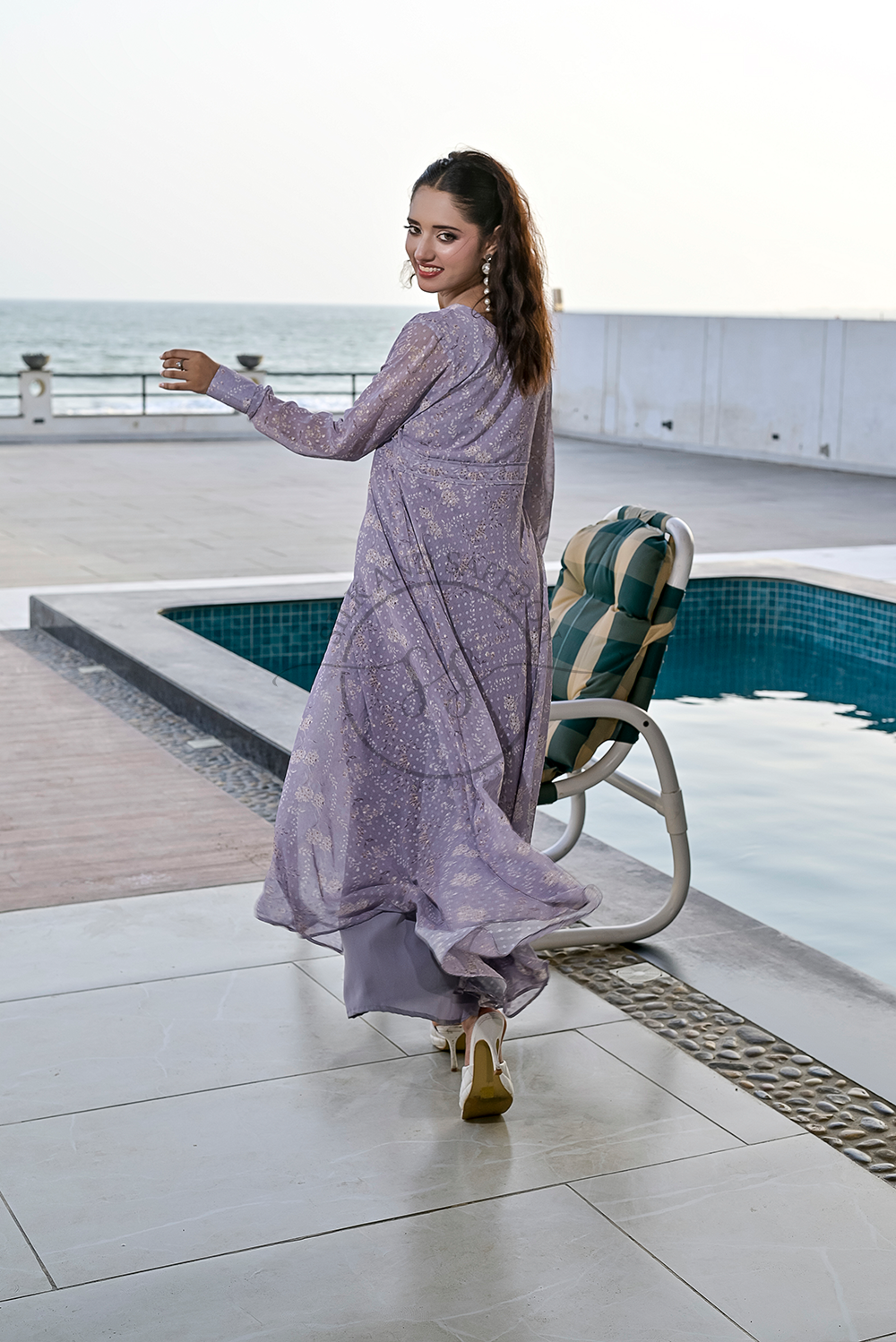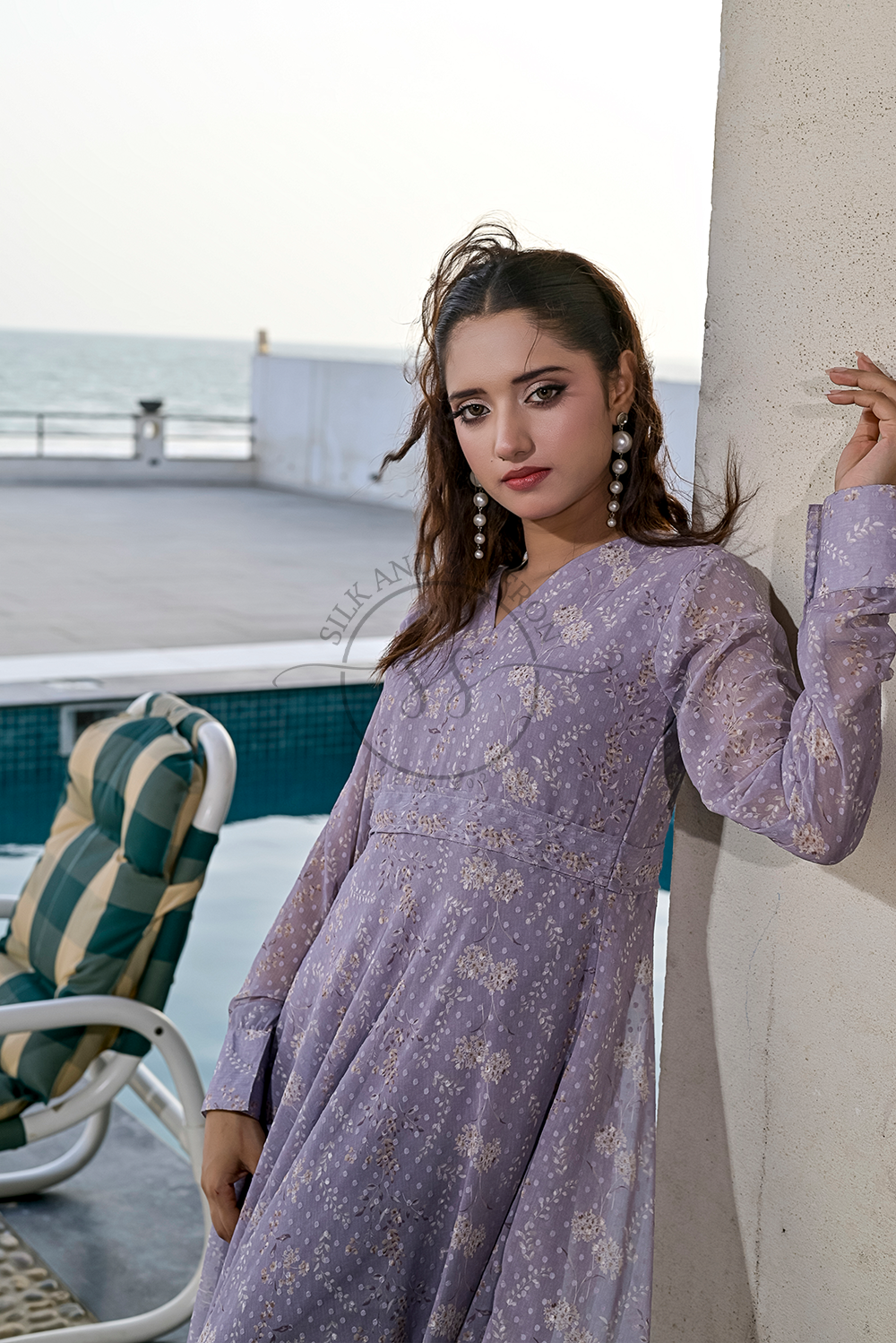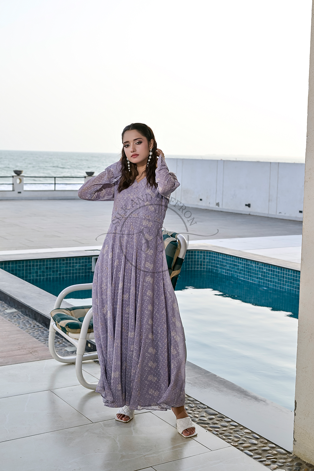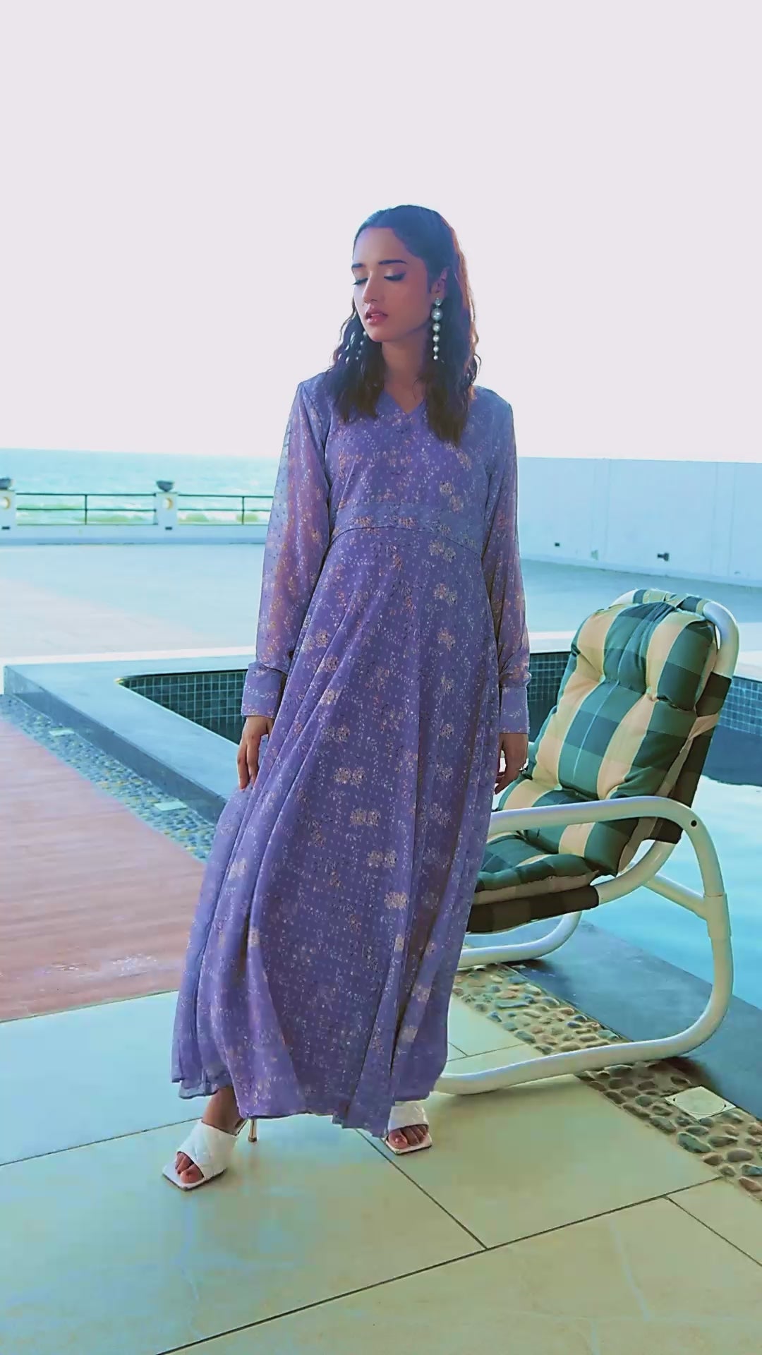 Design: A captivating maxi dress in a soft, enchanting shade of mauve, featuring a graceful V-neckline and a flowing, tiered, or pleated silhouette that drapes beautifully from the bodice. The dress is adorned with a subtle, delicate pattern, adding texture and depth to its allure.