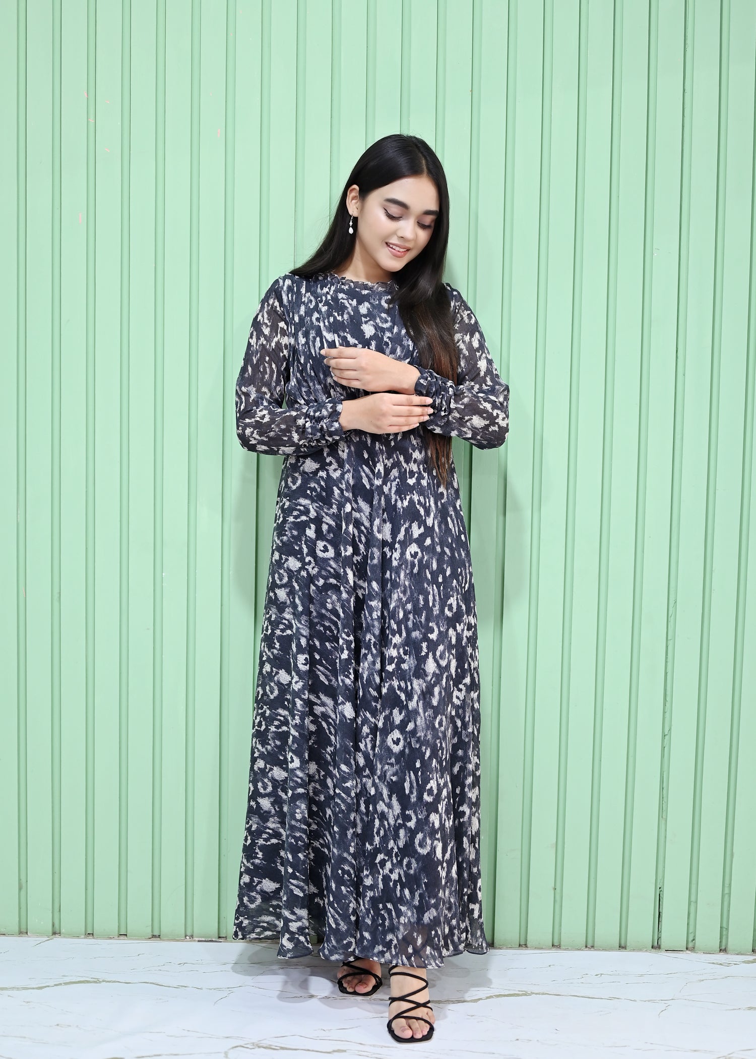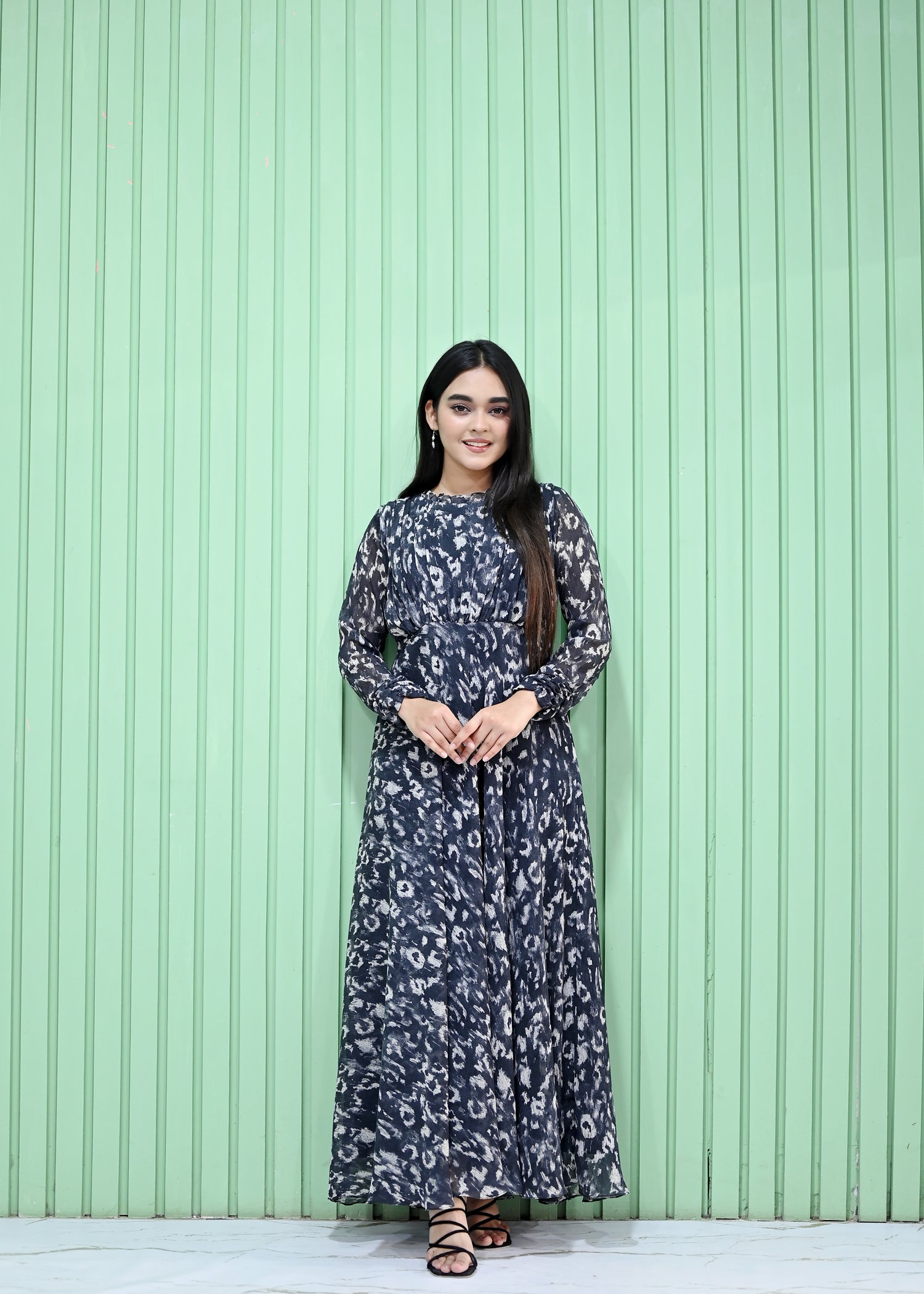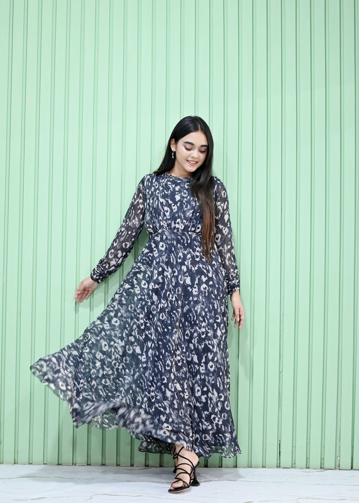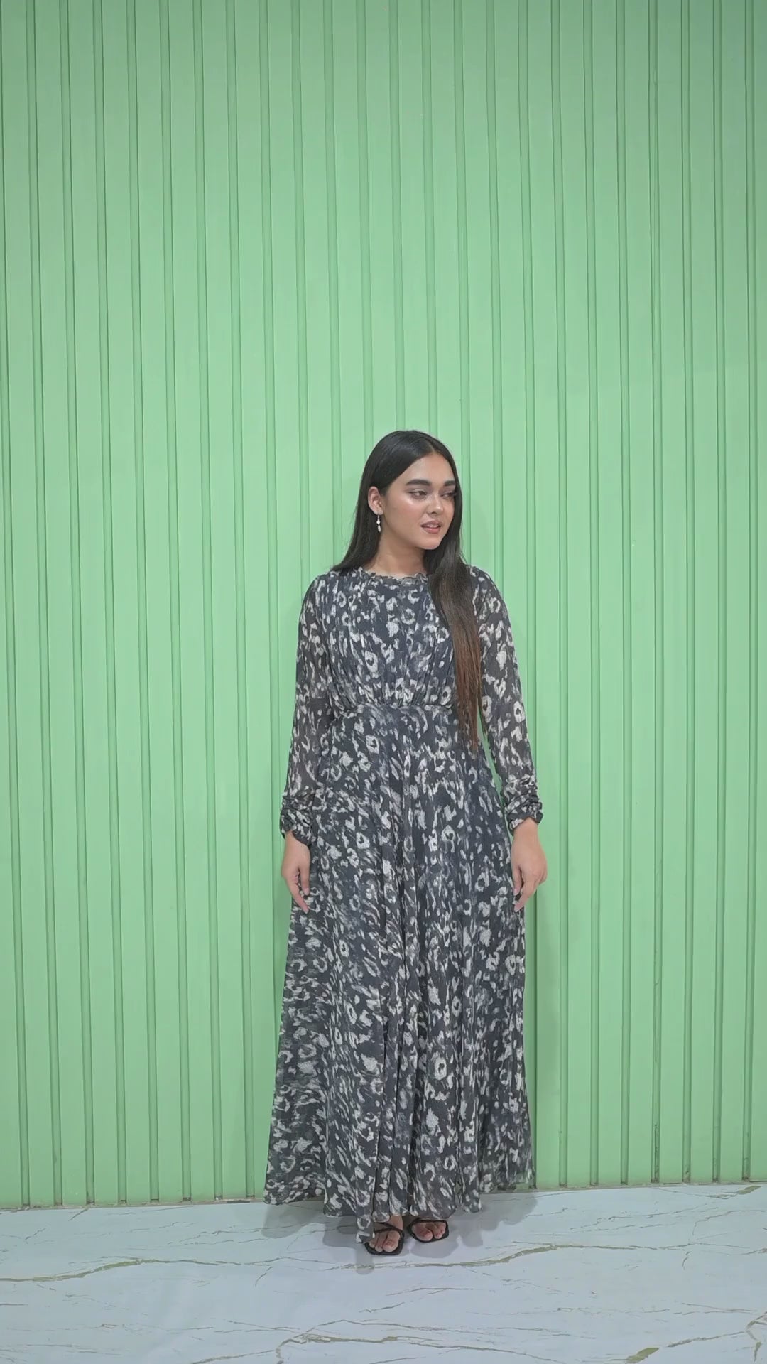 Design: A sophisticated maxi dress featuring a subtle yet bold monochrome abstract print.