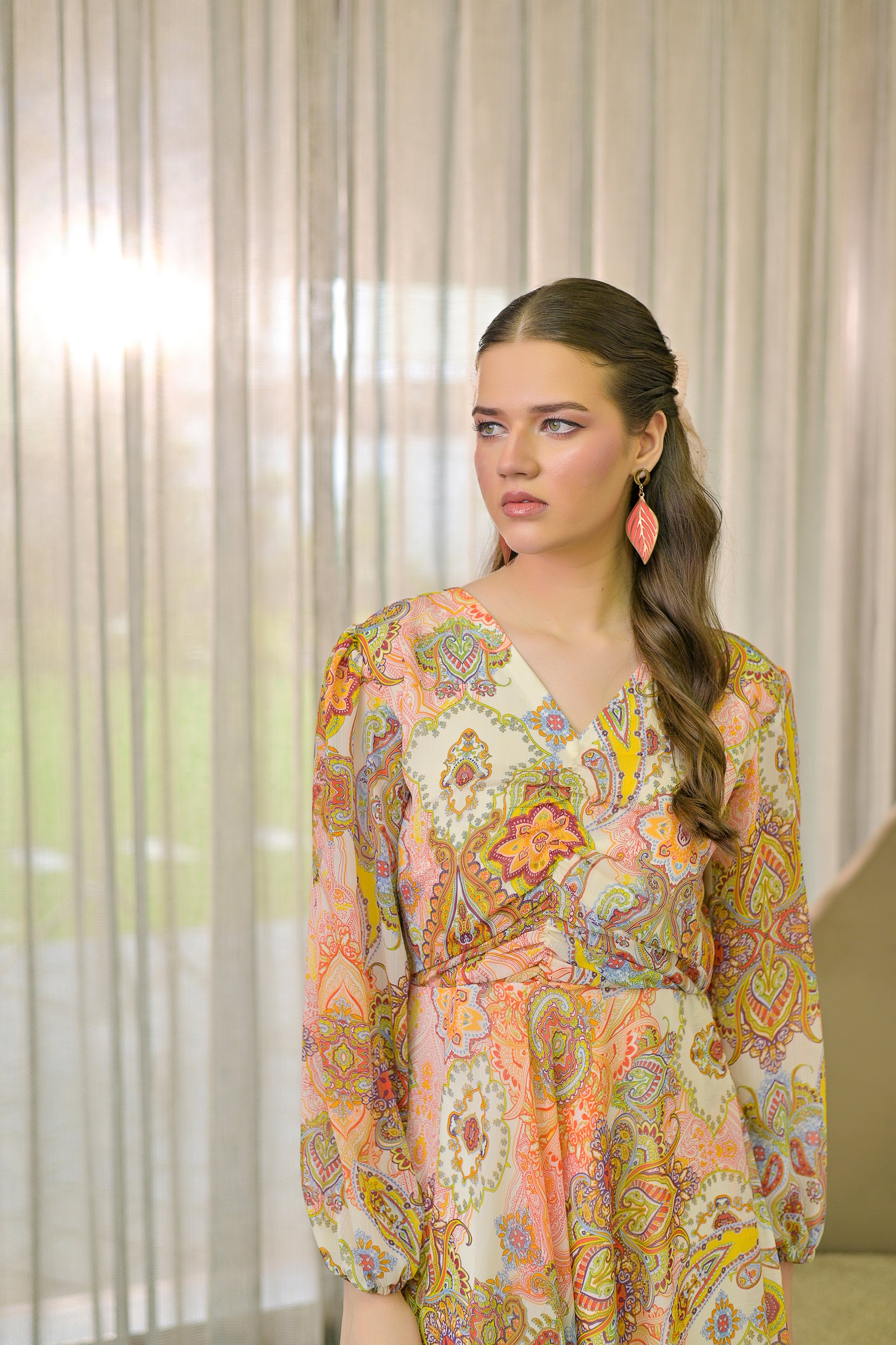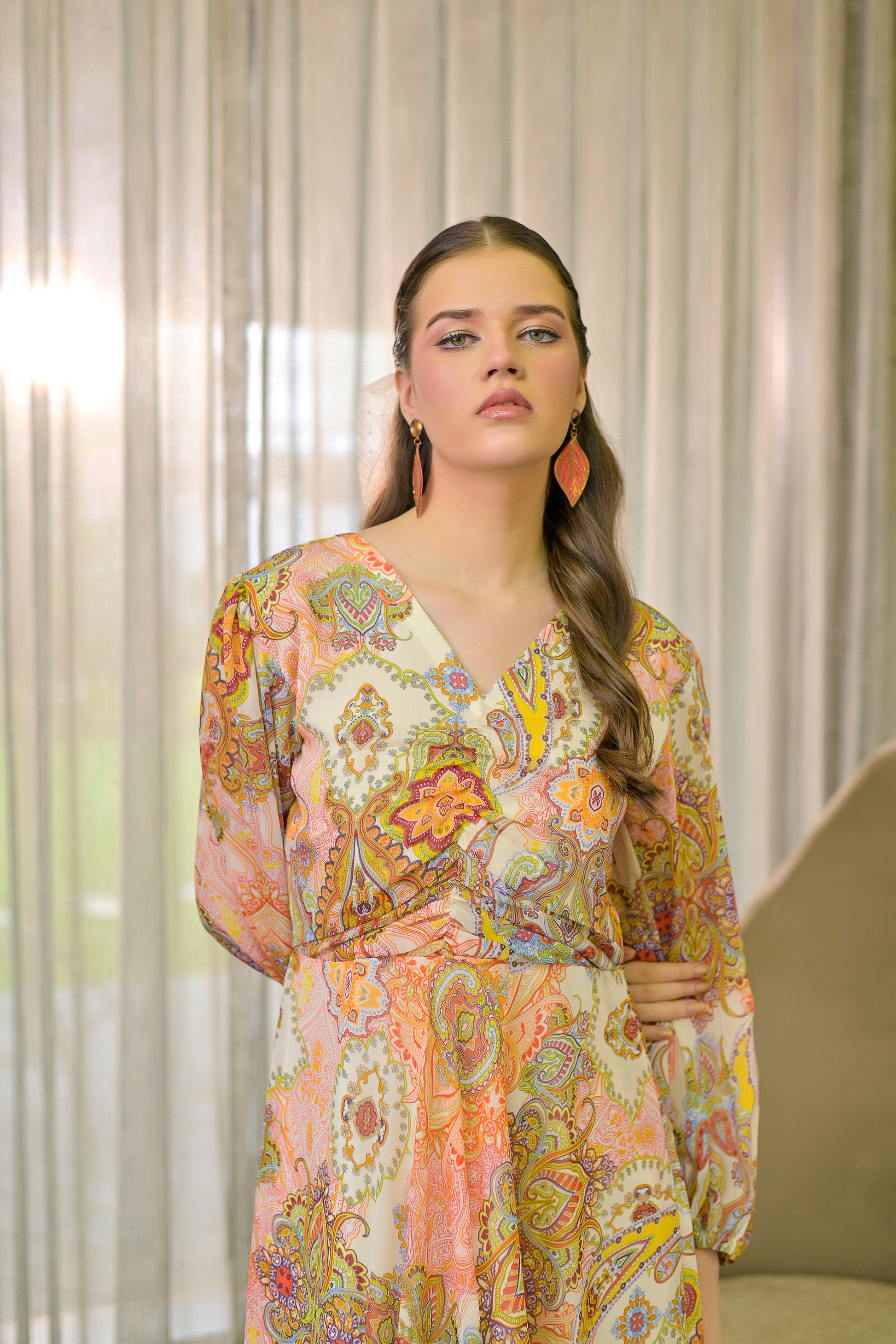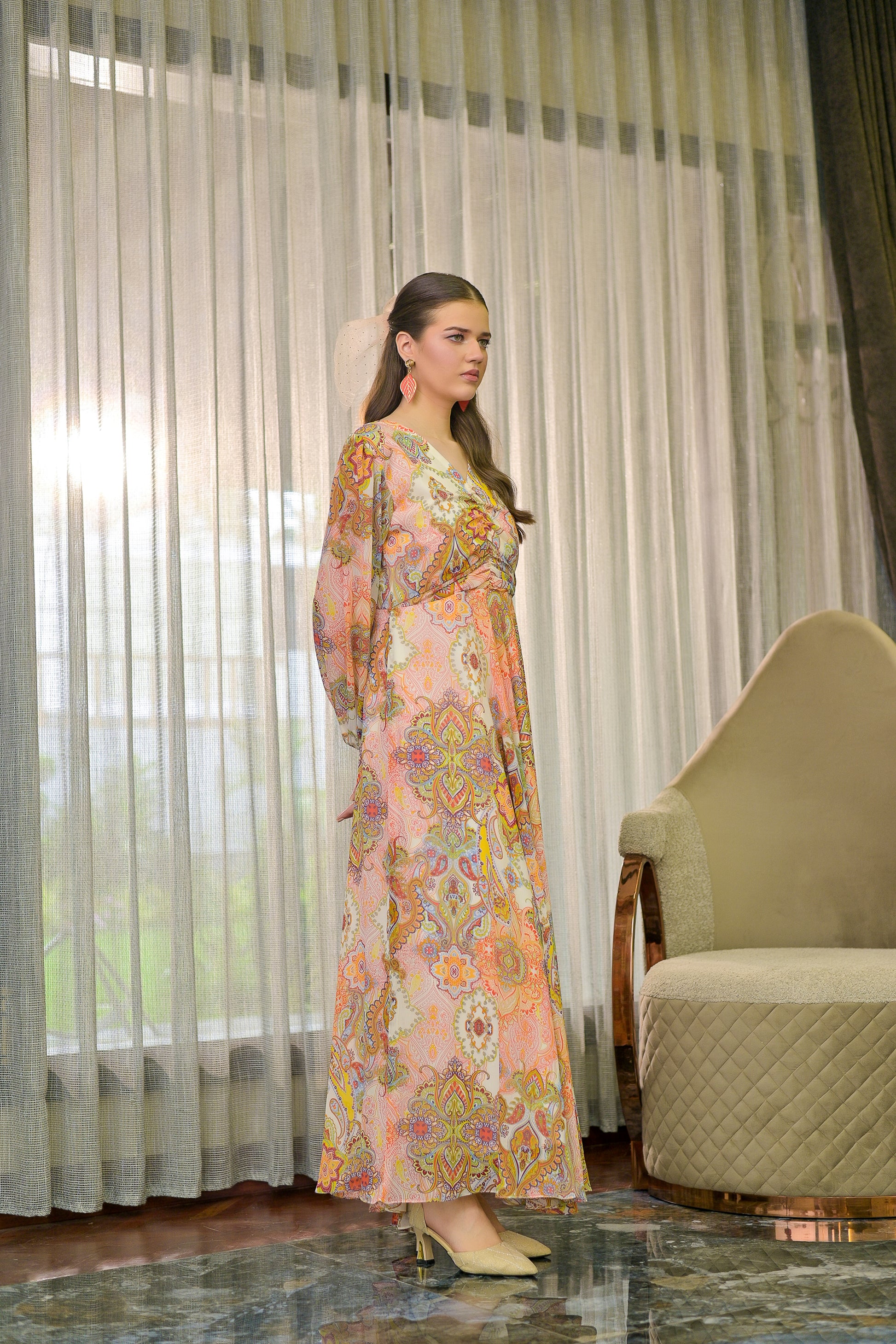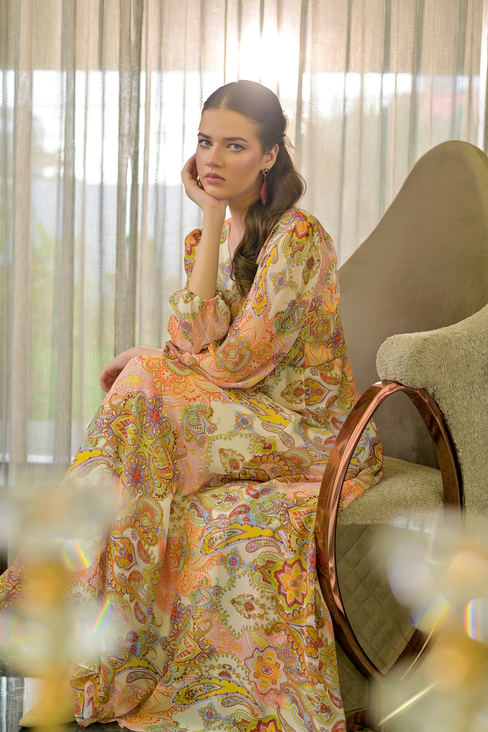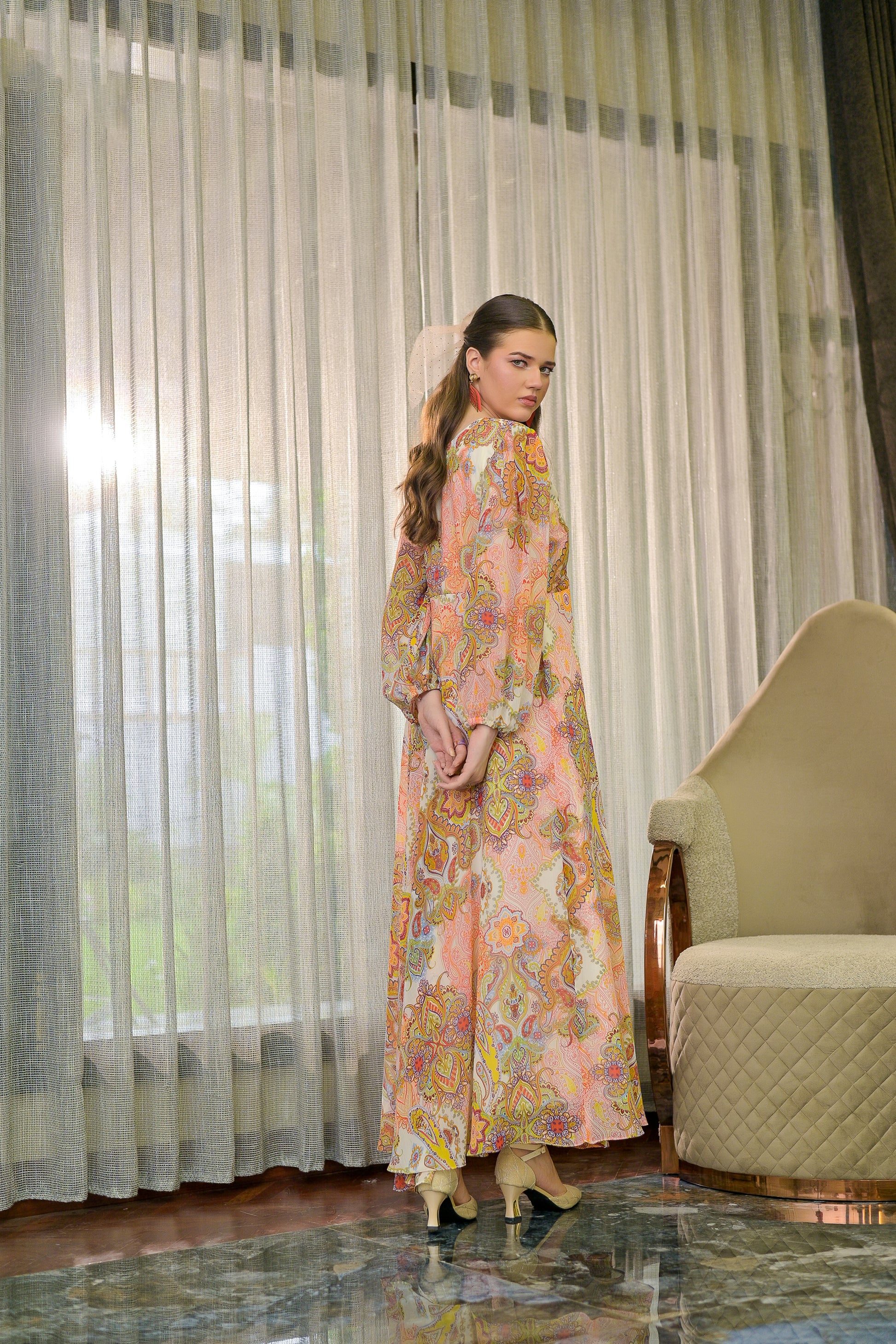 Peach chiffon with subtle floral motifs, this maxi glows with feminine charm. Its airy silhouette is as comfortable as it is stylish, making it a lovely pick for garden brunches, casual hangouts, or light formal occasions. Pastel Glow radiates softness and grace.