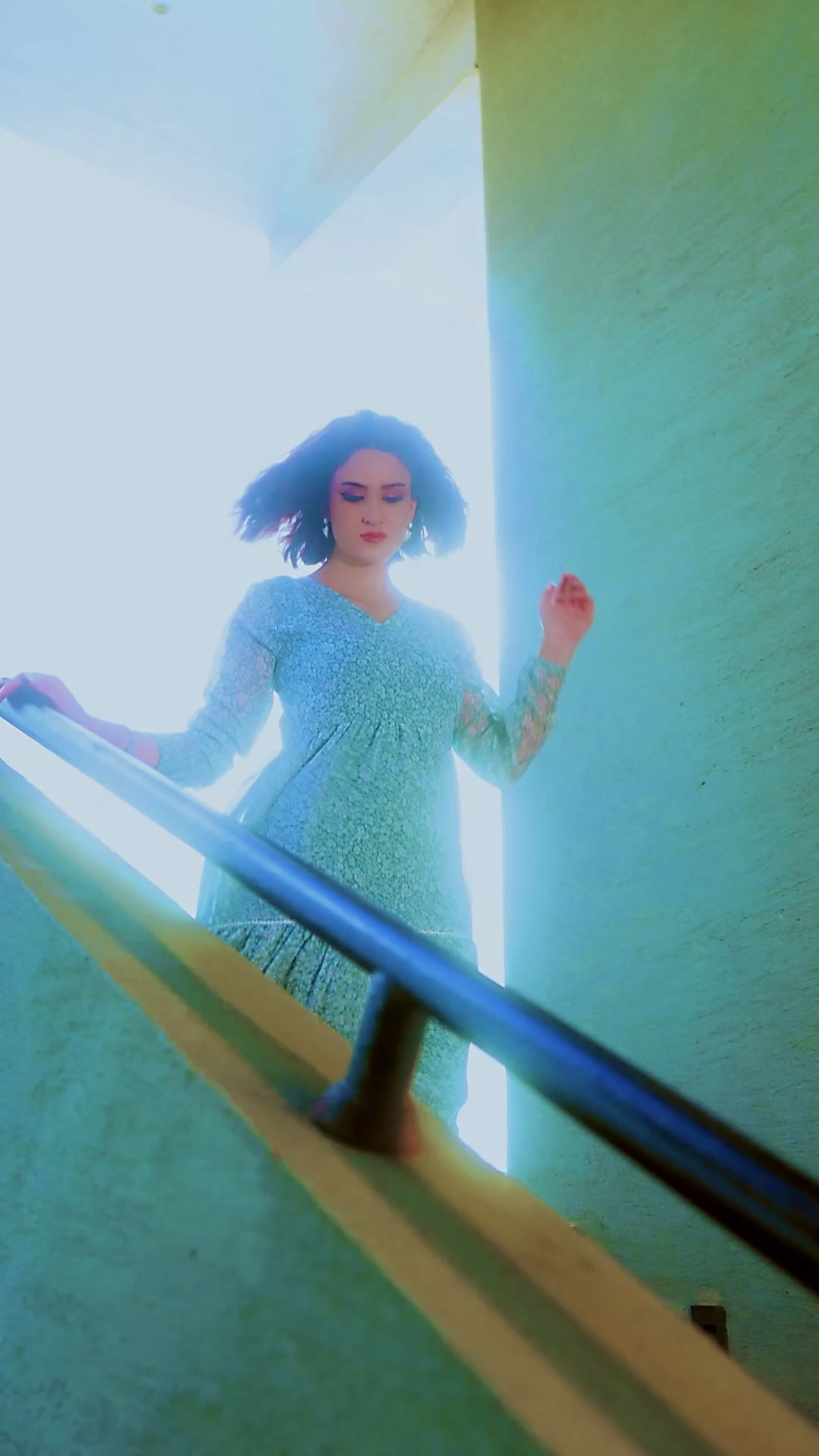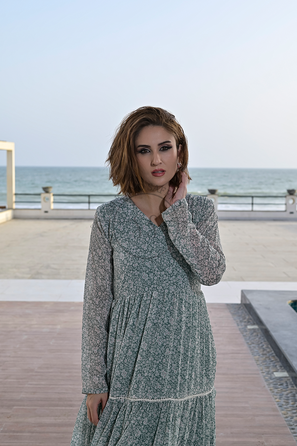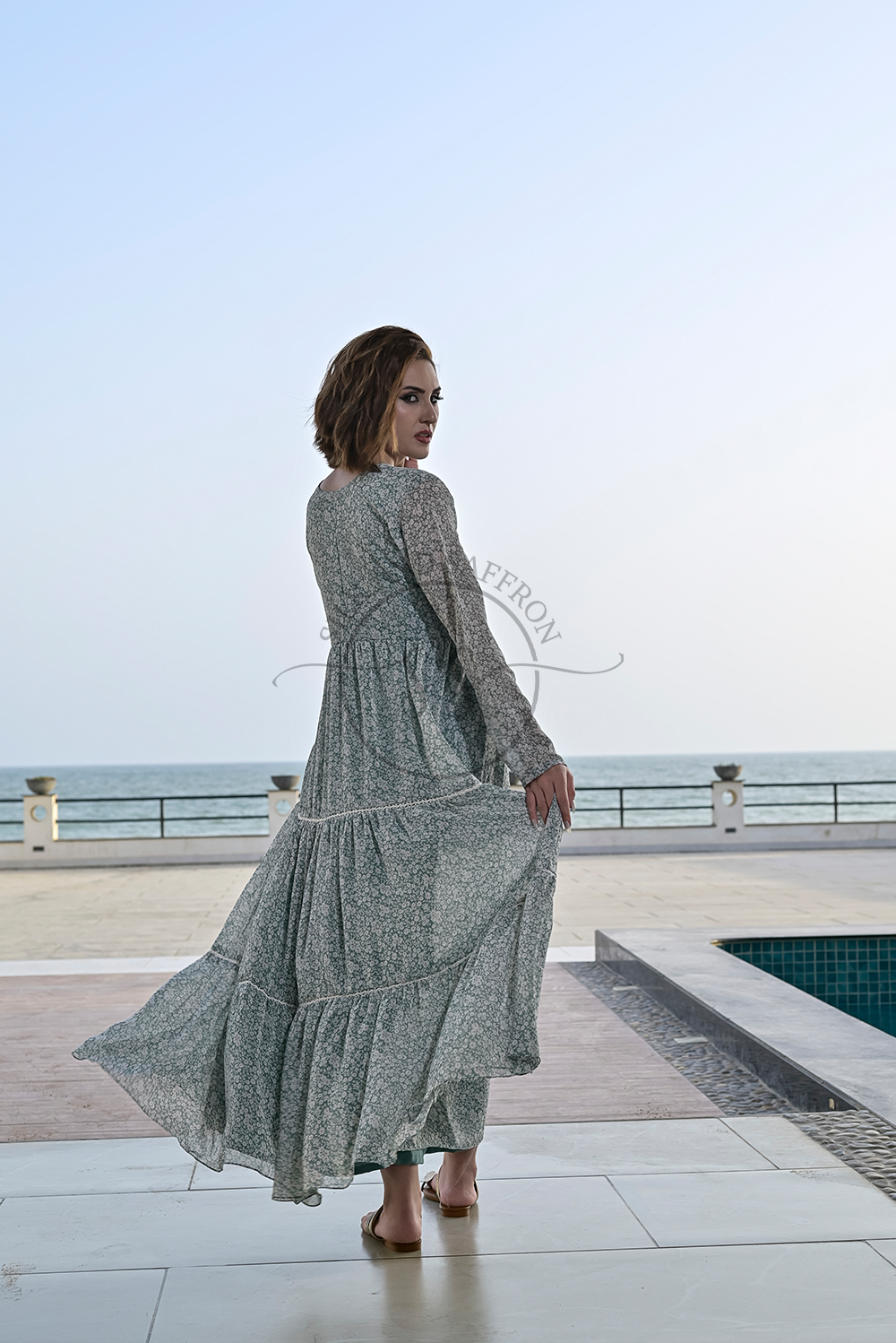 Design: A gracefully tiered maxi dress in a serene pastel green, featuring a classic round or subtle V-neckline. The dress boasts a voluminous, flowing silhouette with multiple ruffled tiers that create beautiful movement and a romantic aesthetic. A delicate, all-over floral or abstract print adds a touch of subtle detail.