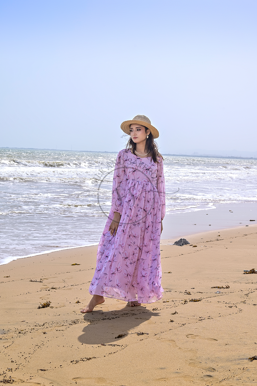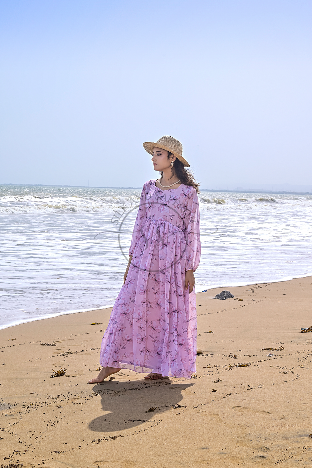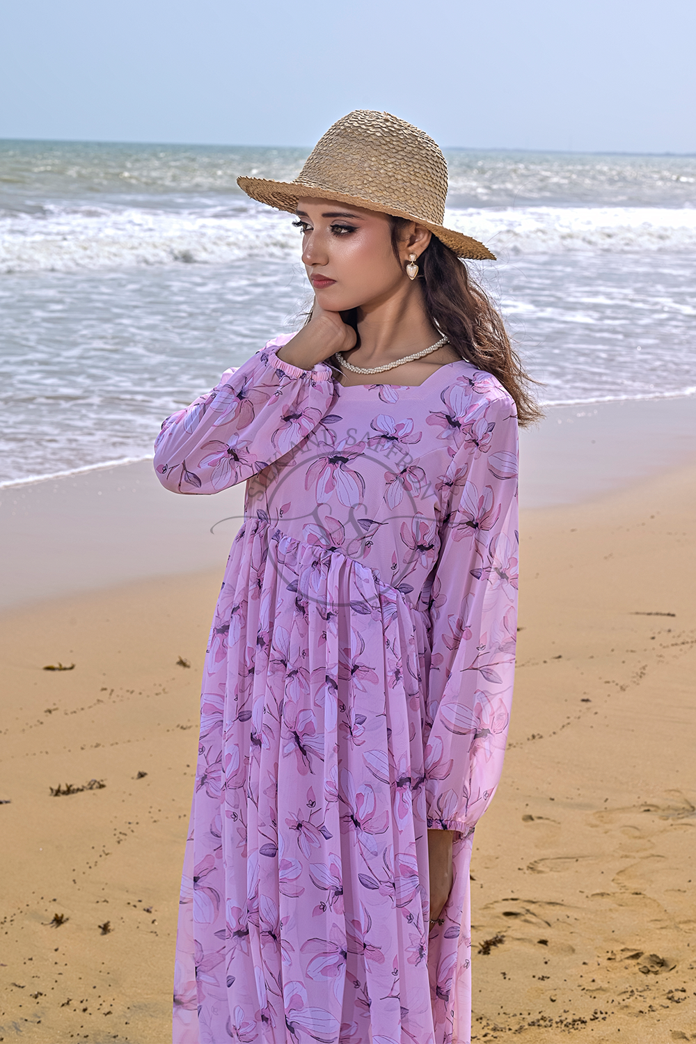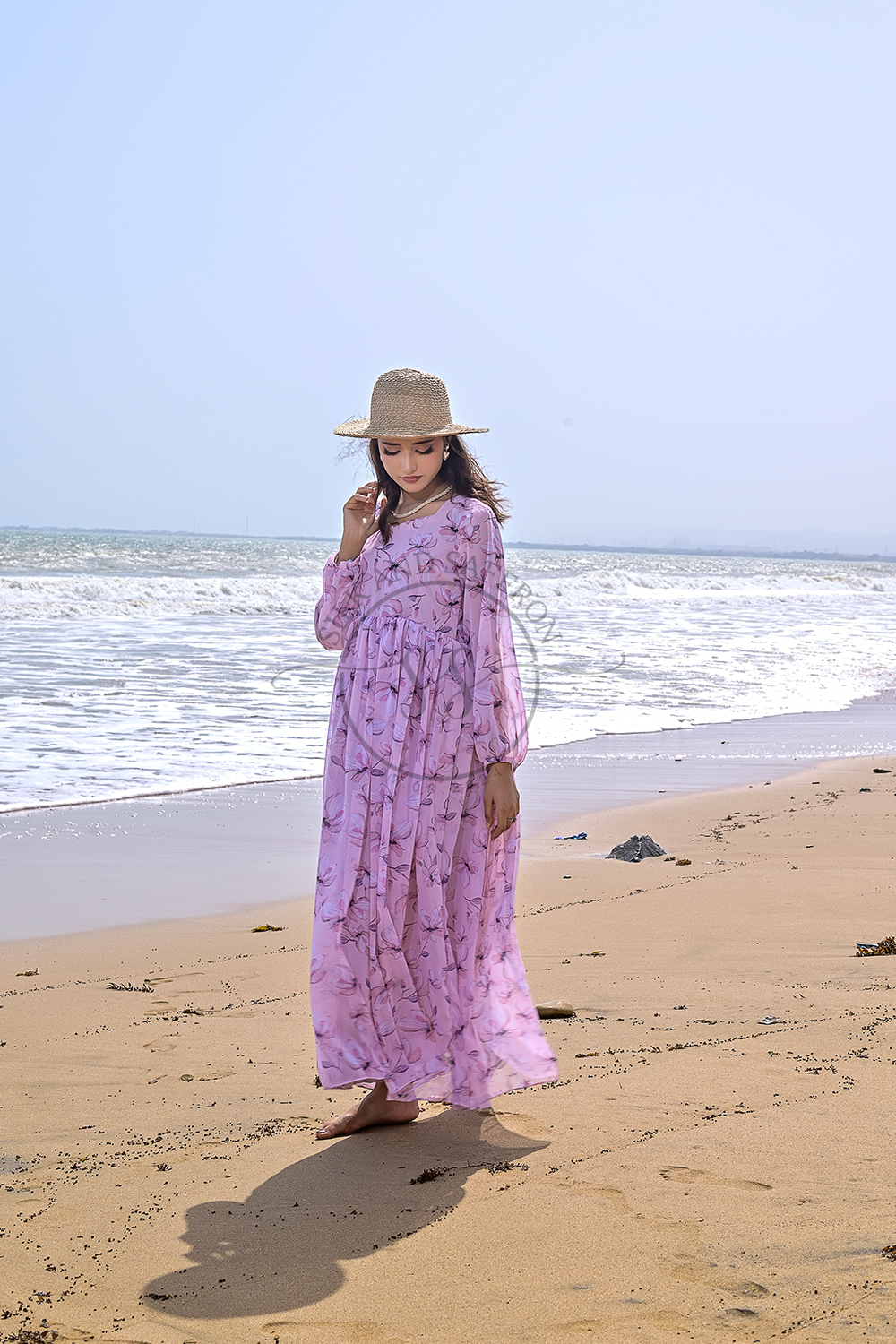 Design: A dreamy, flowy maxi dress featuring a soft round neckline and delicate floral print, reminiscent of petals caught in the golden hour breeze.