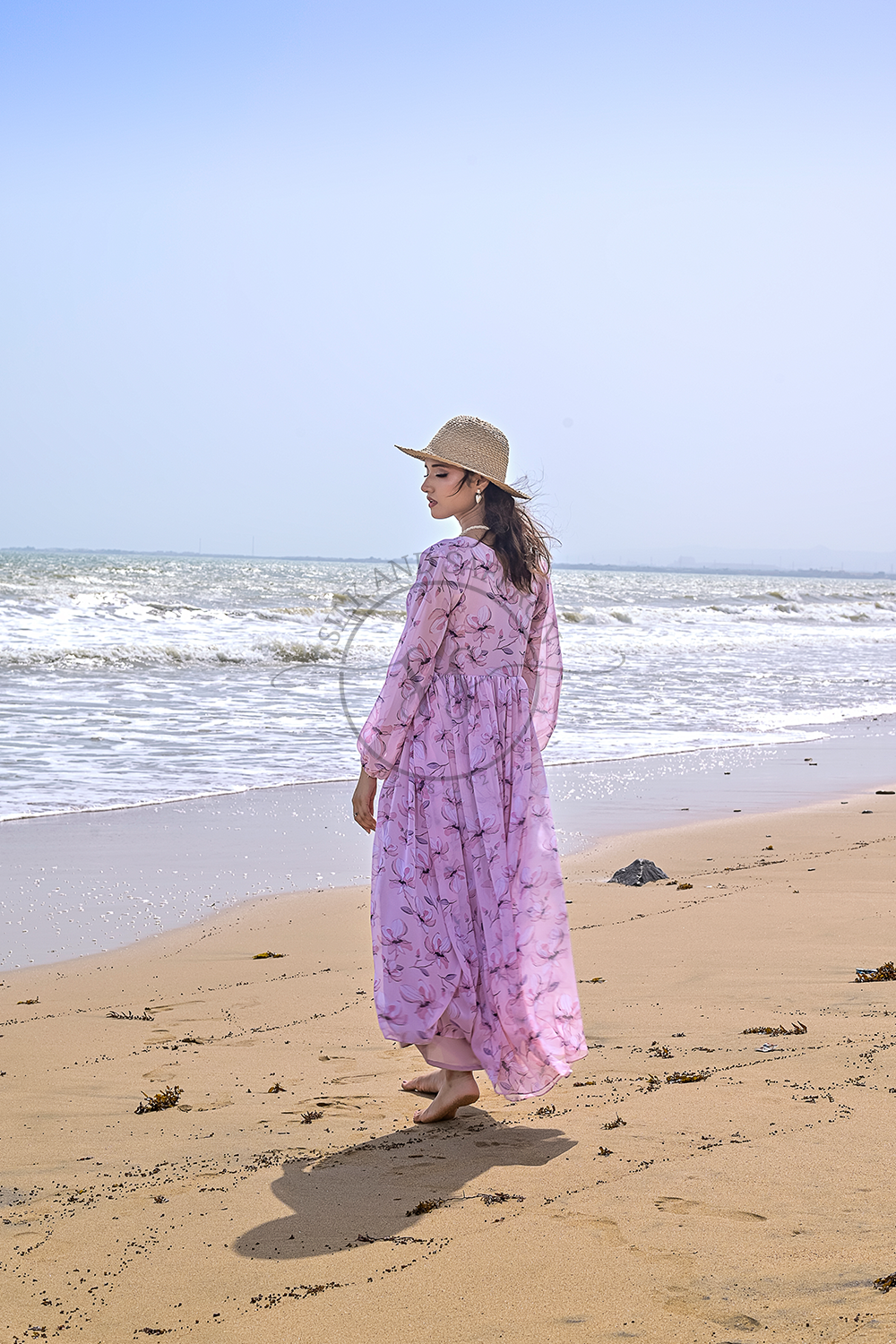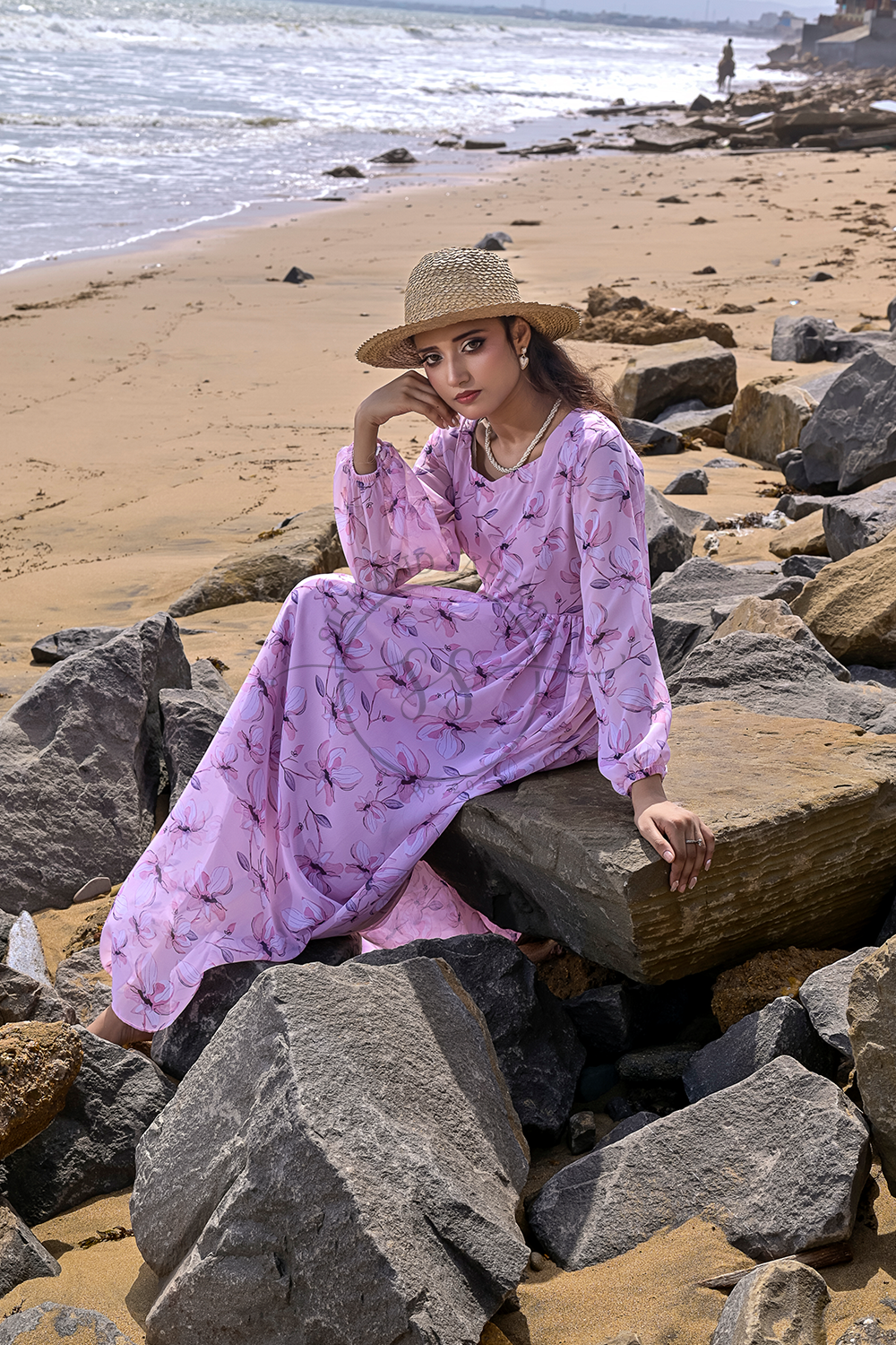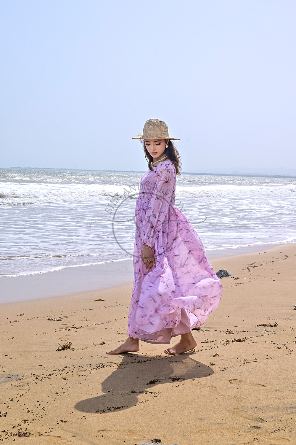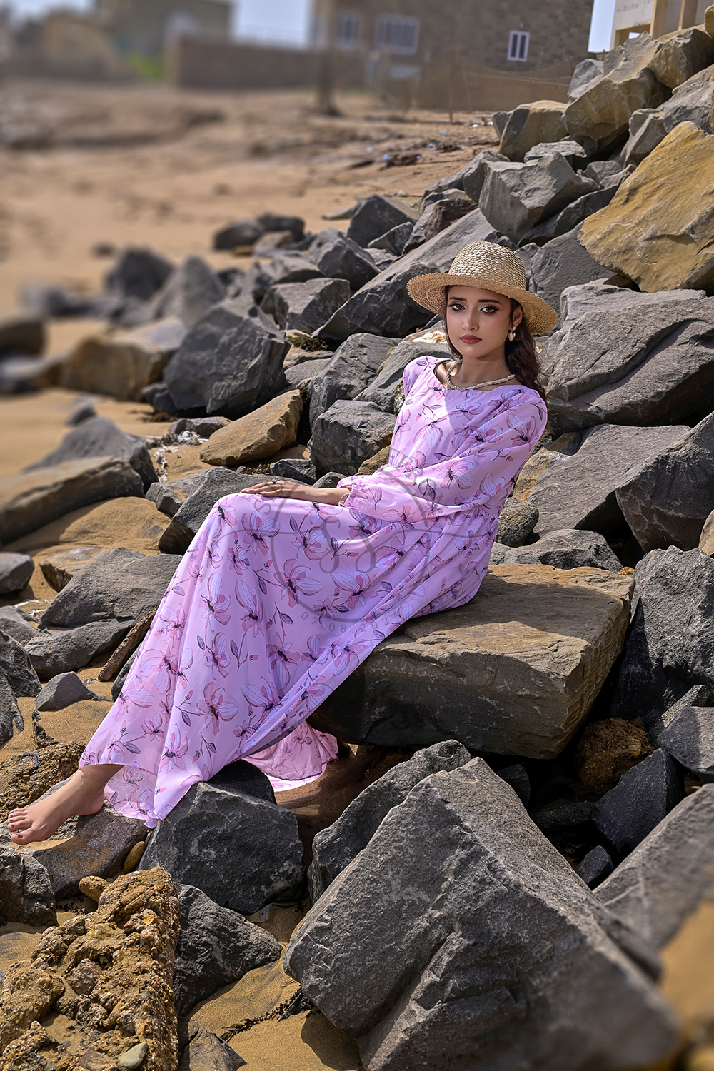 Design: A dreamy, flowy maxi dress featuring a soft round neckline and delicate floral print, reminiscent of petals caught in the golden hour breeze.