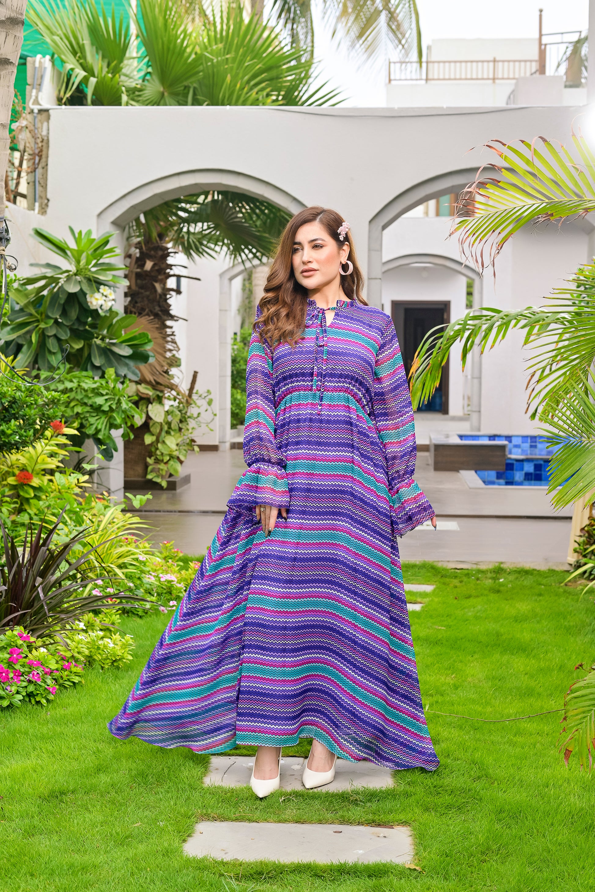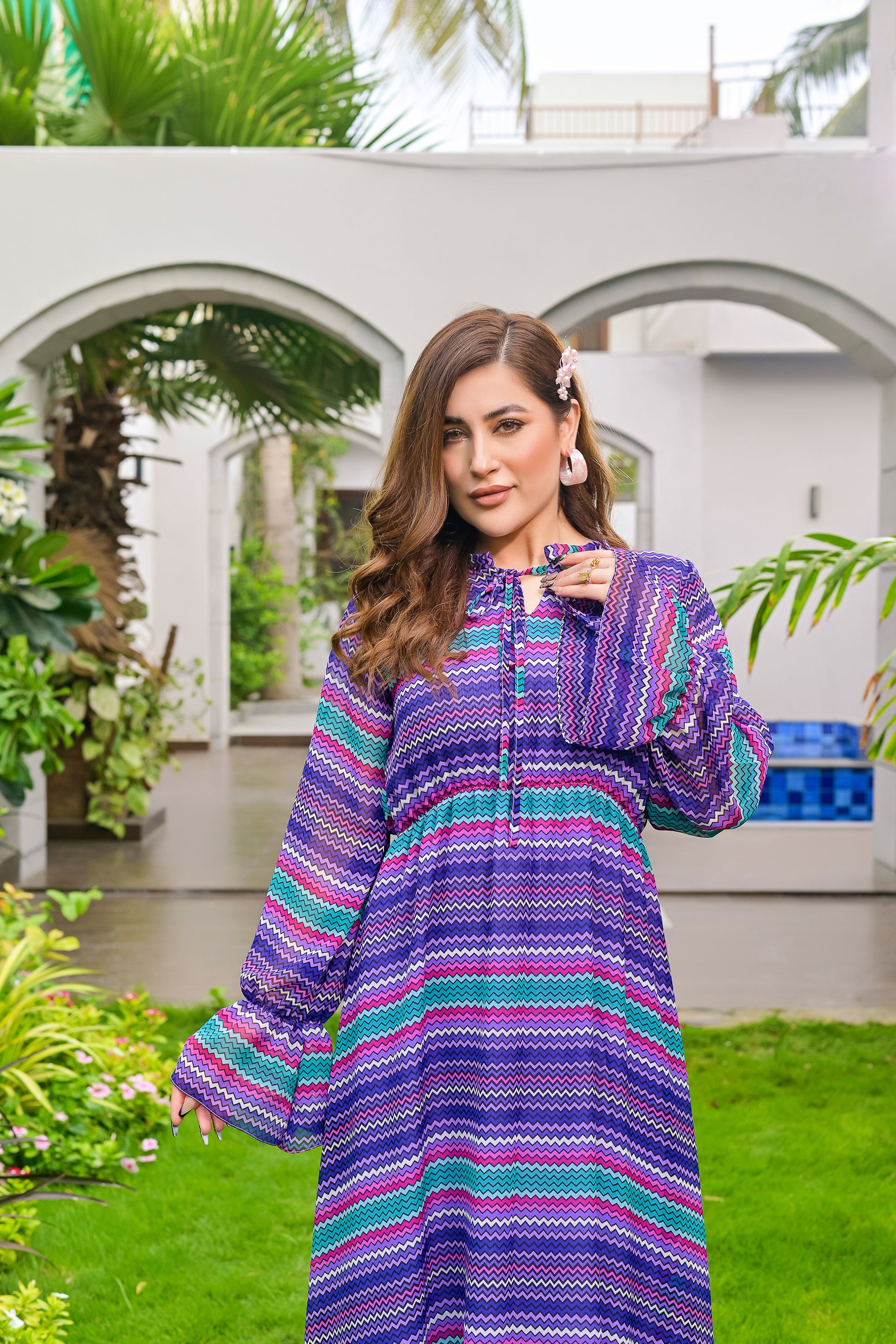 A stunning blend of purple, turquoise, and ocean hues, this chiffon maxi flows like waves. The relaxed silhouette ensures comfort, while the print makes it a statement piece. Prism Waves is a modern choice for parties, vacations, or casual evenings where style meets ease.