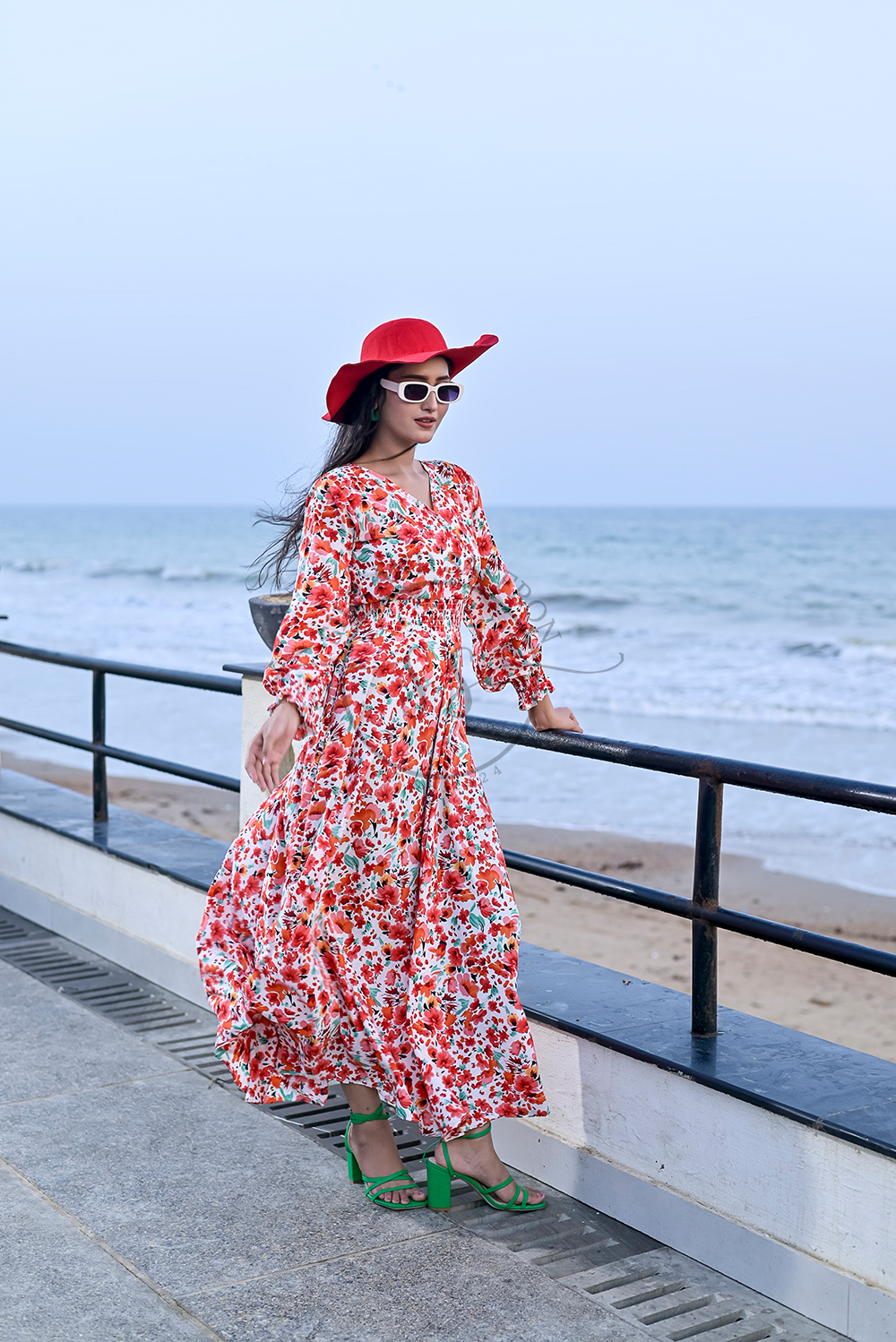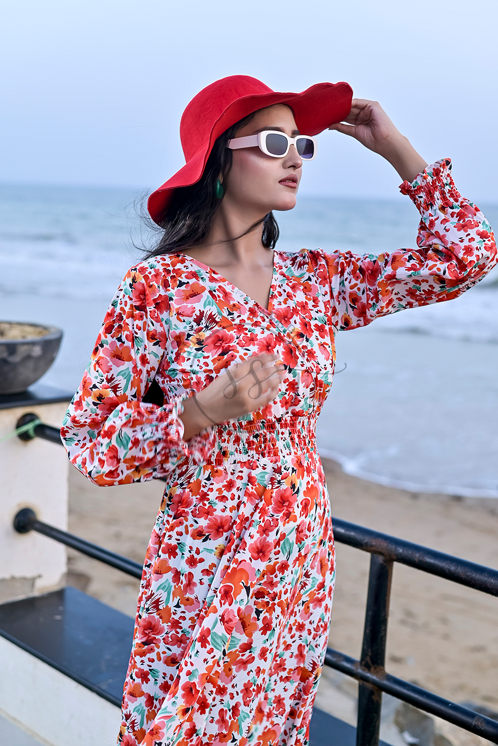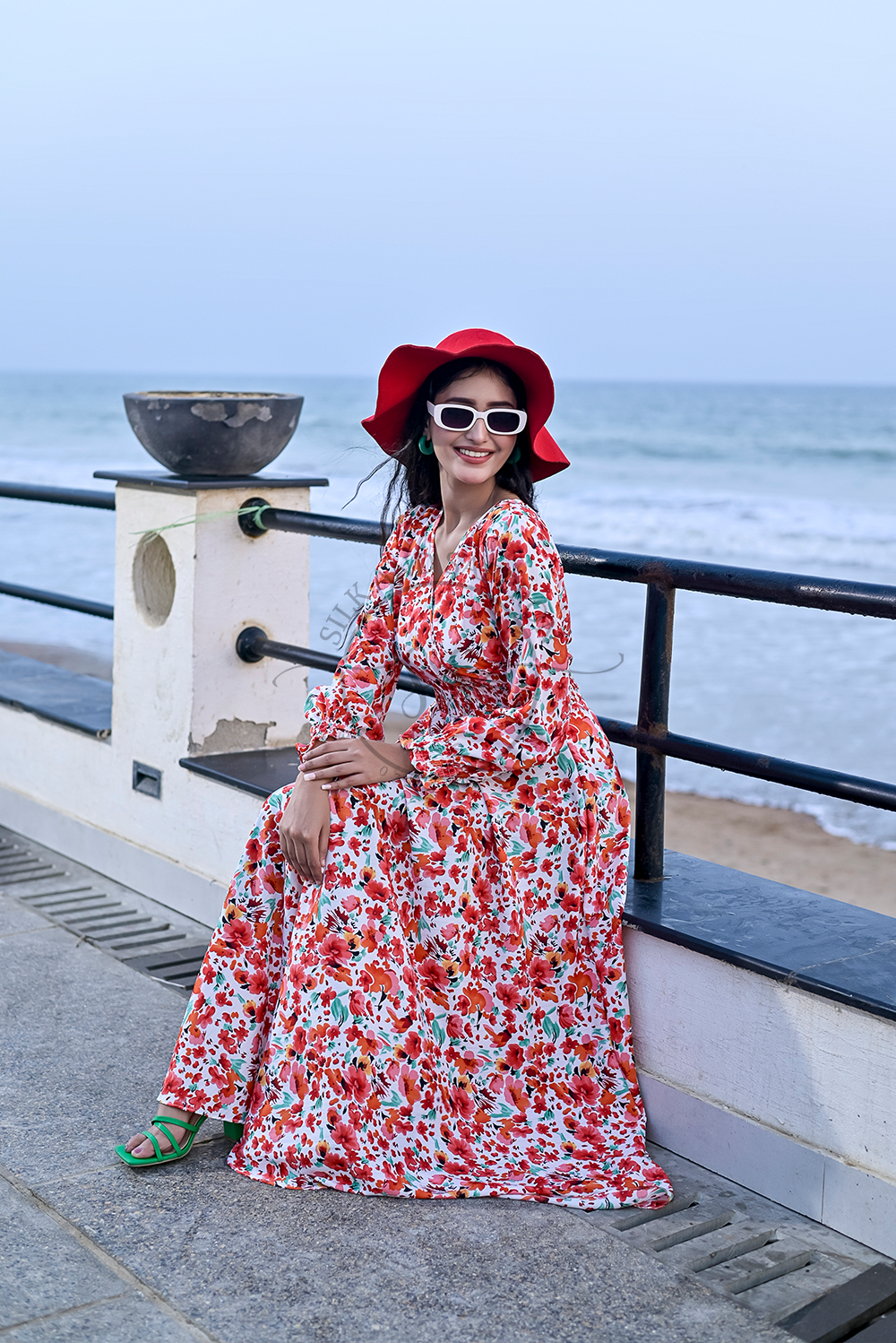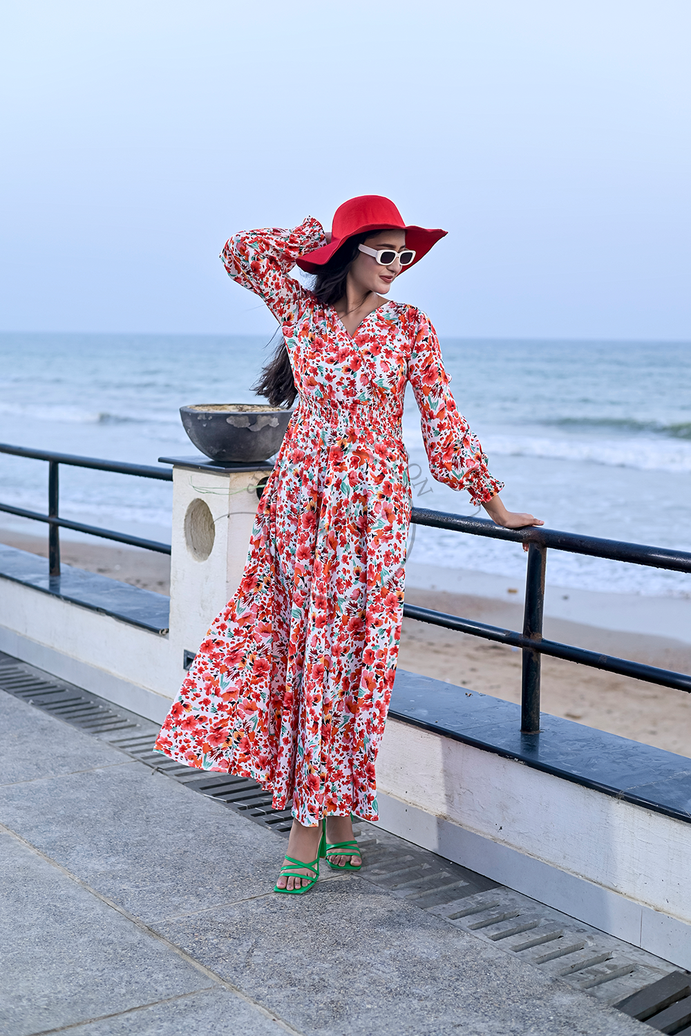 Design: A vivacious maxi dress adorned with a striking and colorful floral print that evokes a field of blooming flowers. It features a flattering V-neckline and a flowing, full-length skirt that sways with every movement.