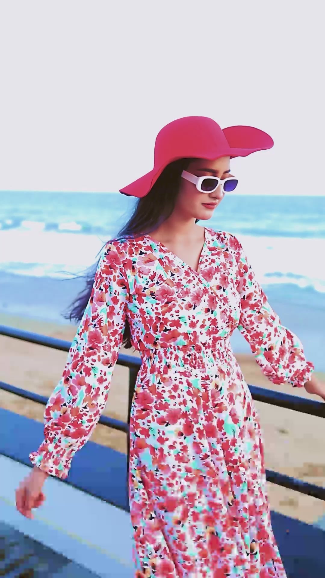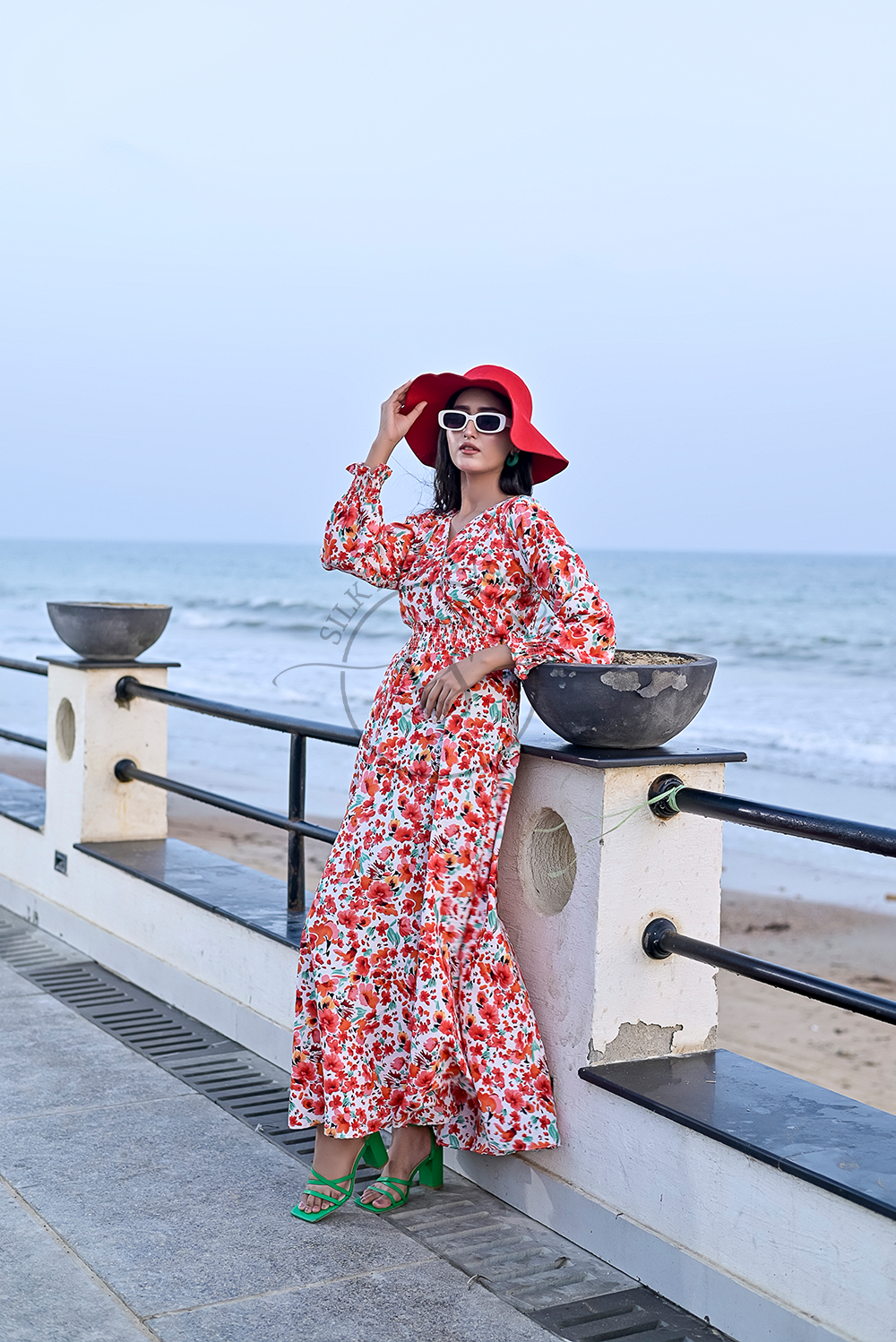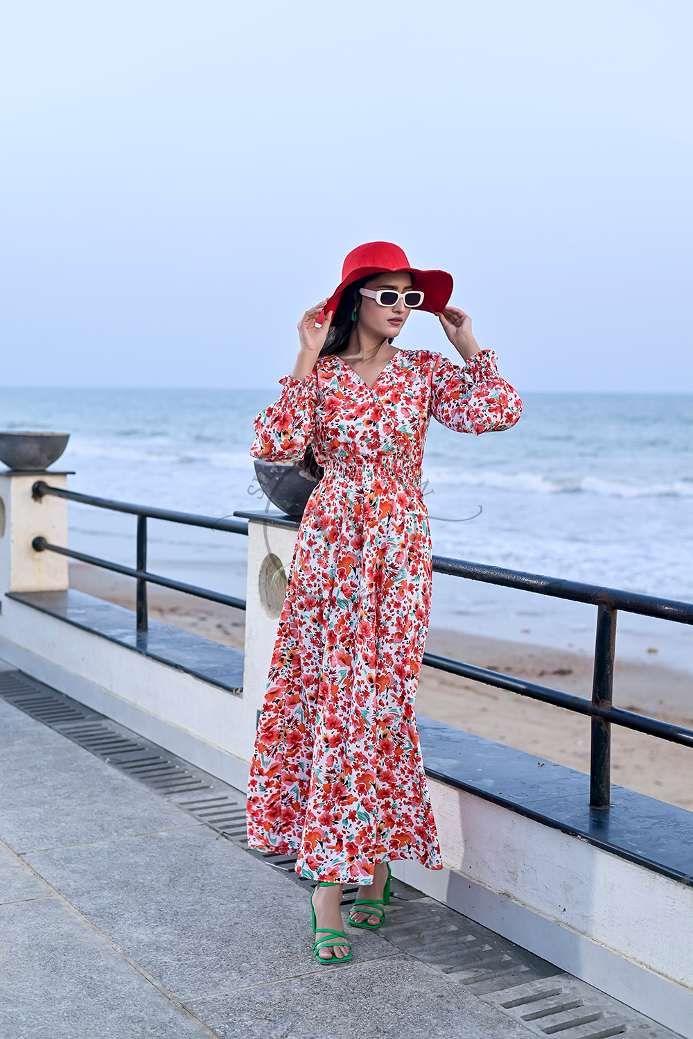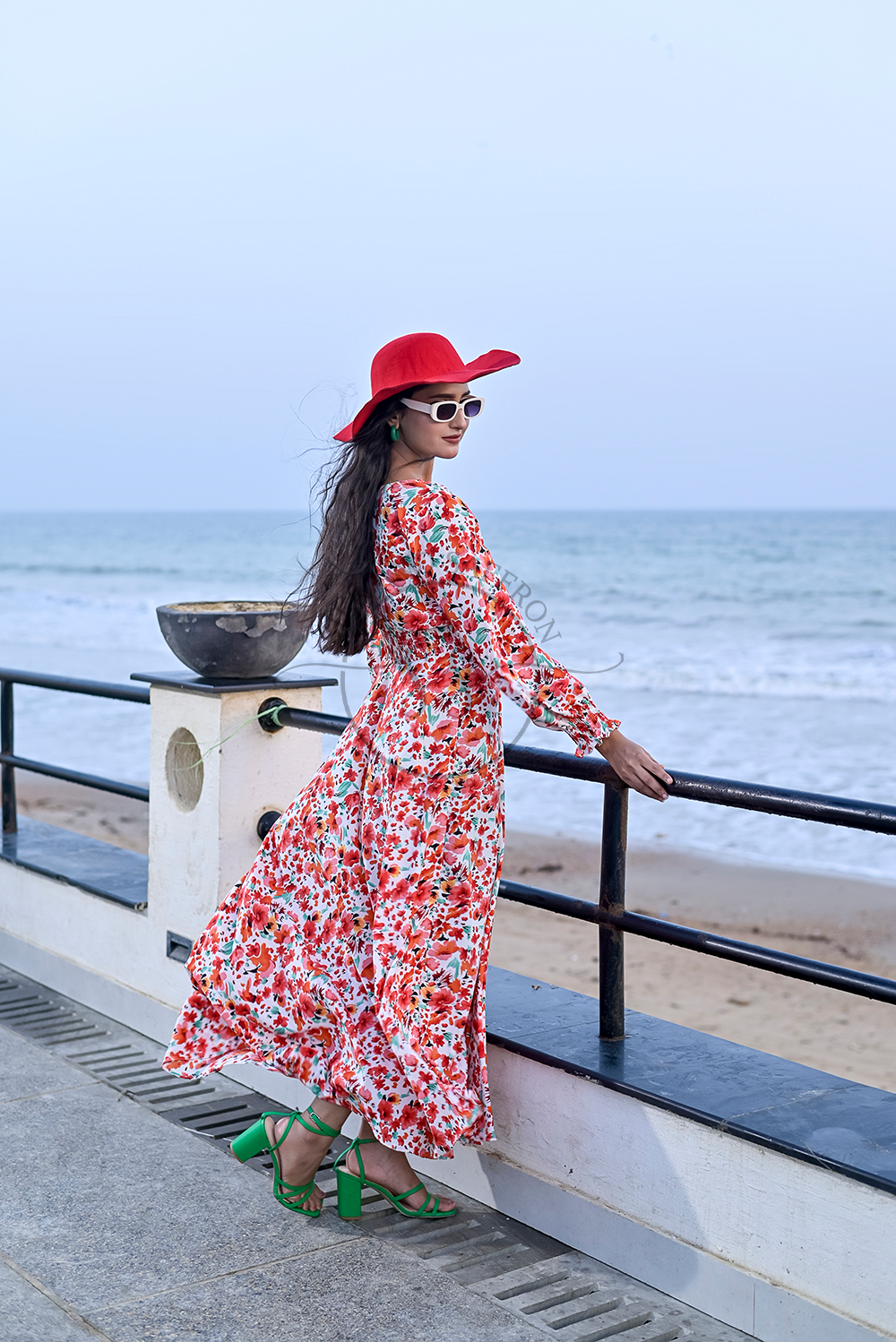 Design: A vivacious maxi dress adorned with a striking and colorful floral print that evokes a field of blooming flowers. It features a flattering V-neckline and a flowing, full-length skirt that sways with every movement.