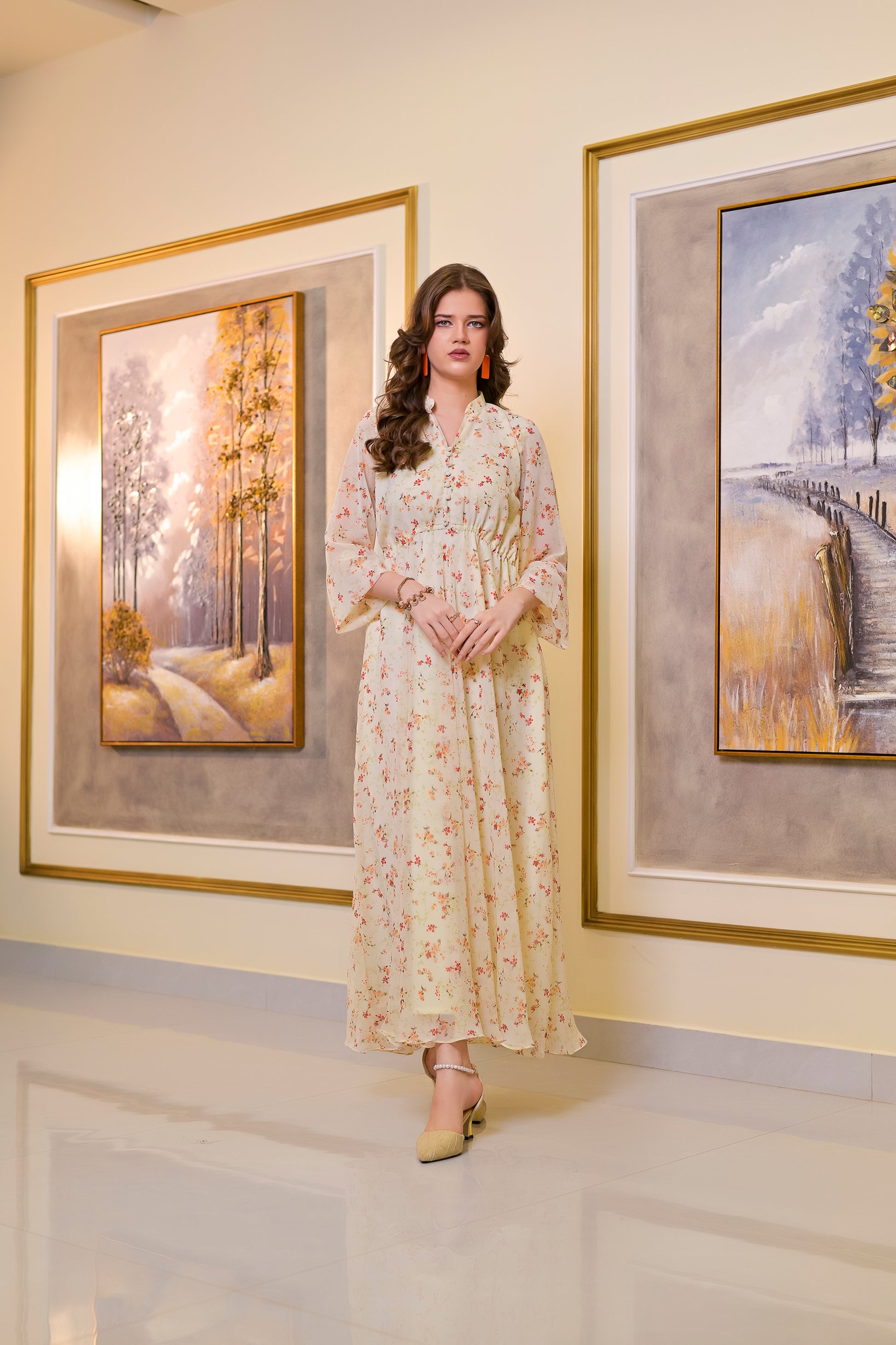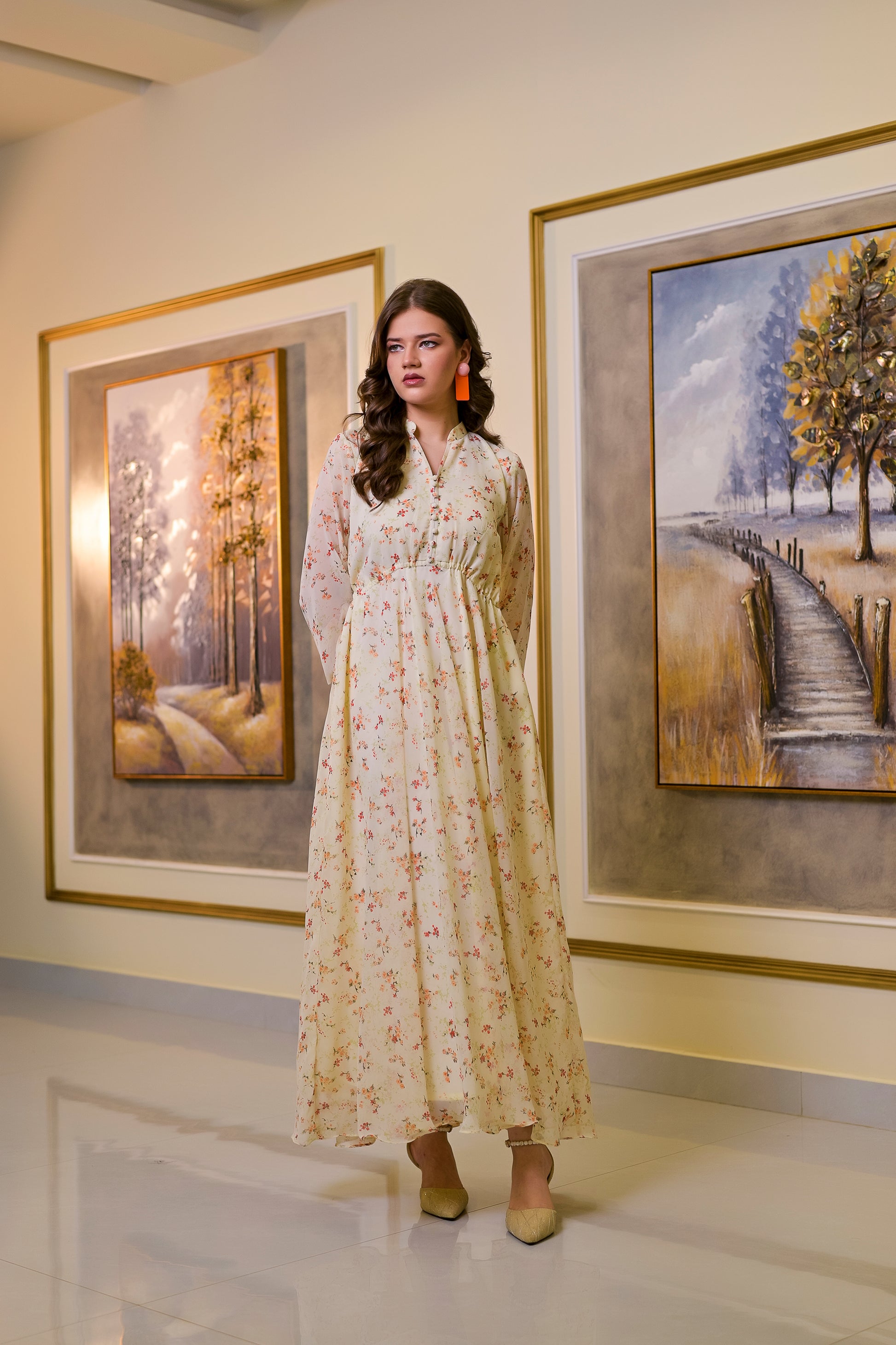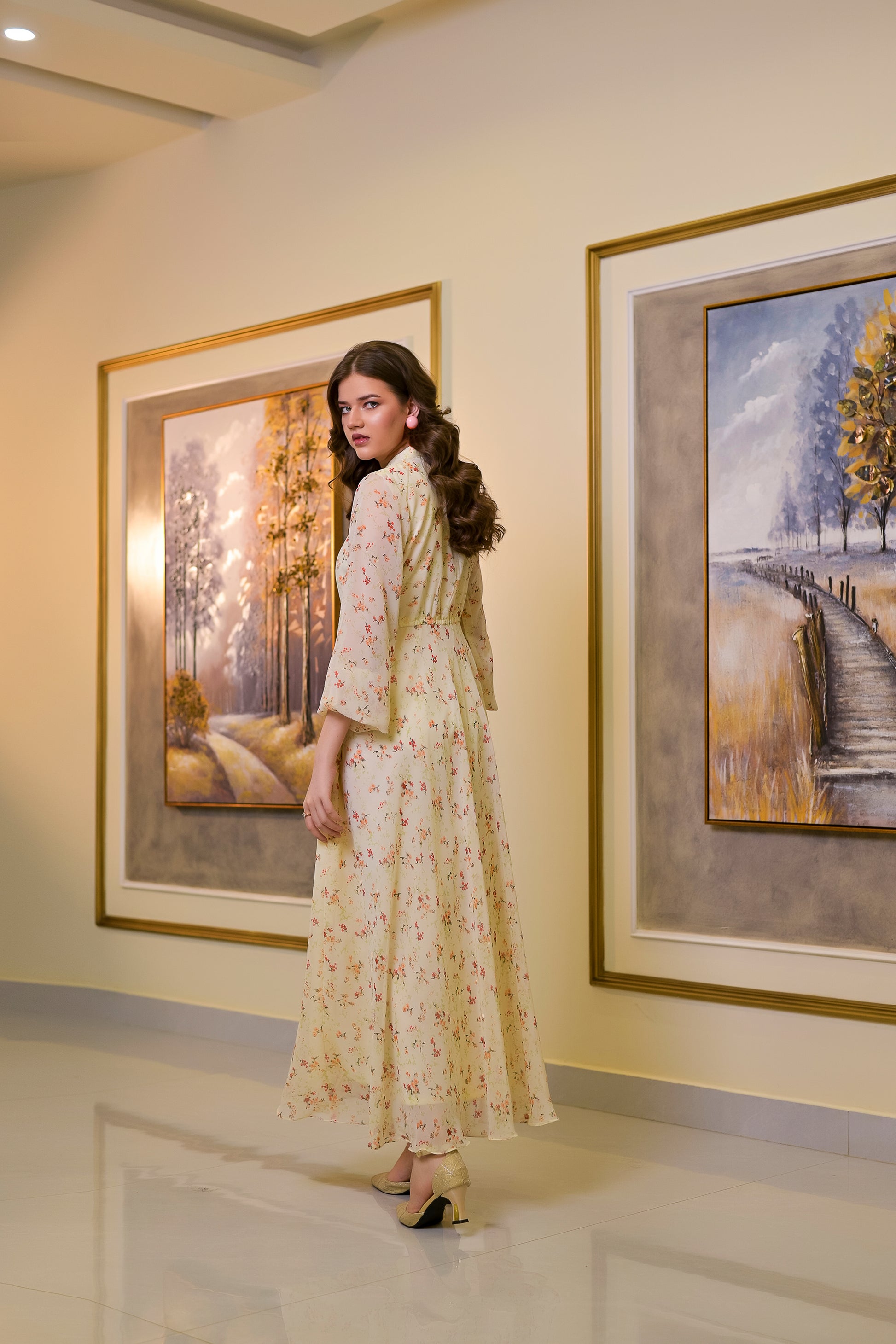 This navy chiffon maxi decorated with subtle botanical prints is a vision of quiet elegance. With its flowy sleeves and airy drape, it’s as comfortable as it is stylish. Rose Whisper is that versatile piece you’ll reach for, whether it’s a casual dinner, an outing with friends, or a light formal event.