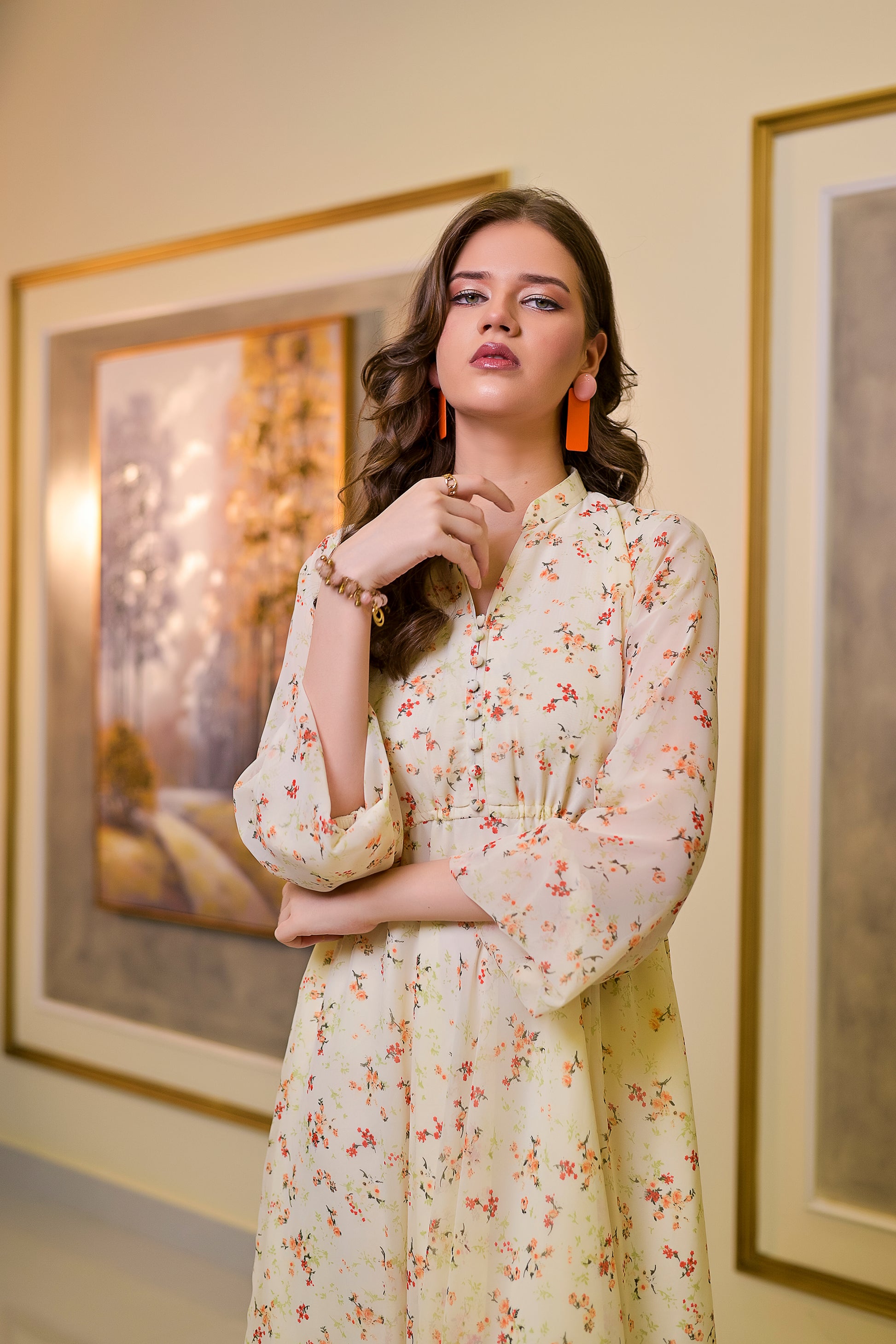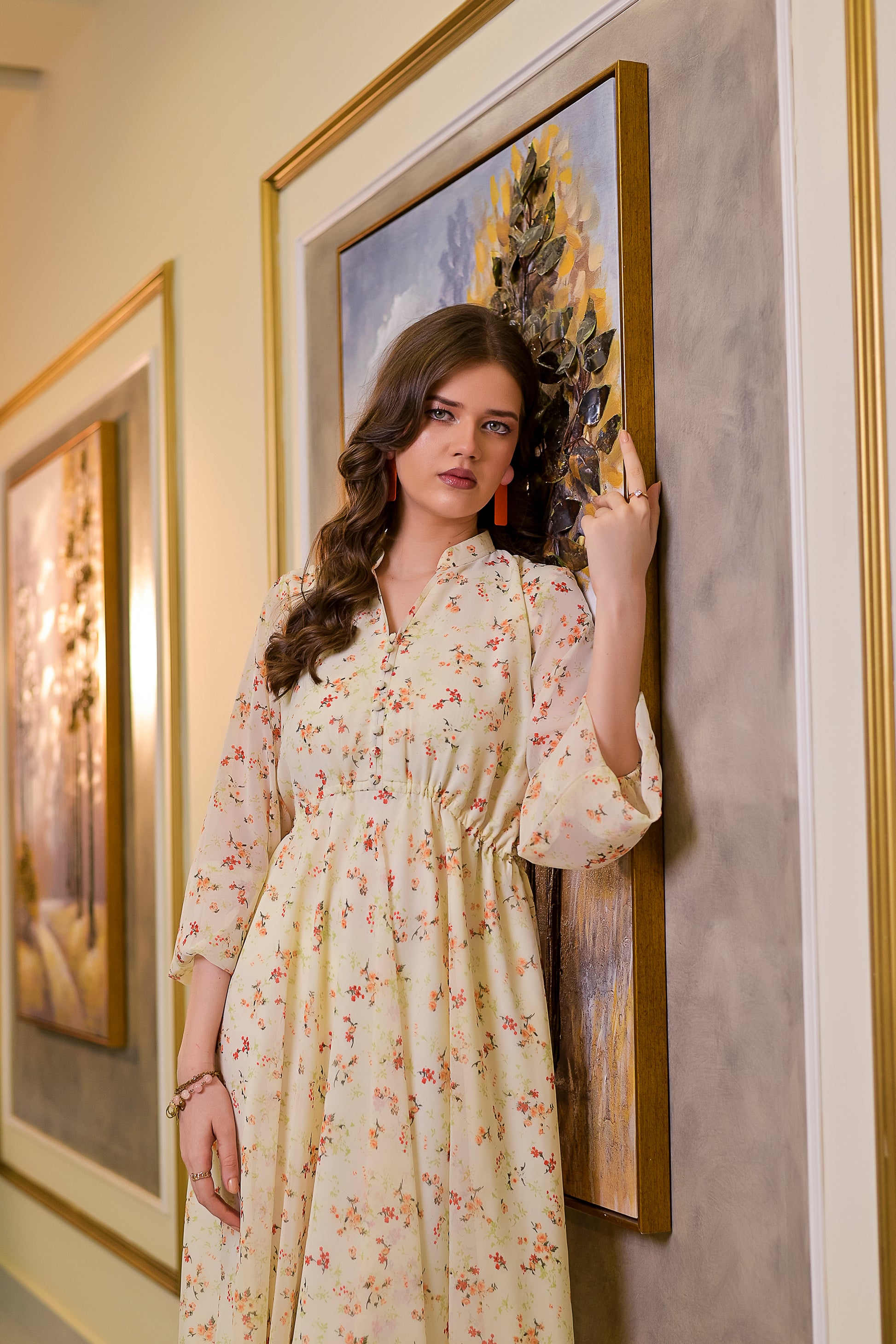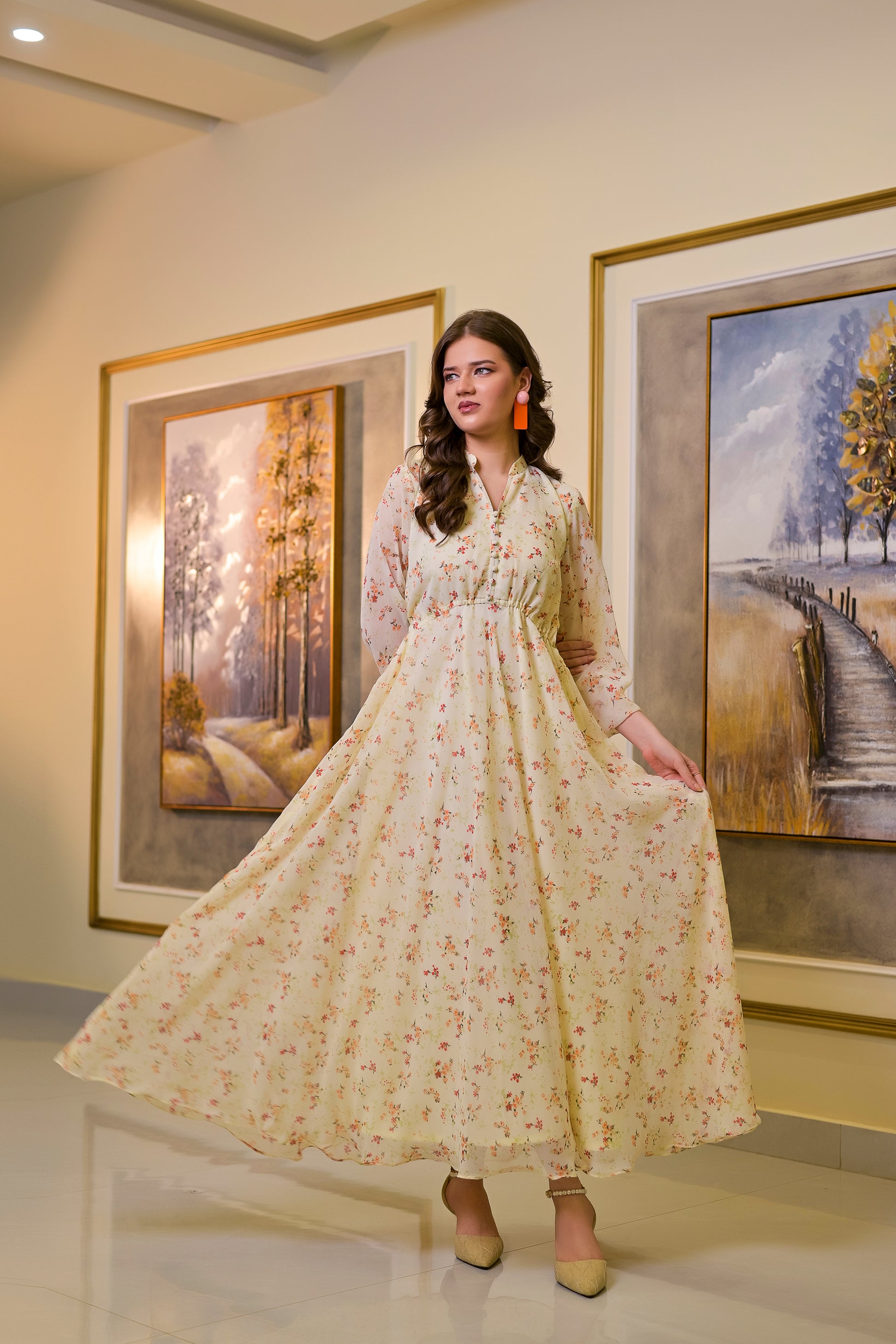 This navy chiffon maxi decorated with subtle botanical prints is a vision of quiet elegance. With its flowy sleeves and airy drape, it’s as comfortable as it is stylish. Rose Whisper is that versatile piece you’ll reach for, whether it’s a casual dinner, an outing with friends, or a light formal event.