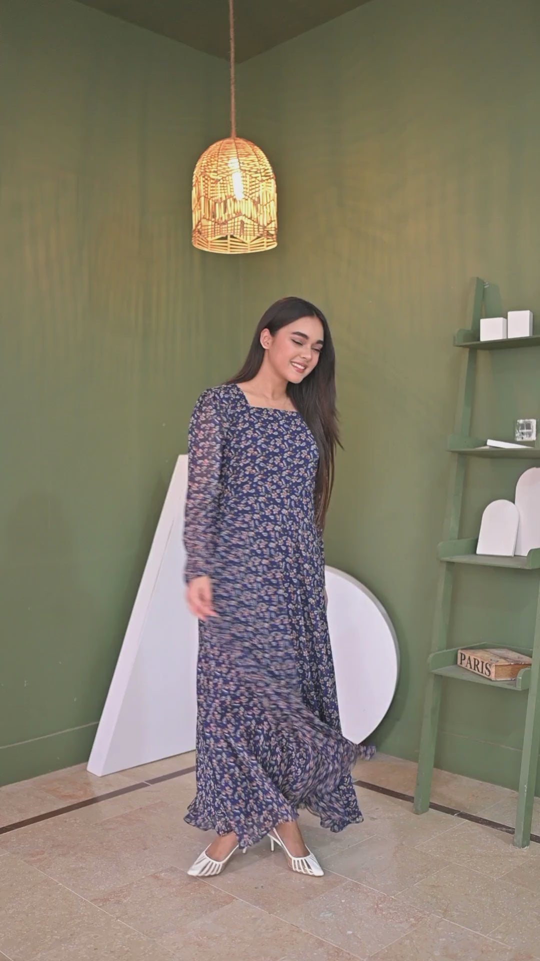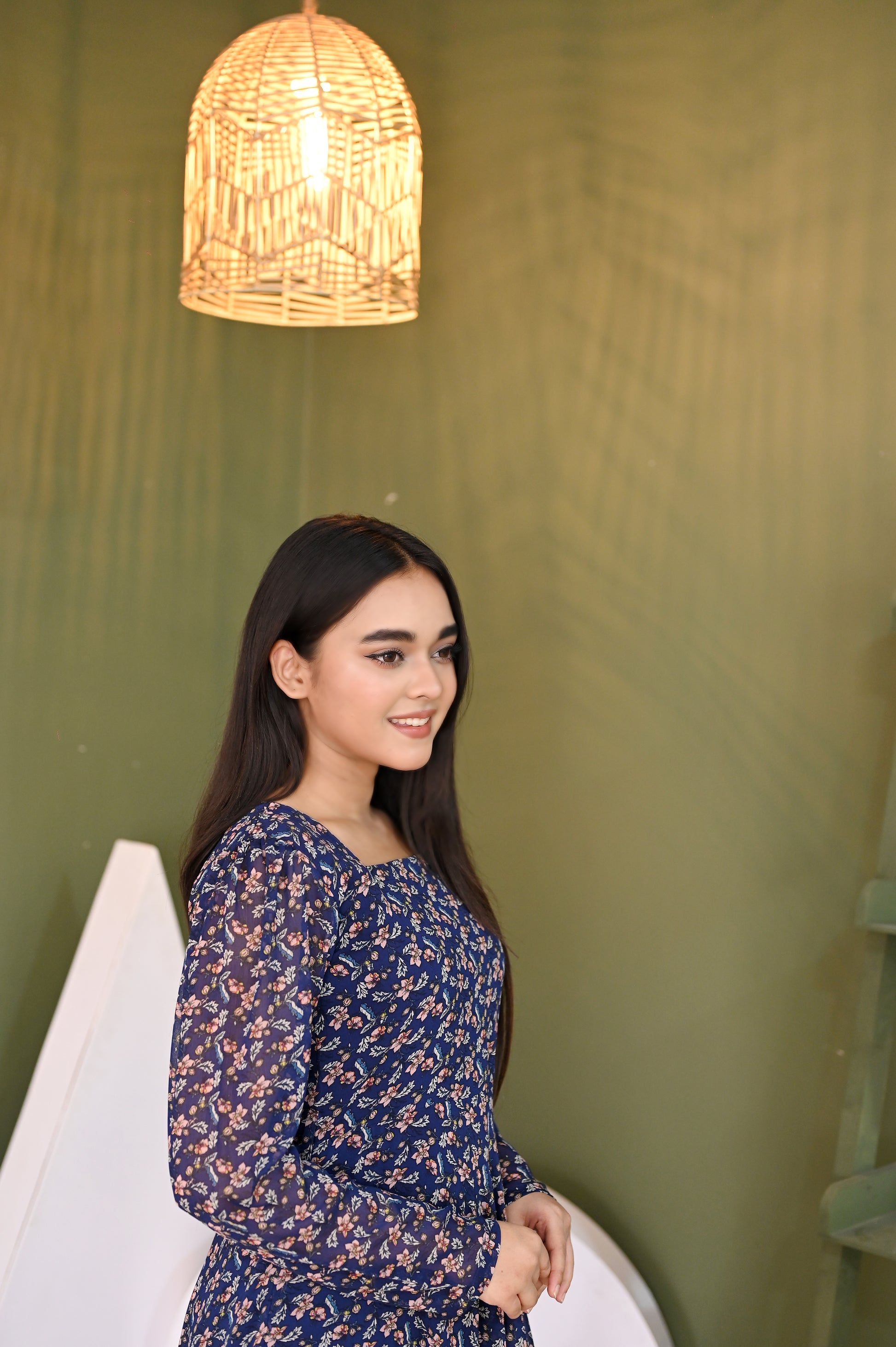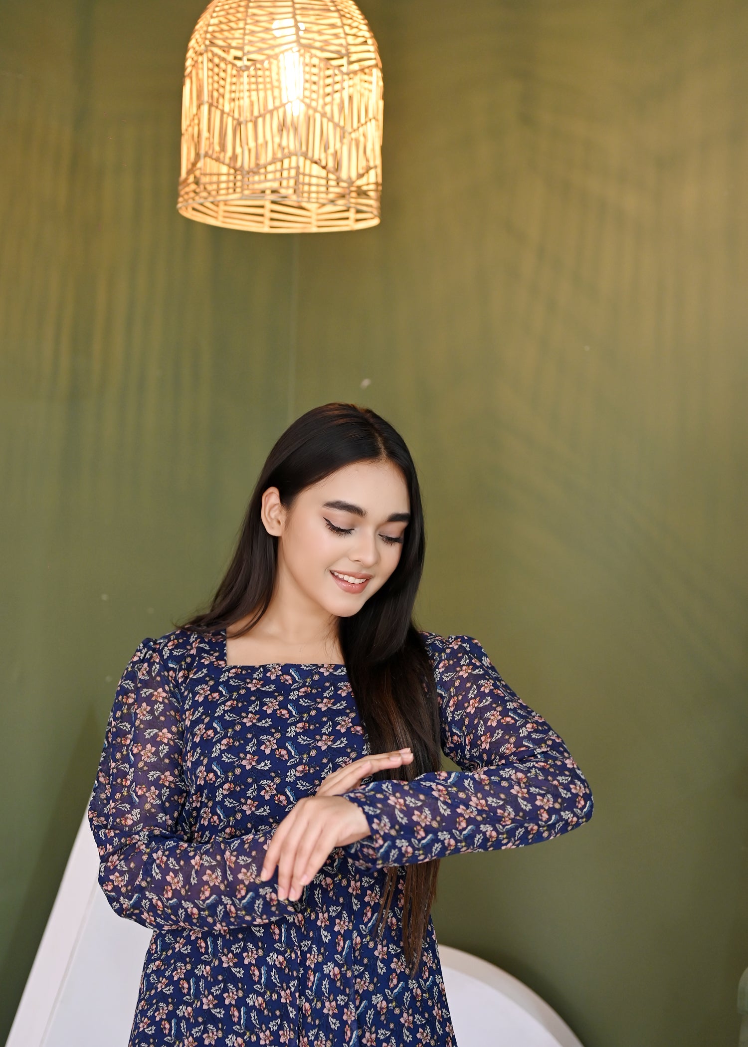 Color Palette: A deep navy base adorned with dainty floral patterns in soft hues, making it perfect for both casual and formal outings.