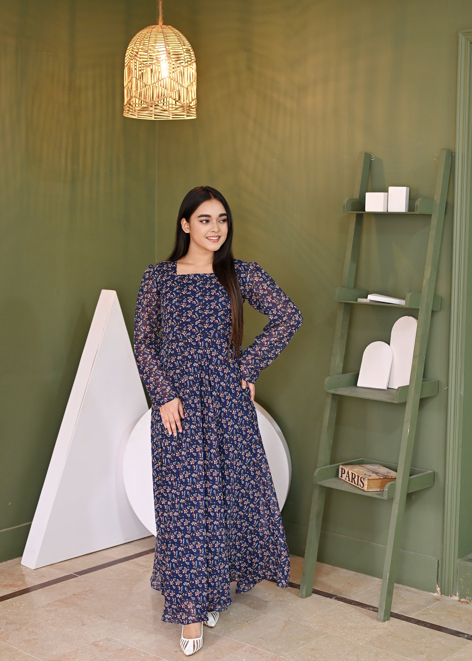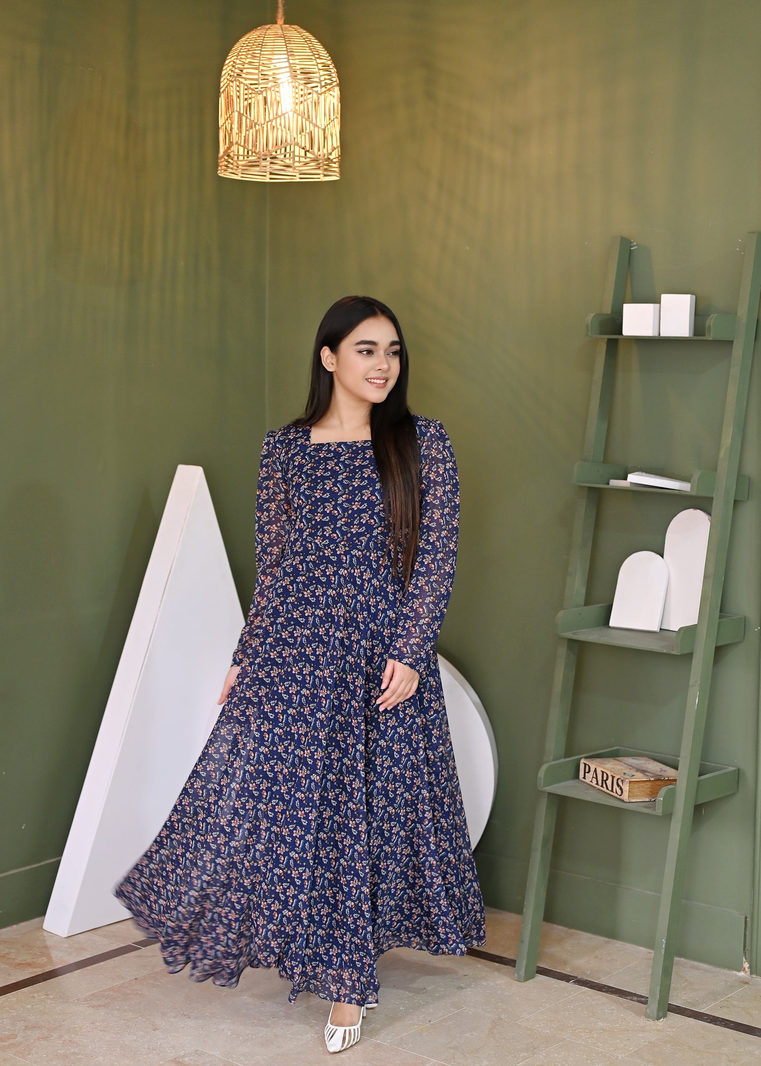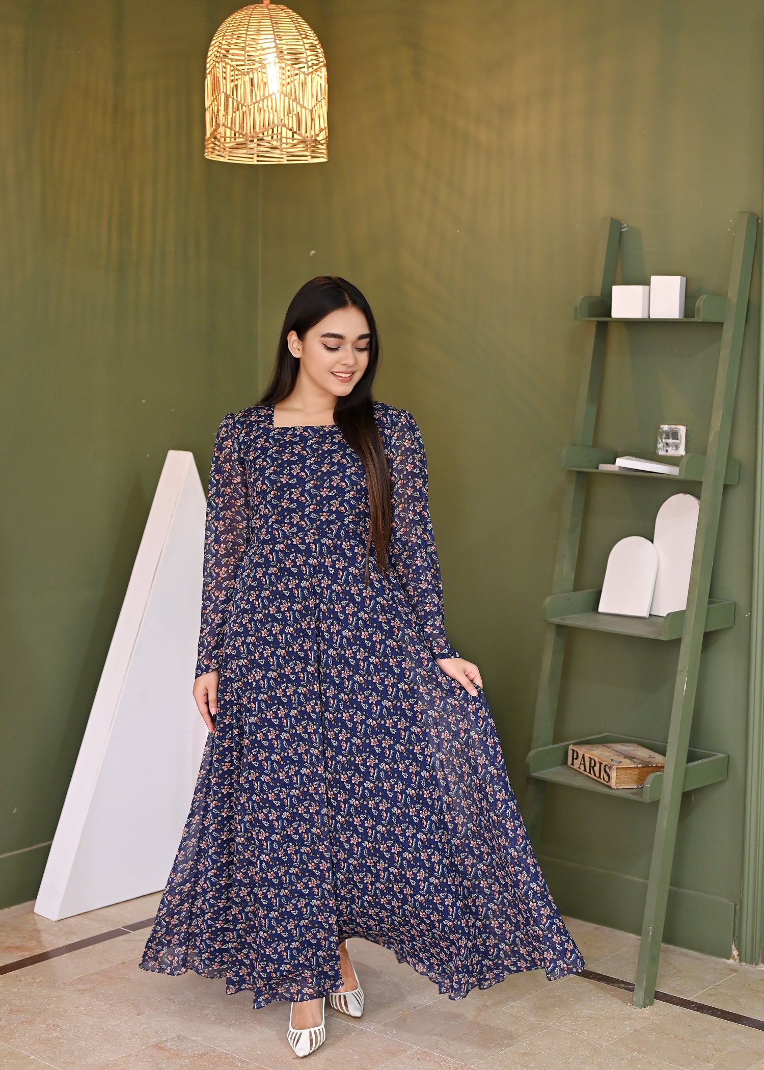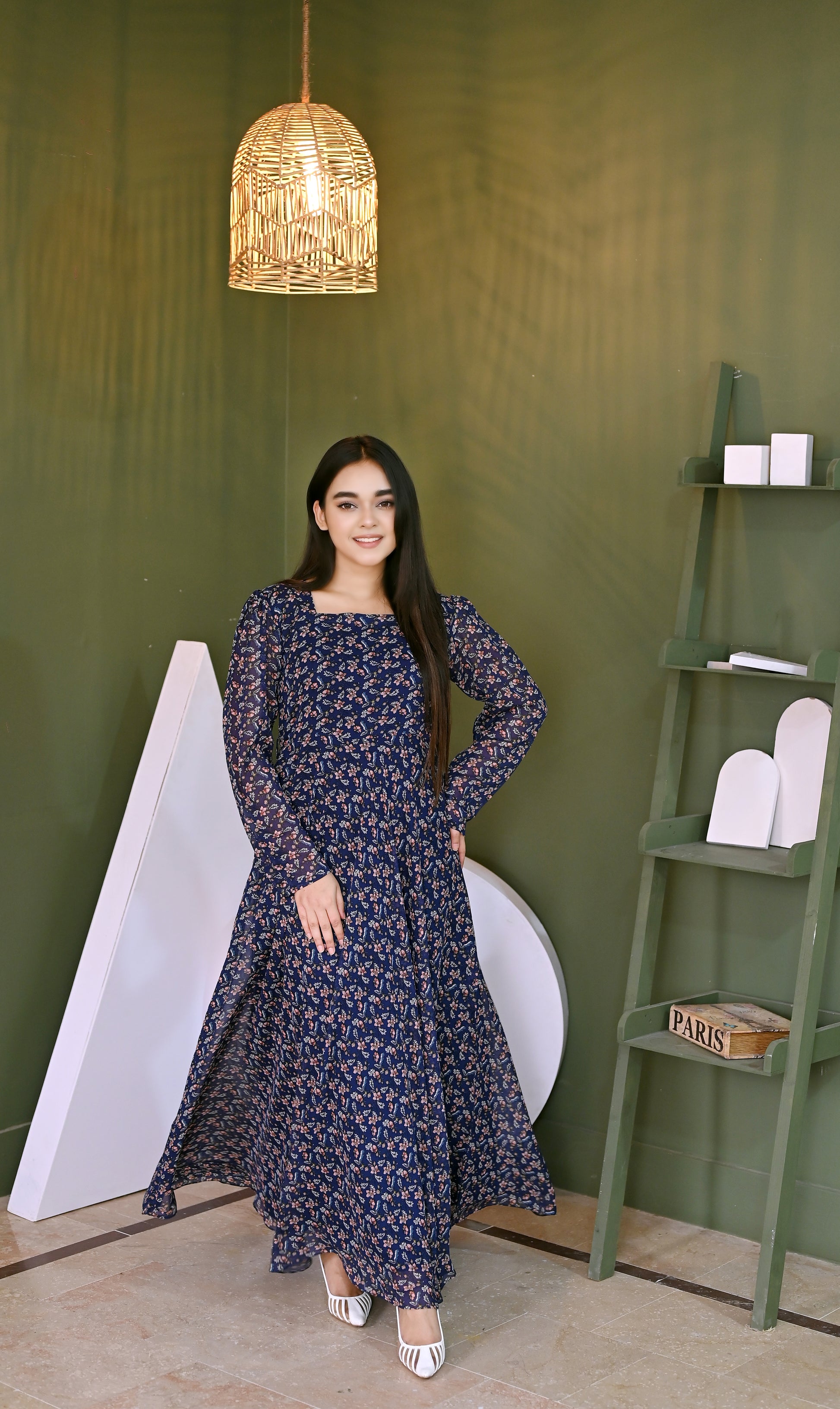 Color Palette: A deep navy base adorned with dainty floral patterns in soft hues, making it perfect for both casual and formal outings.