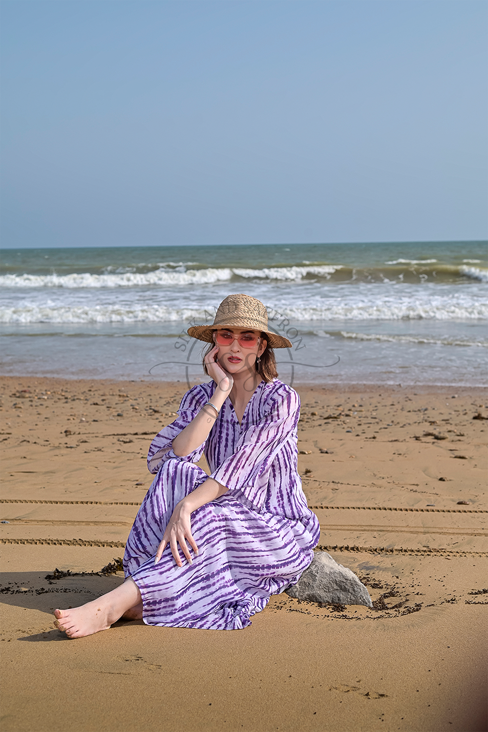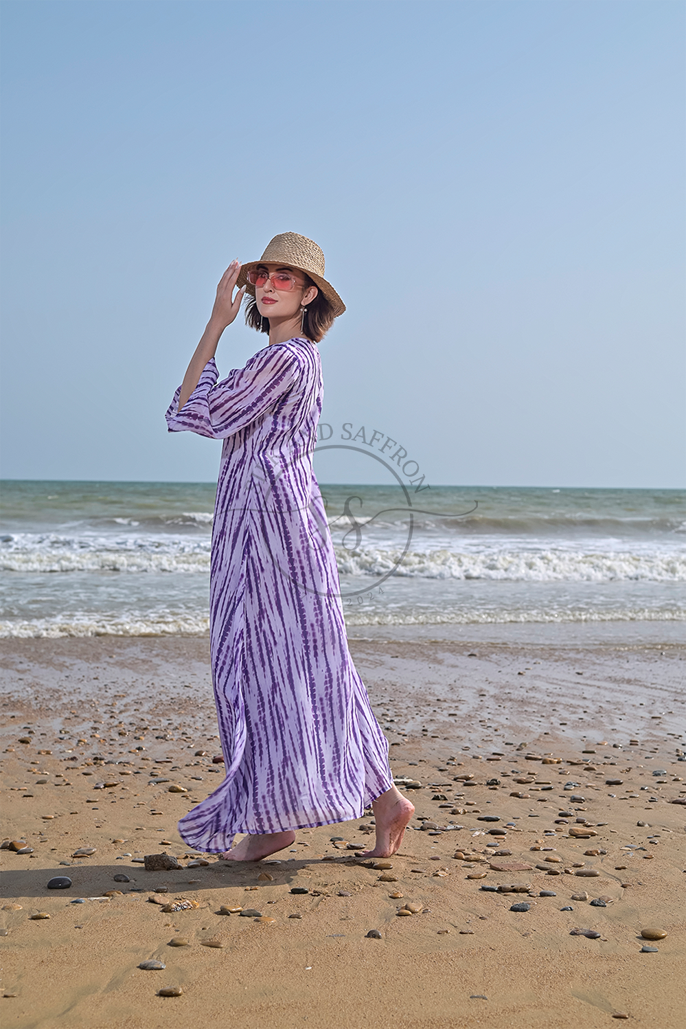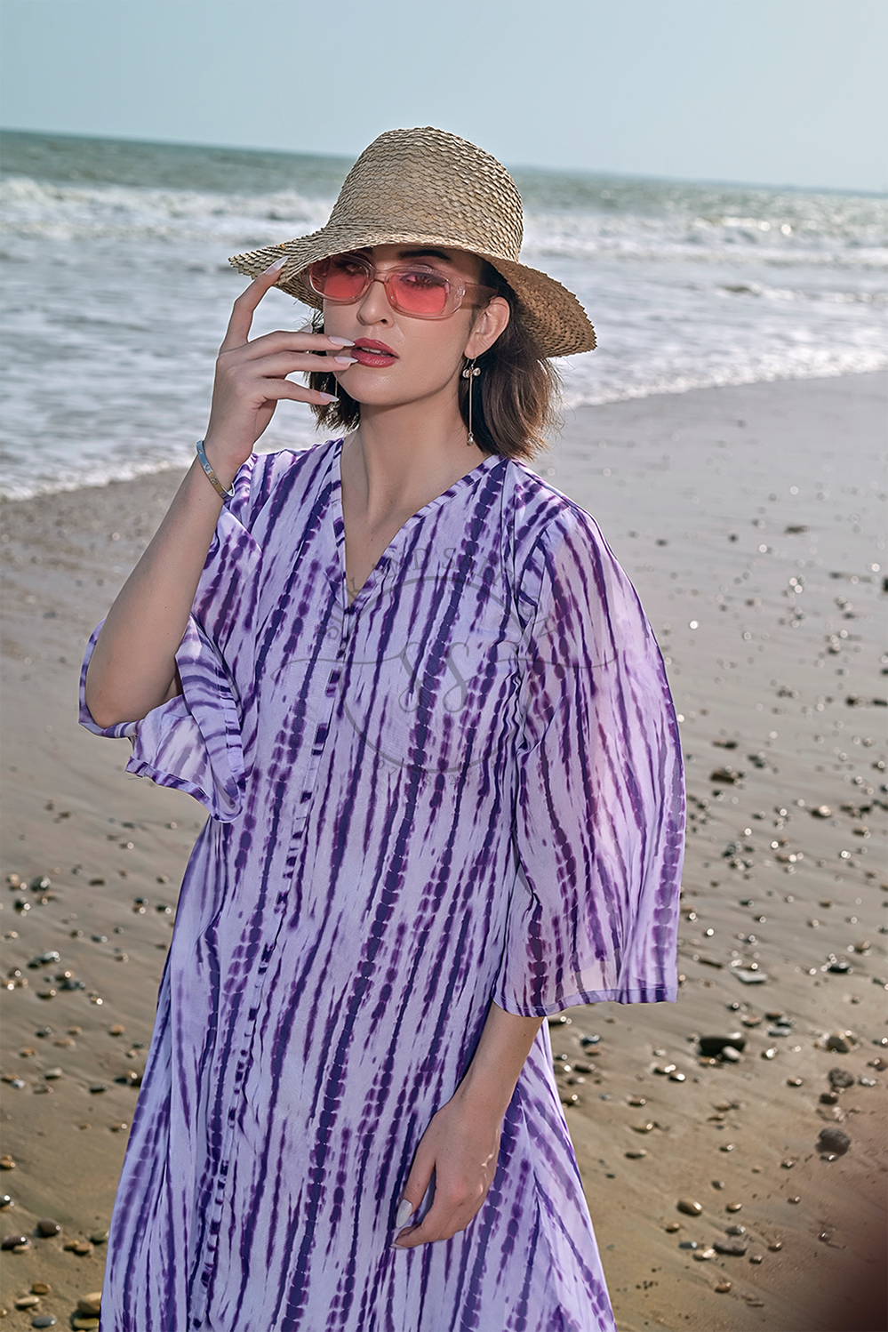 Design: A breezy V-neck kaftan featuring a vibrant tie-dye print, perfect for beachside elegance.