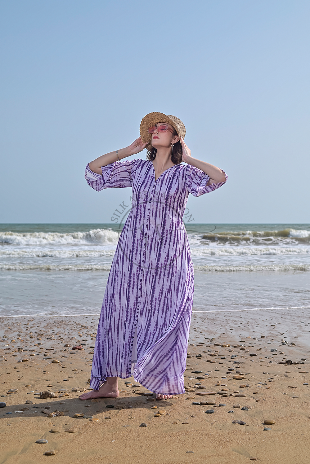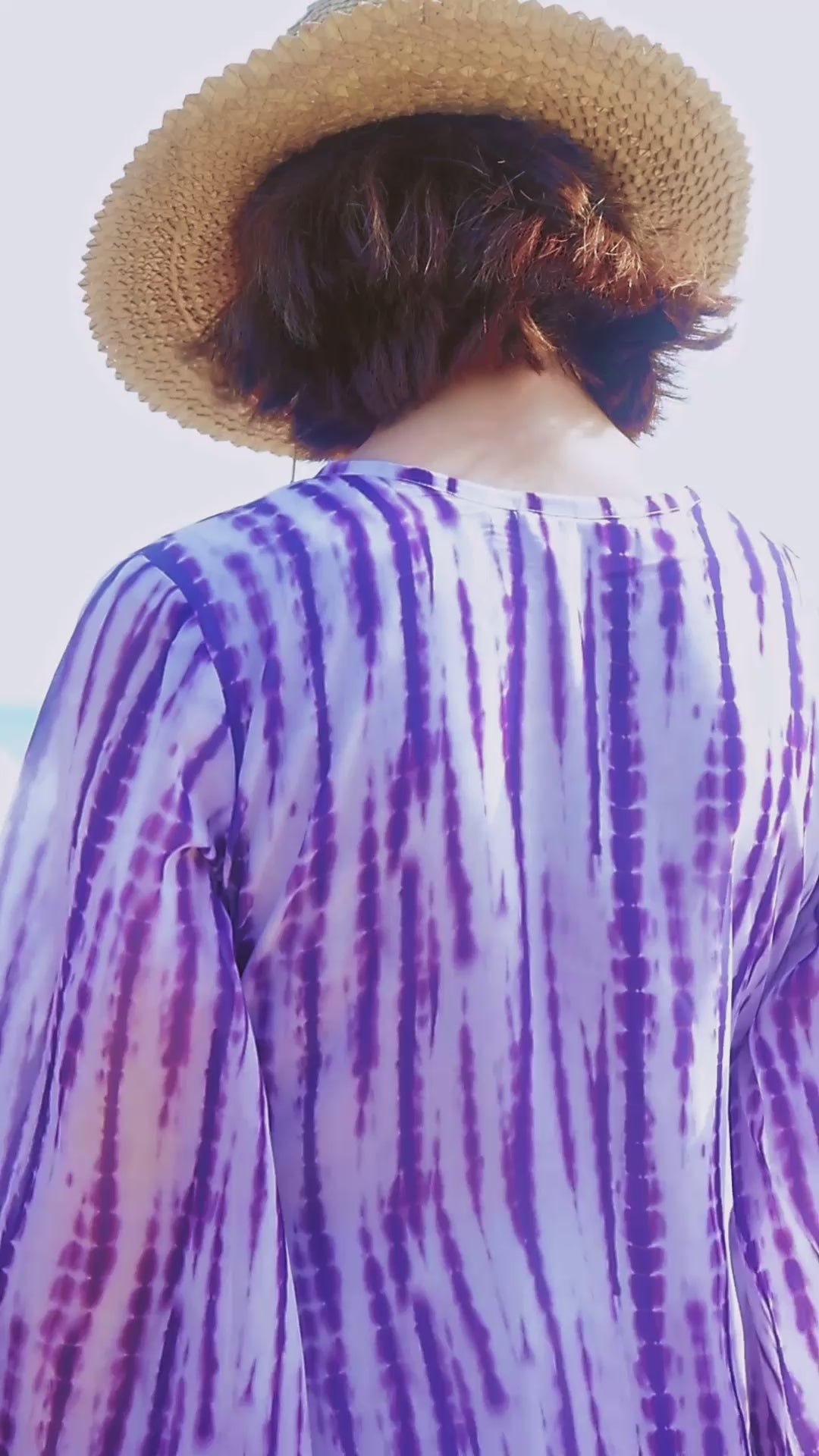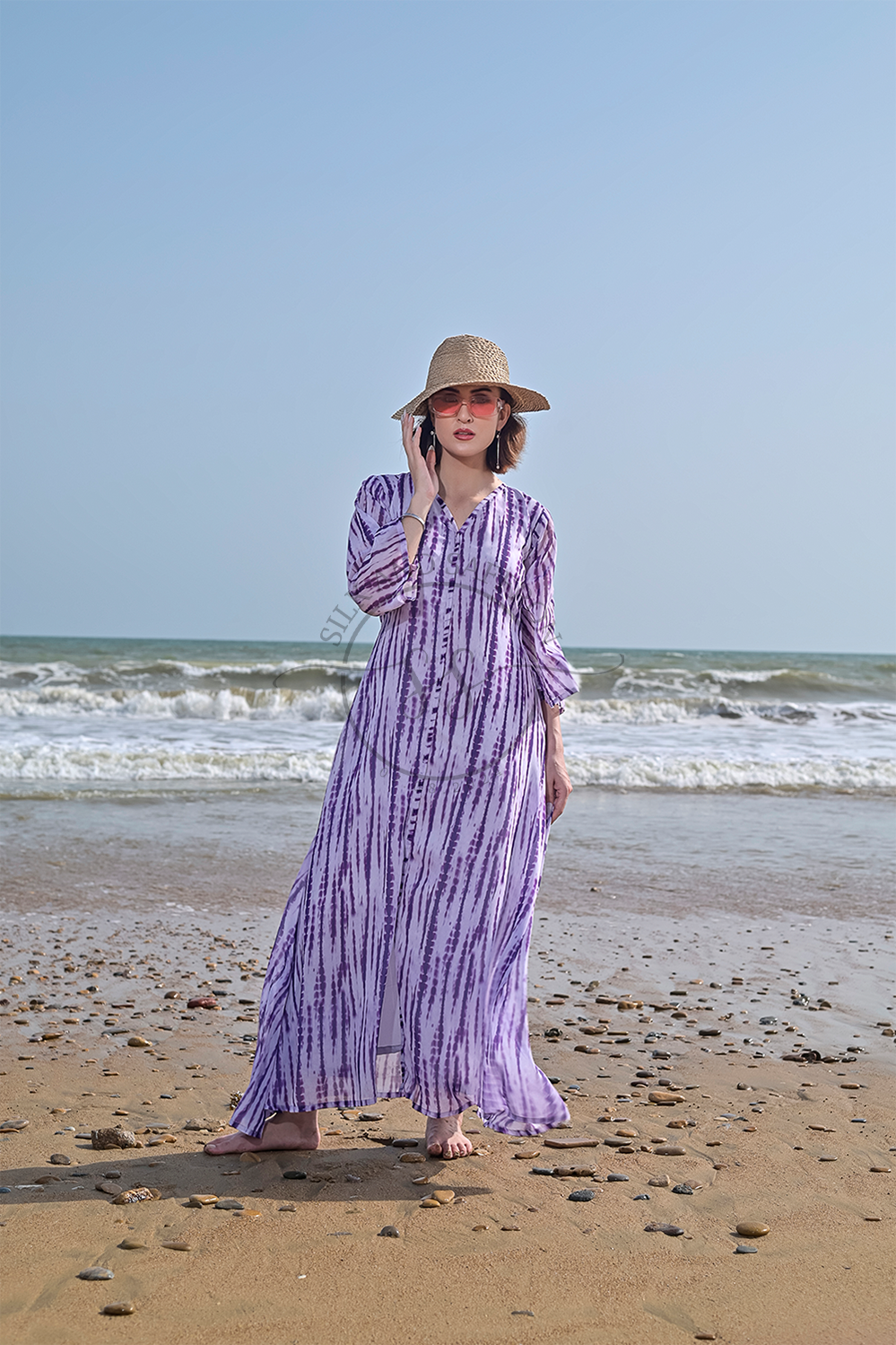 Design: A breezy V-neck kaftan featuring a vibrant tie-dye print, perfect for beachside elegance.